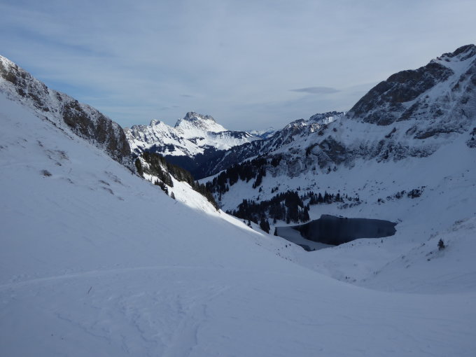 Durchgehend Schnee vorhanden. Unten hart gepresst, Gipfelhang abgeblasen, aber ebenfalls geschlossene Schneedecke. Vom Gipfelgrat bis zum Lac Lioson Pulverschnee und Abfahrt ohne Steinkontakte. Auf dem Gipfel starker SW-Wind. Abfahrt über NW-Seite und Vers les Lacs ist weniger gut, aber noch möglich. Viele Leute am Berg.