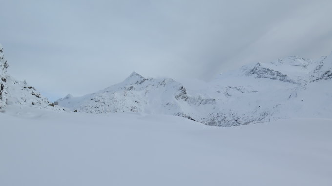 Temperatur bei Start gerade mal -01°C, Schneeverhältnisse am Morgen ab Passhöhe gut ca. 40cm Neuschnee (ohne feste Unterlage), gegen oben zunehmend. Bei der Abfahrt ab einer Höhe von ca. 2200m wurde der Schnee schon feucht aber noch gut Fahrbar.
