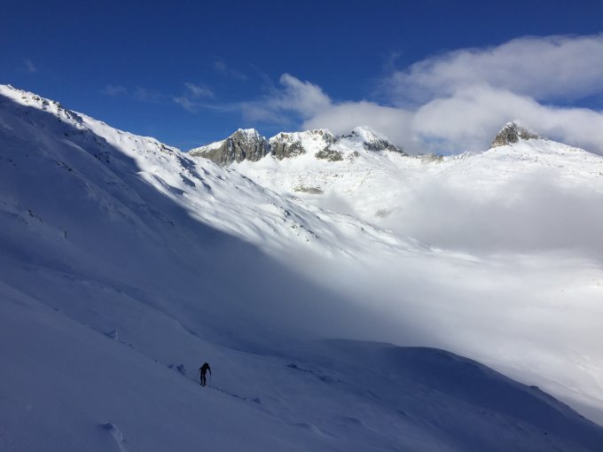Besser als erwartet: bis 2200m eher wenig Schnee (abgeblasen) darüber tragende, windgepresste Oberfläche. Es ist schon ein bisschen 'Slalom' un die Steine herum notwendig. Es finden sich jedoch genügend weissee Flächen für eine einigermassen genussvolle Abfahrt. Oberhalb 2500m wirklich cool. Ein bisschen Powder. Fazit: Tour gut machbar- mit Spass!