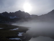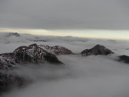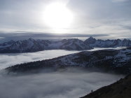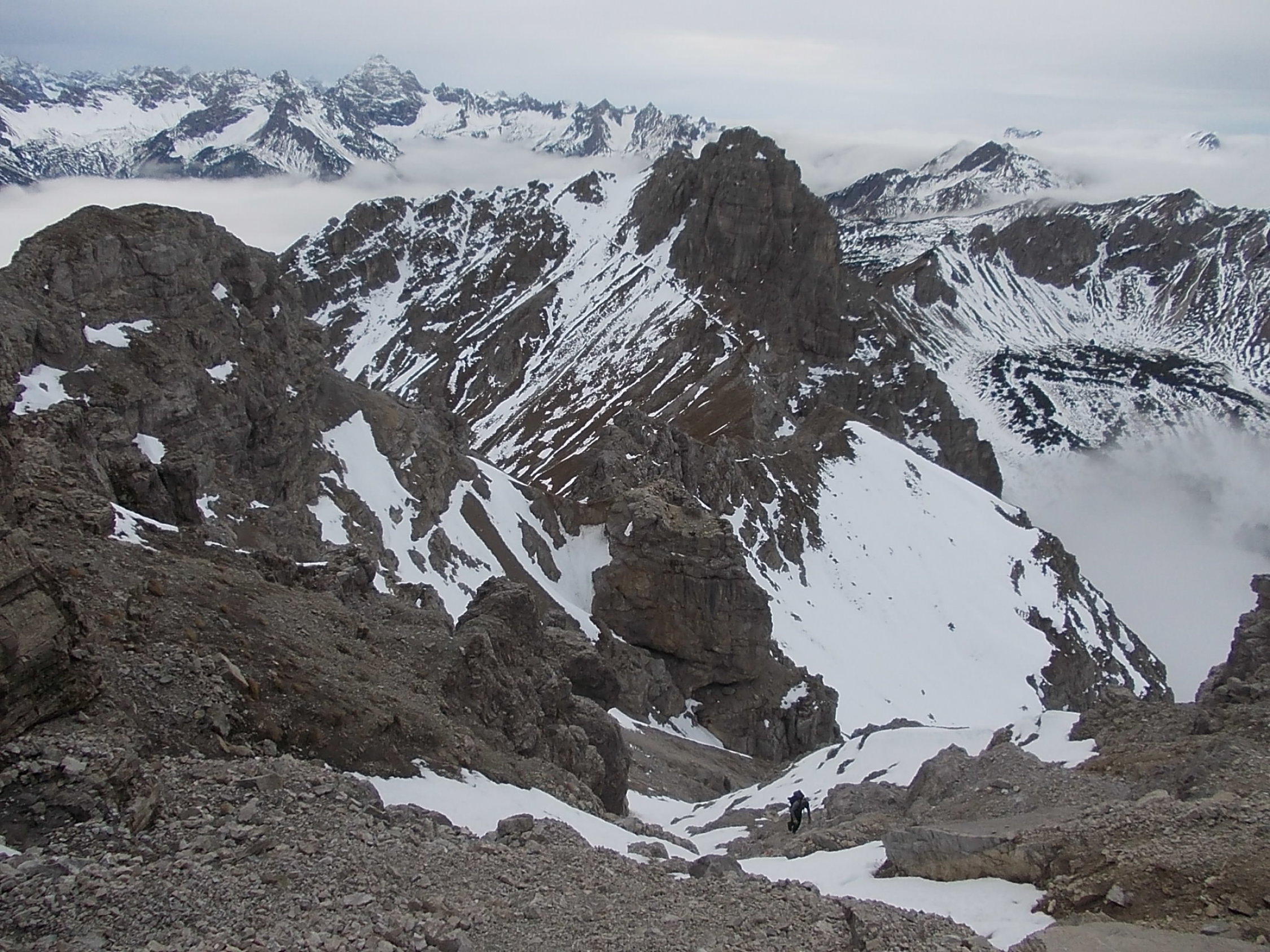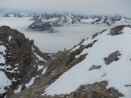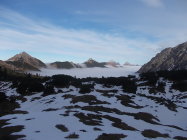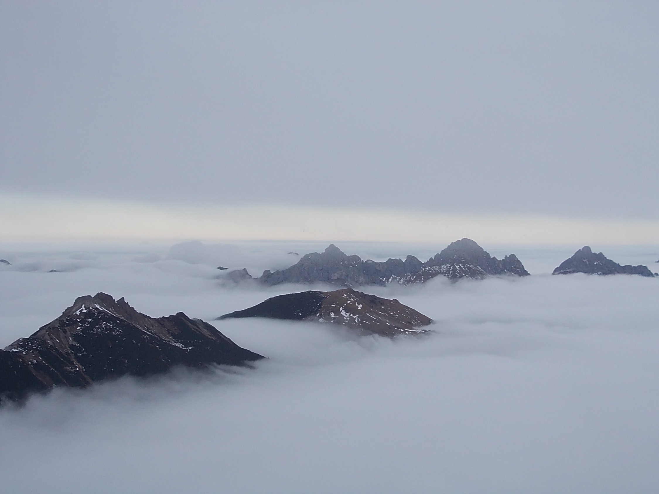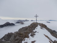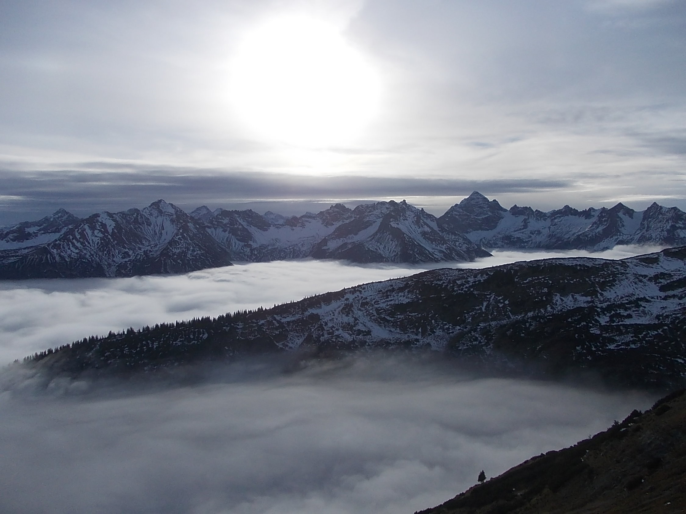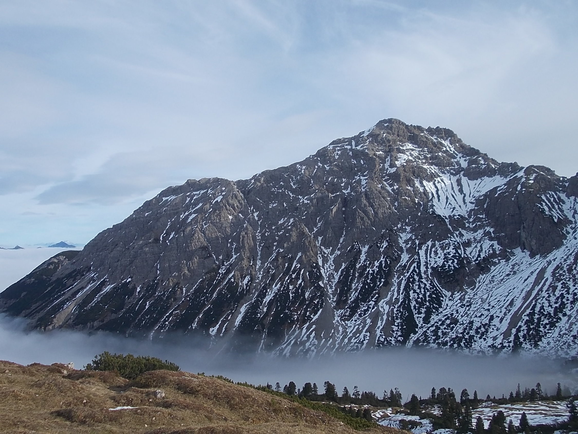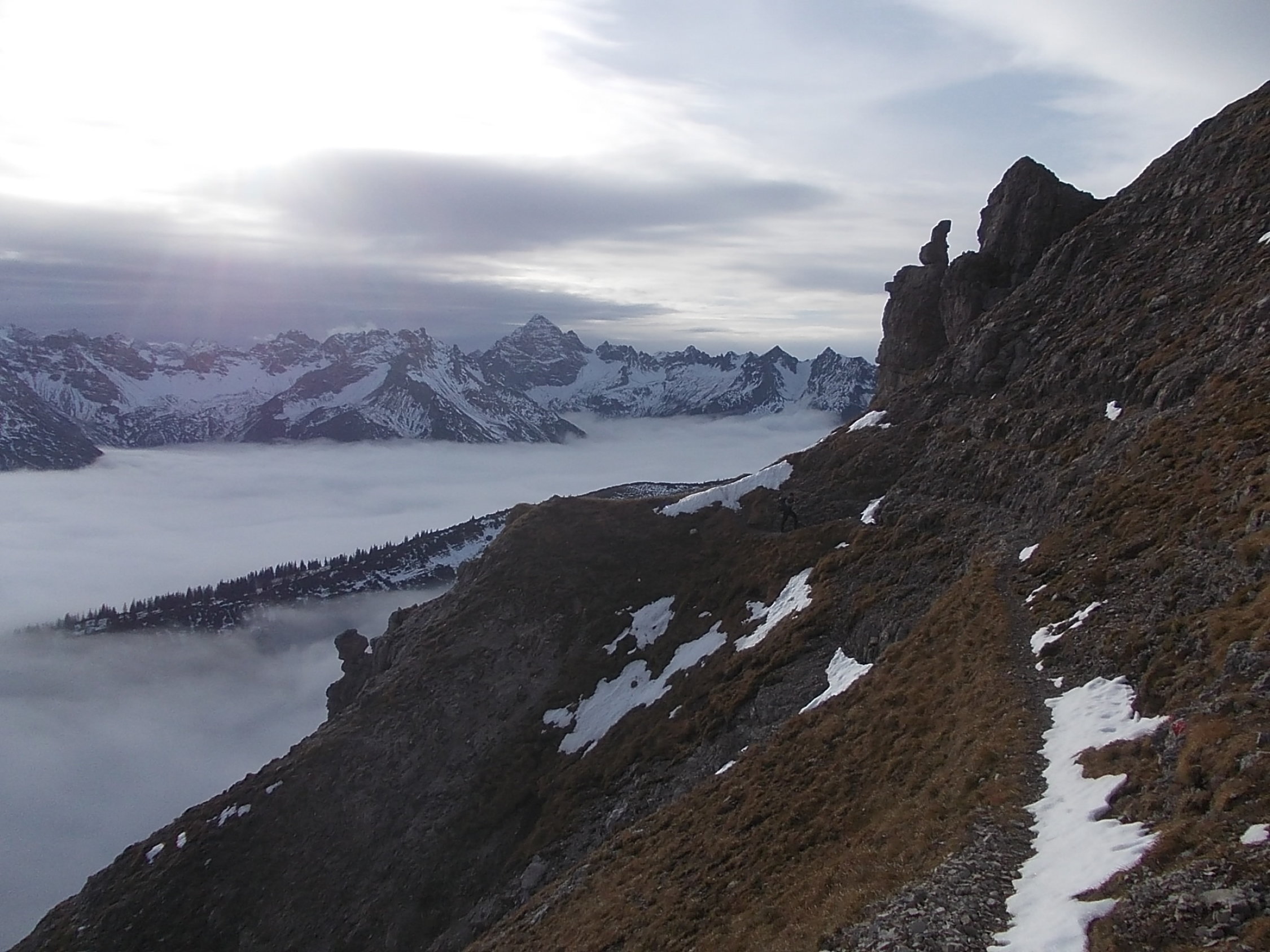 Ab der Traualpe durchbrachen wir die Hochnebeldecke. Von da ab zunächst einmal sonnig und mild. Noch im Aufstieg zum ersten Sattel konnten wir beobachten, wie der Hochnebel nun auch die Landsberger Hütte erfasste. In der Fortsetzung zeigte der Hochnebel weiterhin aufsteigende Tendenzen. Schließlich gesellten sich auch mehr hohe Wolken hinzu, der Tag endete somit nicht mehr gar so sonnig, doch herrliche Ausblicke über die aus der Nebeldecke herausstechenden Gipfel blieben uns erhalten.