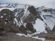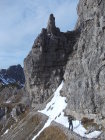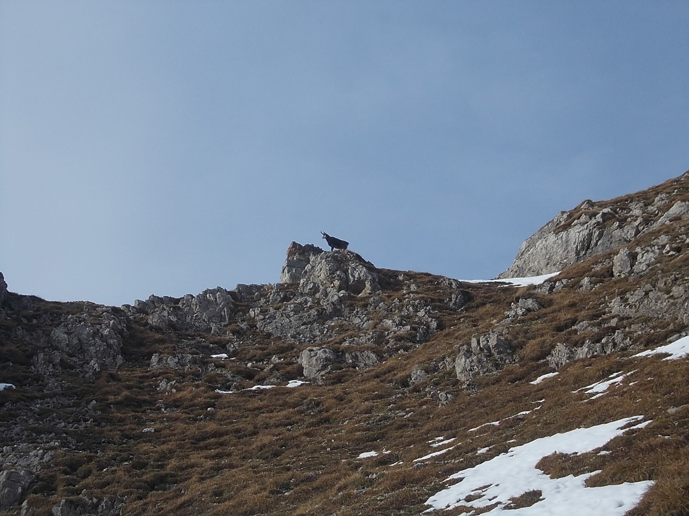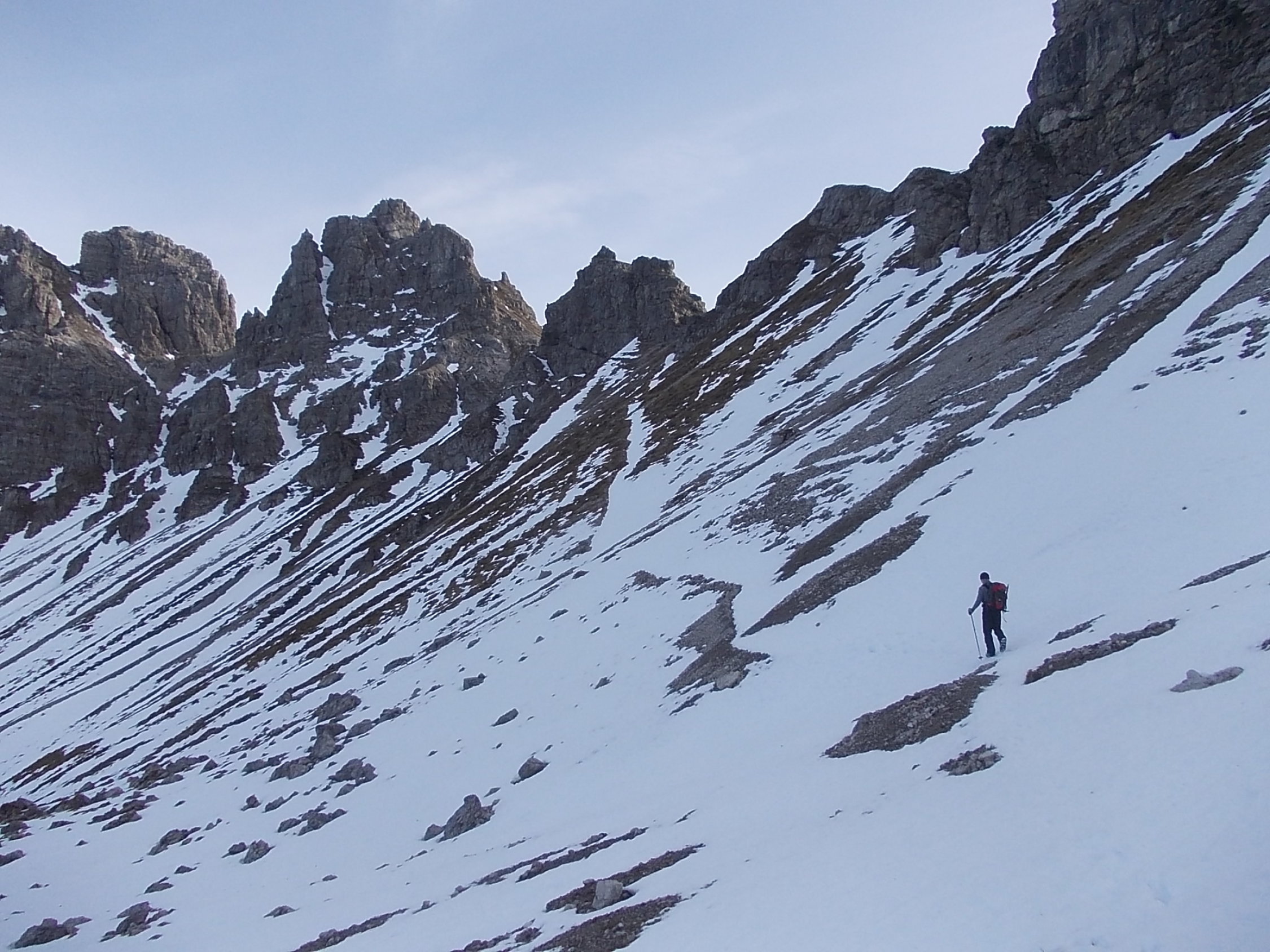 Die Route zeigte insgesamt einen Wechsel von teils tragendem Schnee, teils kniehohem Einsinken, und auch über weite Strecken entweder komplett aper oder mit nur geringfügig Schnee. Insgesamt ließ sich die Tour gut zu Fuß und ohne Steigeisen machen. Bisweilen taugte aber der Pickel als Stütz- und Sicherungsmittel.