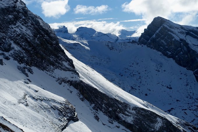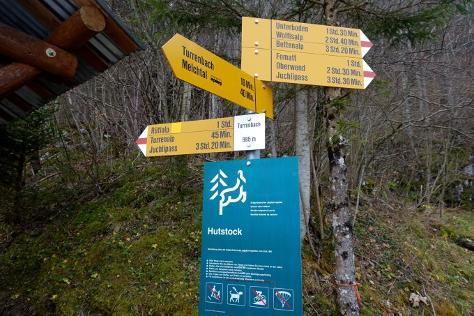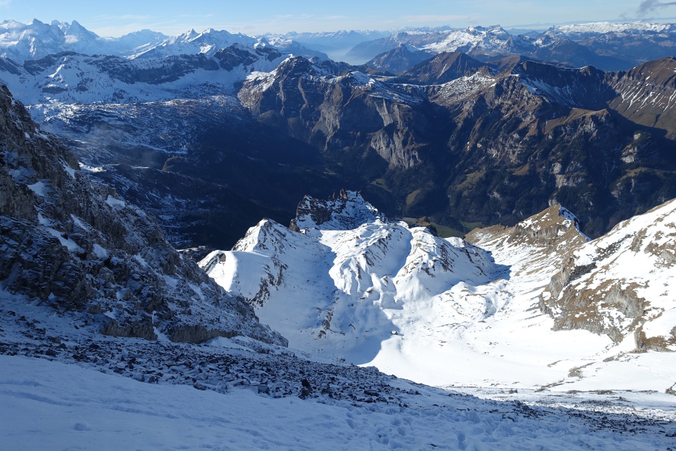 Der frische gefallene Schnee ist bereits heute grösstenteils wieder verschwunden. Da die Skiroute am Huetstock noch nicht lohnend, ist die Begehung der Sommerroute eine Alternative und ein gutes Training.