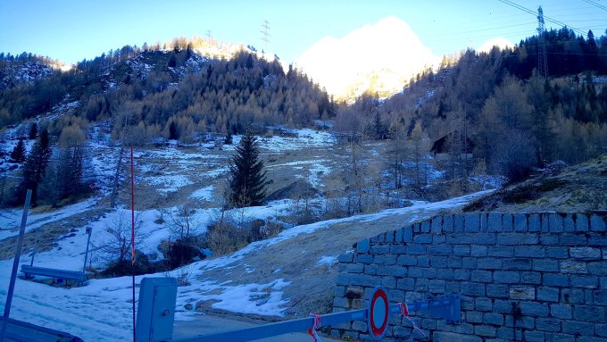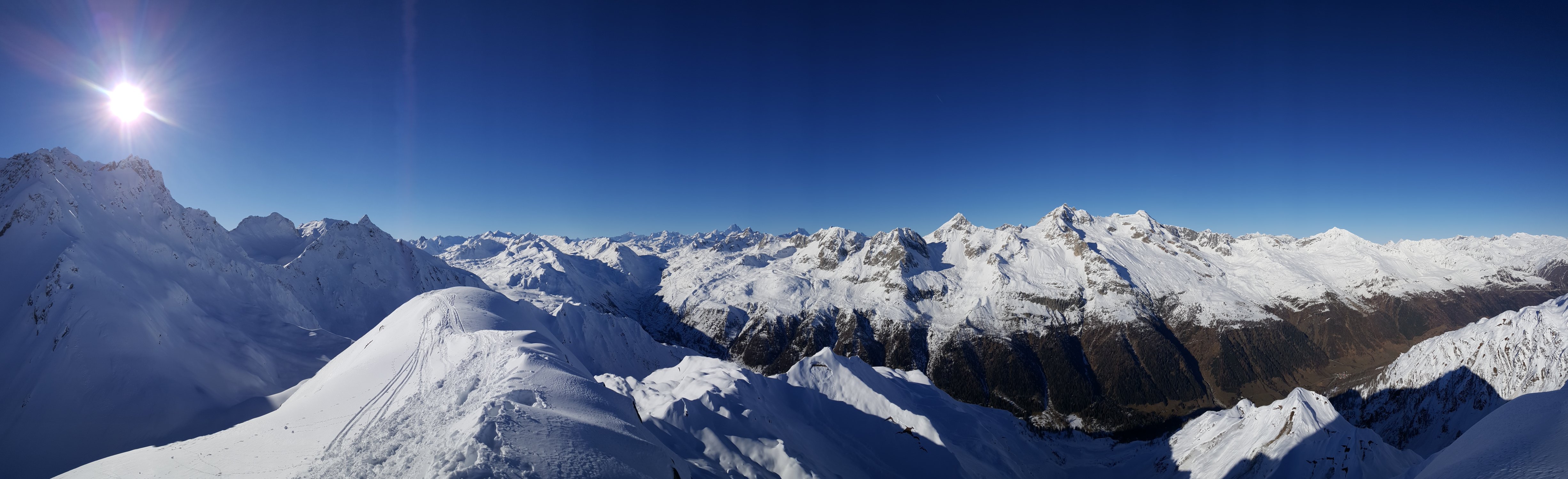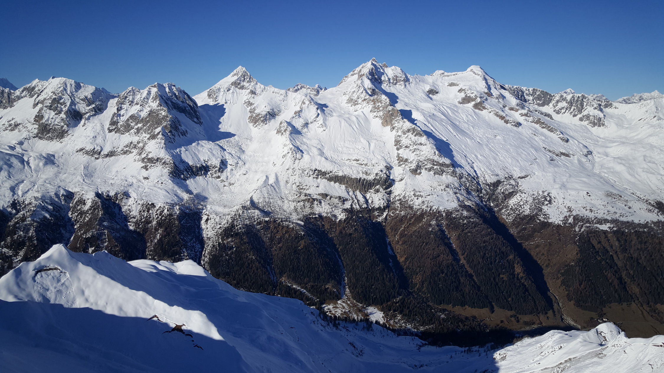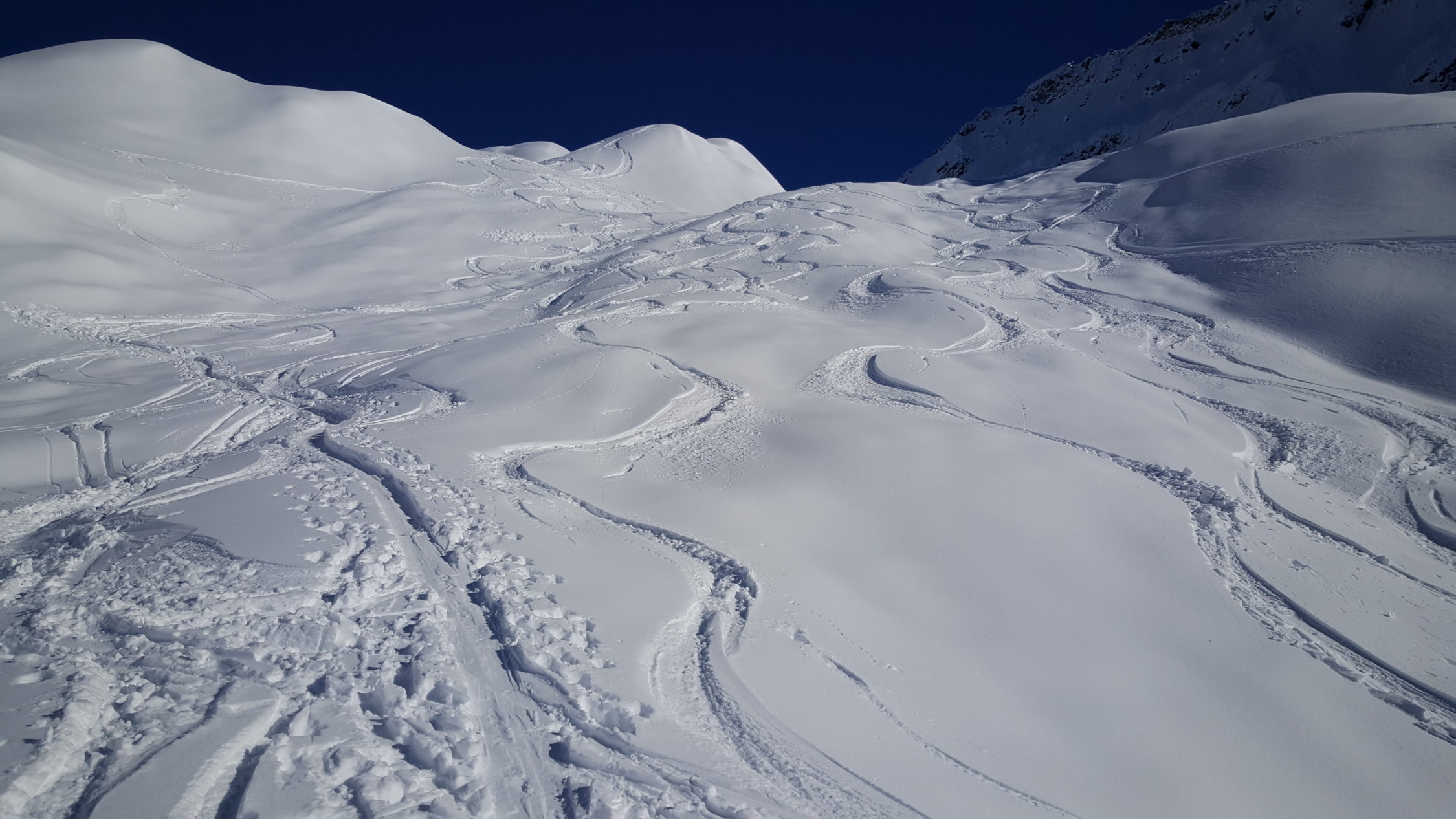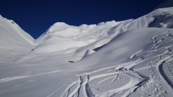 Am Morgen -5°, am Nachmittag -3° in All' Acqua. Auf der Schattenseite des Bedrettotales durchgehende Schneedecke ab Parkplatz. Bis 2100 m hart gefrorener Schnee. Oberhalb Pulver gut. Wetter wolkenlos und windstill. Abfahrt bis 2200 m wunderschön im wenig verspurten Pulverschnee, ein Genuss. Unterhalb 2100 m ist der Schnee hart gefroren, nachdem Regen gefallen ist. Vor allem die Waldabfahrt ist kein Vergnügen.