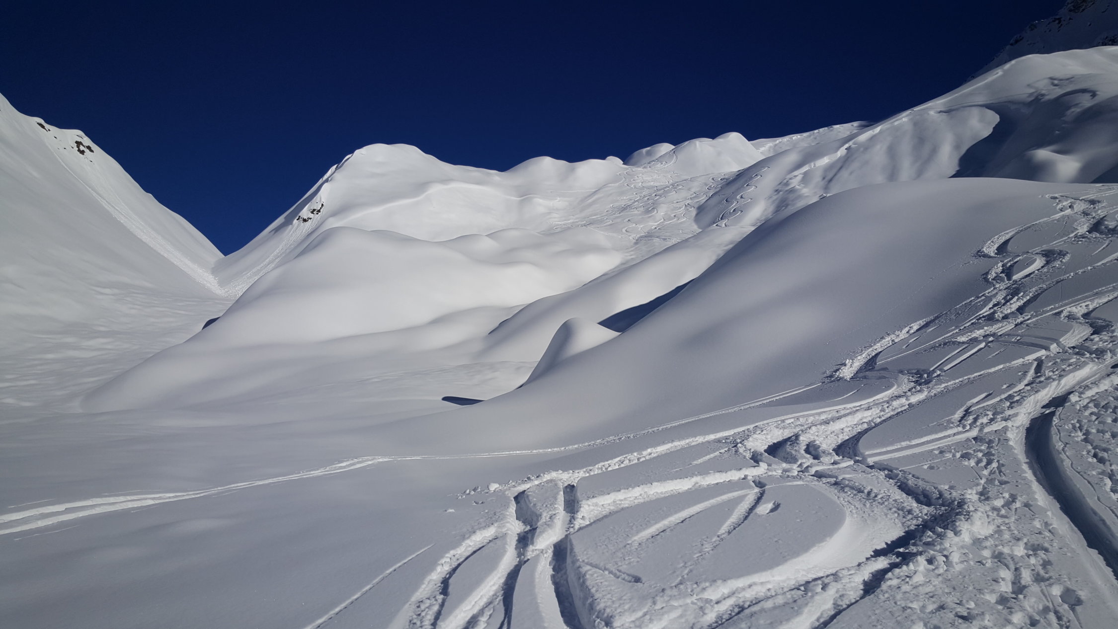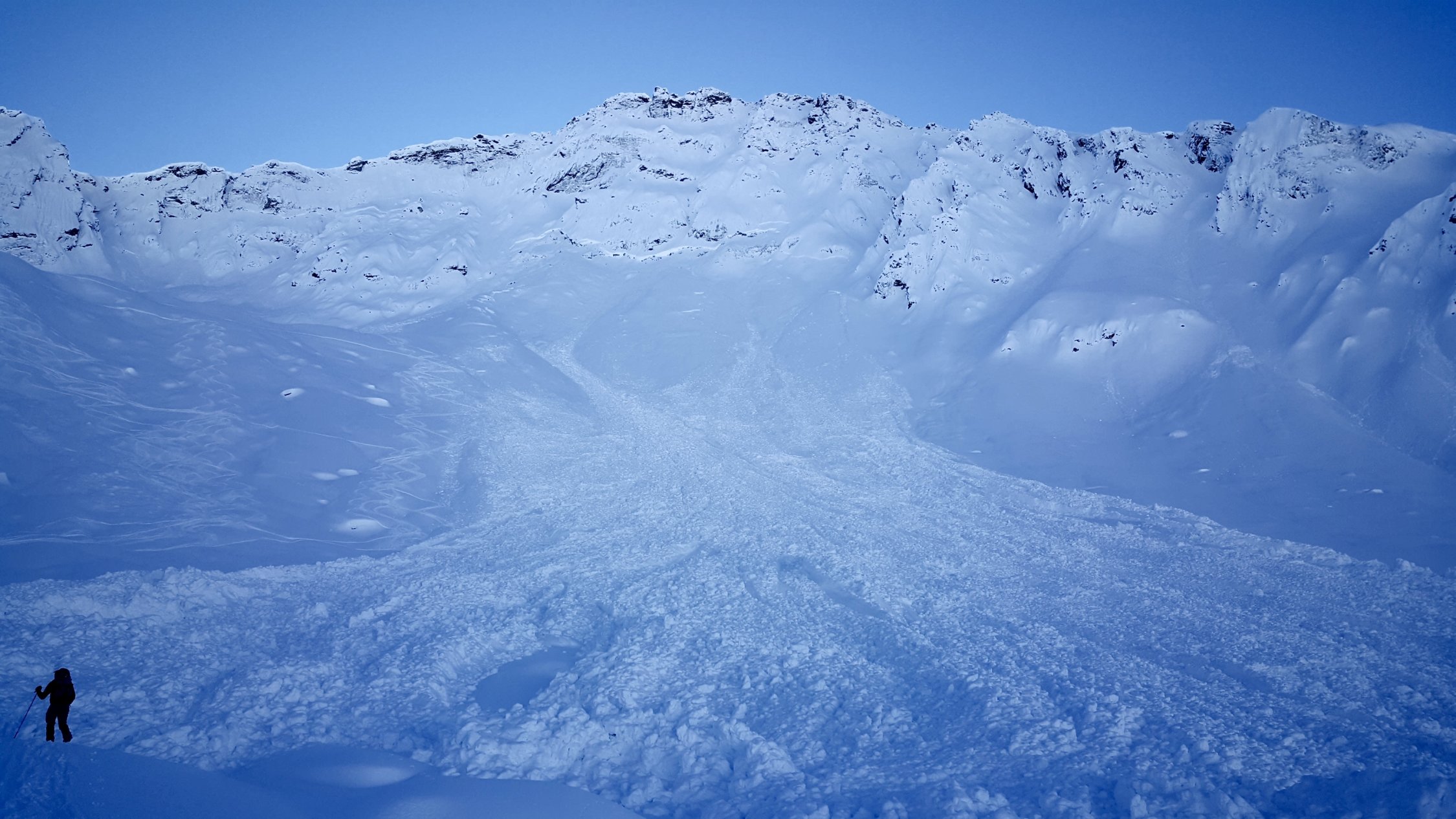 Während den vergangenen Föhntagen ist in kurzer Zeit sehr viel feuchter Schnee gefallen. Beim Aufstieg durch das Val Cavagnolo bekommt man den Eindruck, dass die umgebenden Berge allen Schnee abschütteln wollten. Riesige Lawinen haben den ganzen Talkessel ausgefüllt. Anrissstellen von über 1,5 m Höhe reichen bis auf das Gras. Die Lawinen haben eindrückliche bis zu 4 m hohe Schneemauern aufgestossen. In den letzten 3 bis 4 Tagen hat sich die Schneedecke aber verfestigt. Neue Abgänge haben wir keine festgestellt.