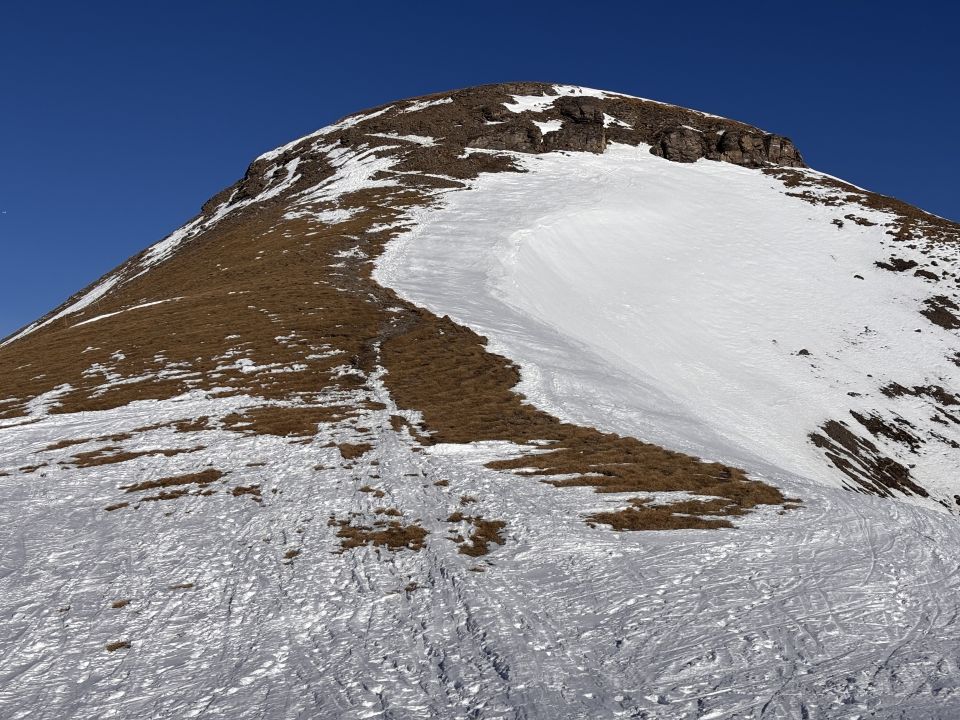 Die Verhältnis-Bewertung "machbar" bezieht sich auf den wenigen Hartschnee, den es zur Zeit noch hat. Auf der Abfahrt ist Vorsicht geboten wegen der Steine. Sonnseitig wird der Schnee im Tagesverlauf leicht aufgesulzt, beim Beginn unserer Abfahrt um 12 Uhr war leider nur wenig davon spürbar (==> Hartschnee).