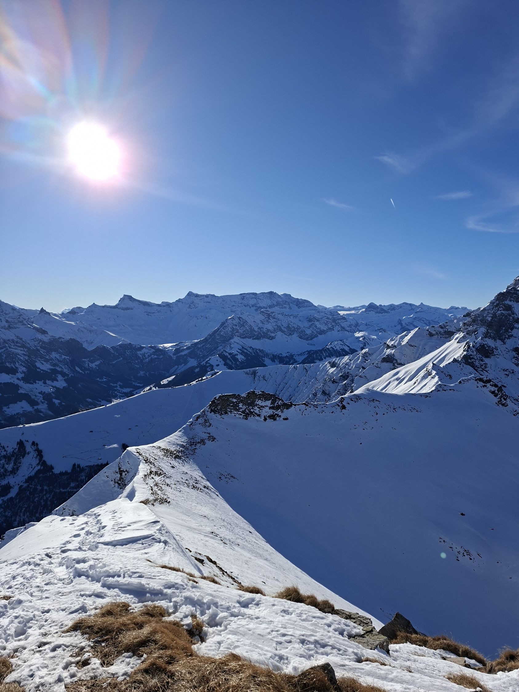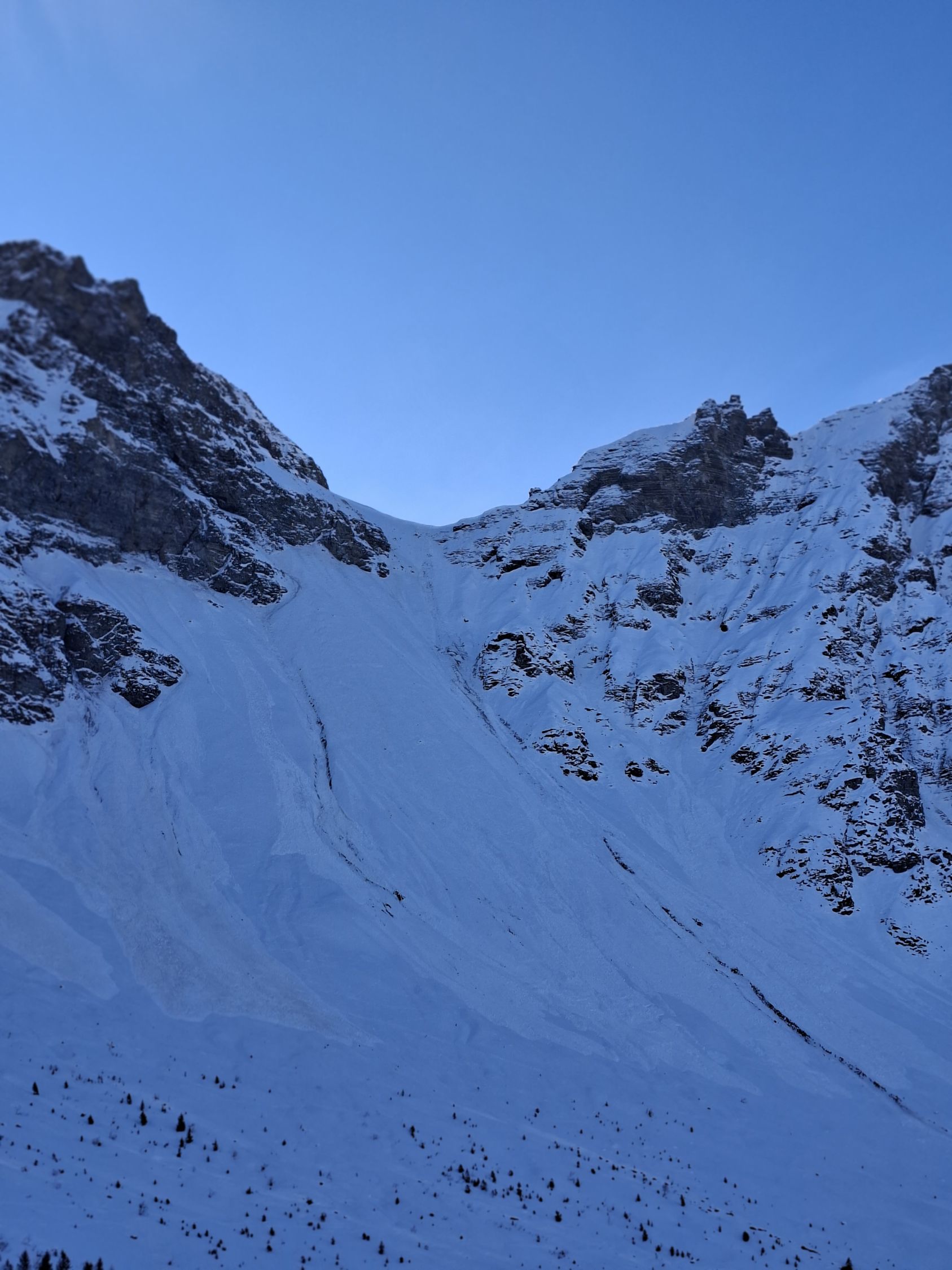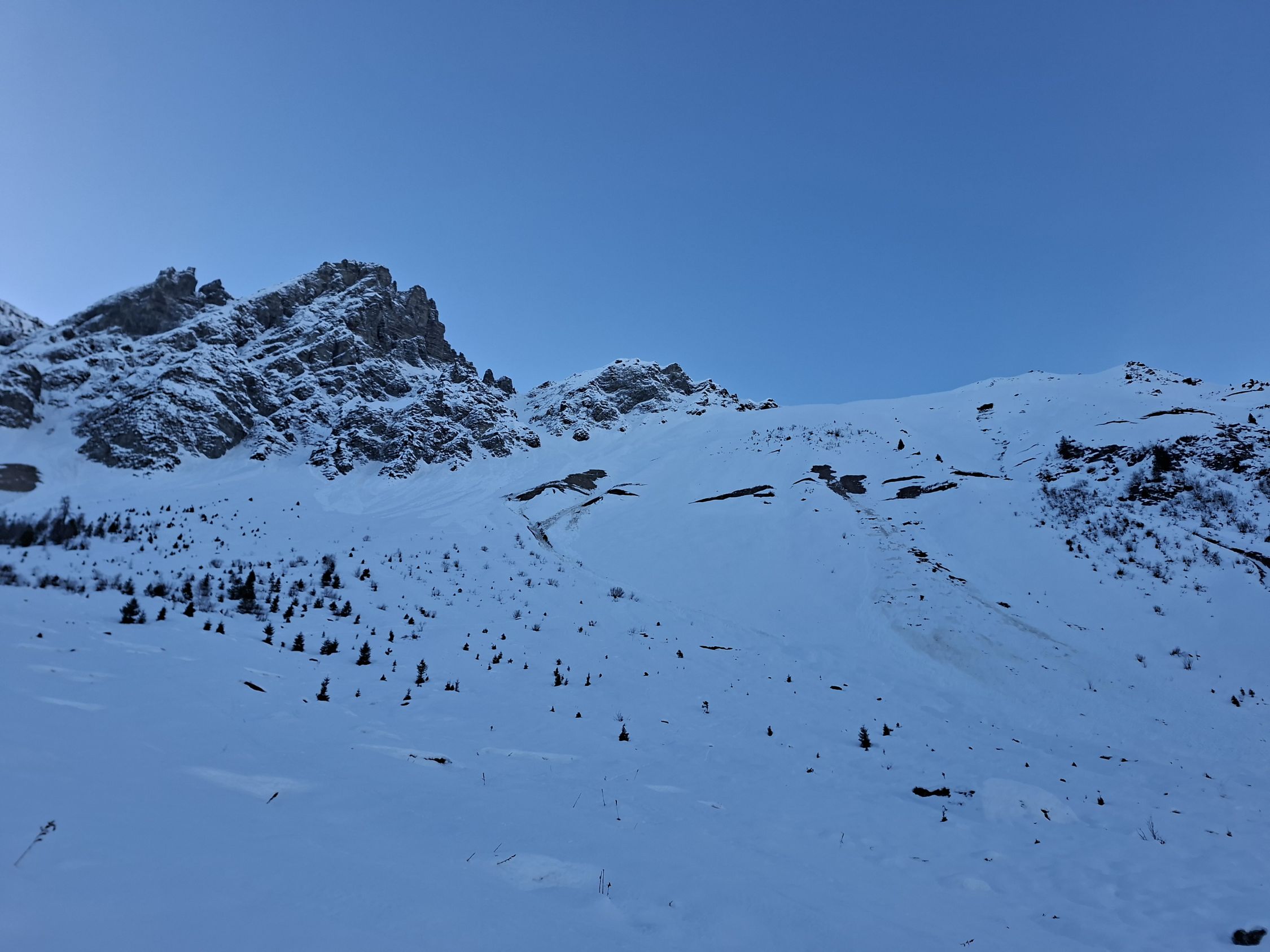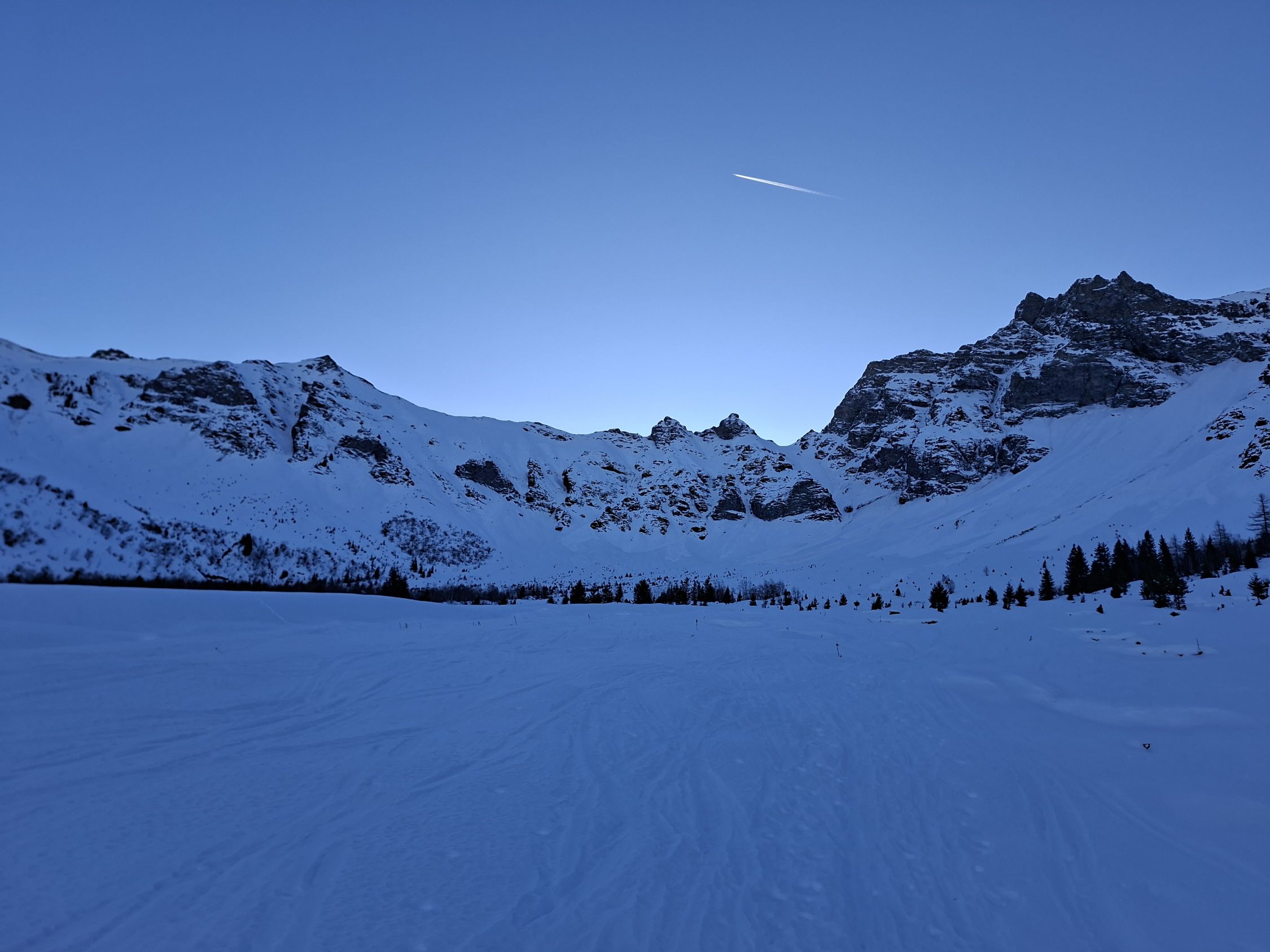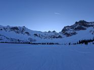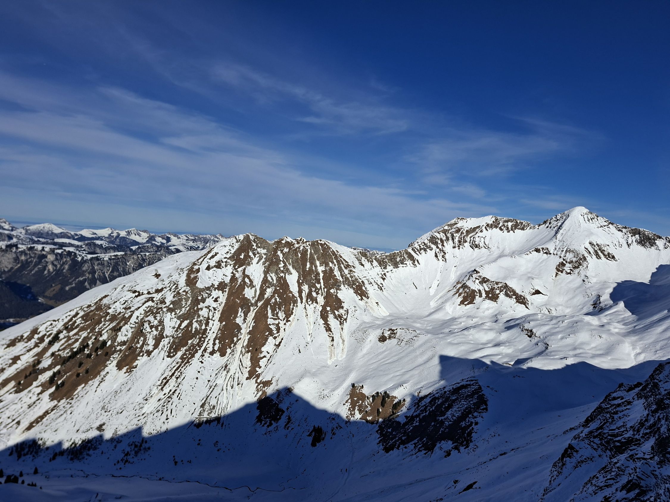 Abfahrt: Vom Gipfelbereich bis ins Chummli hatte es Sulz. Dann Hartschnee abwechselnd mit Bruchharsch. Ich querte oberhalb der Alphütte bei 1872m nach Norden, dann über die Brücke bei 1664m. Dies war heute eine gute Variante. Steibode noch immer hart gefroren mit vielen Spuren.