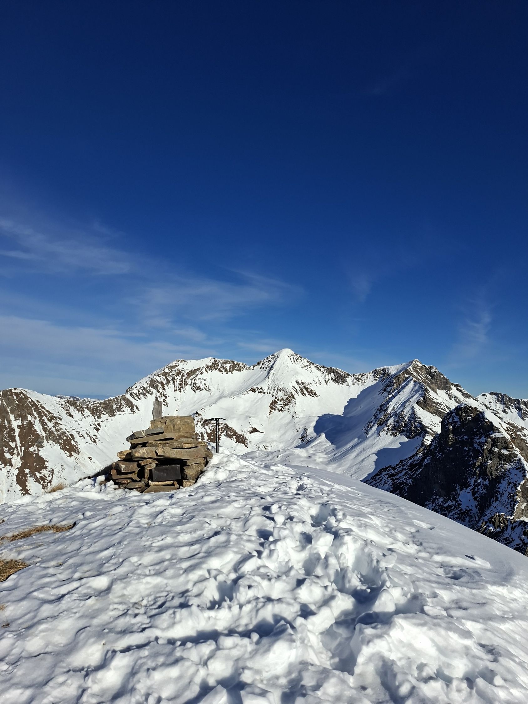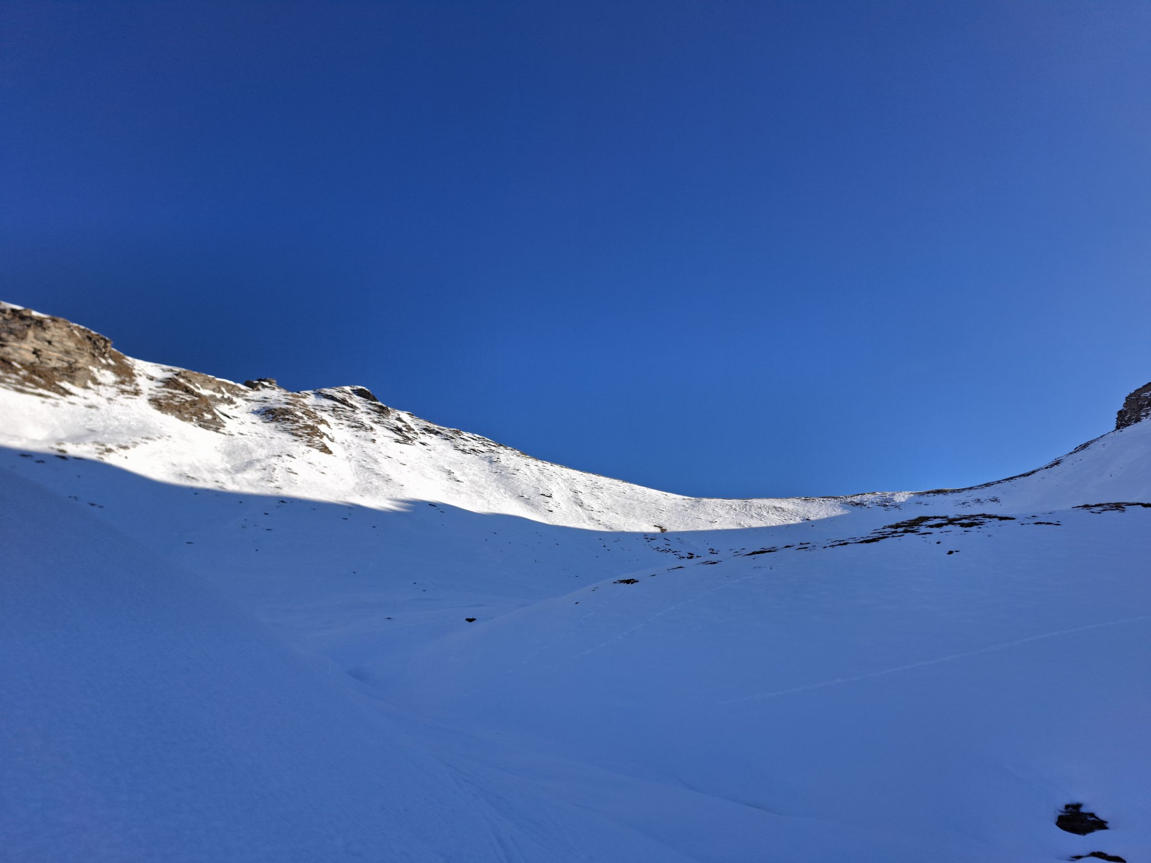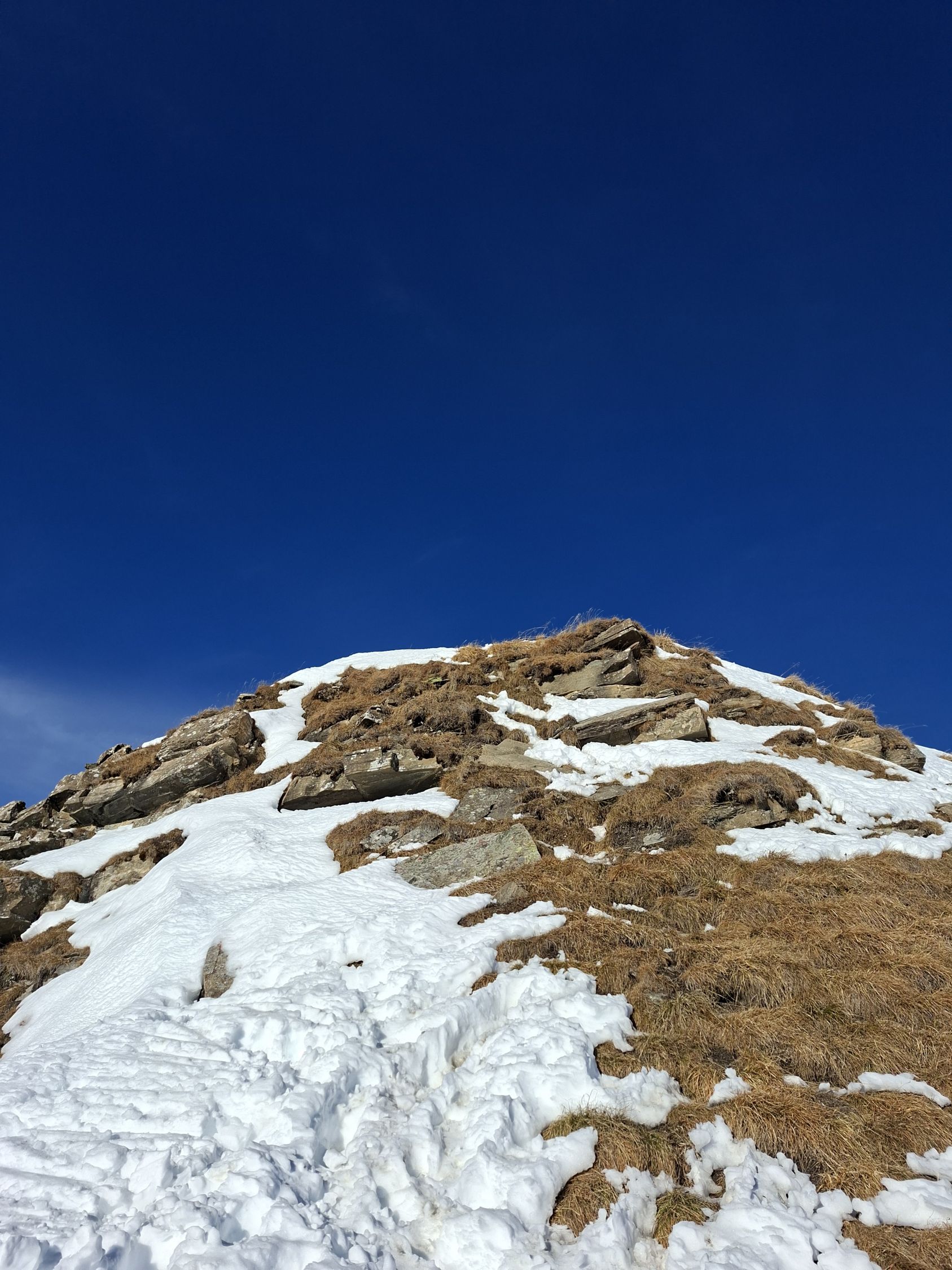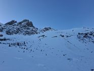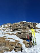 Aufstieg: Es hat noch genug Schnee vom Parkplatz bis zum Gipfel. Der Steibode ist hart, weiter oben Bruchharsch. Ab 1900m ist es hart bis zum Gipfel. Harscheisen waren hilfreich.