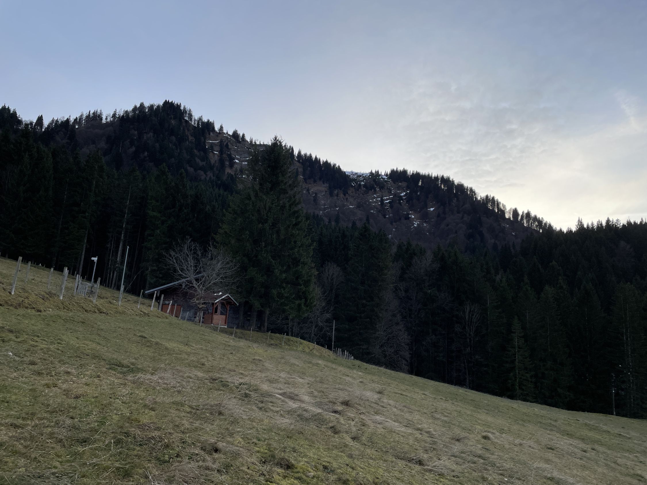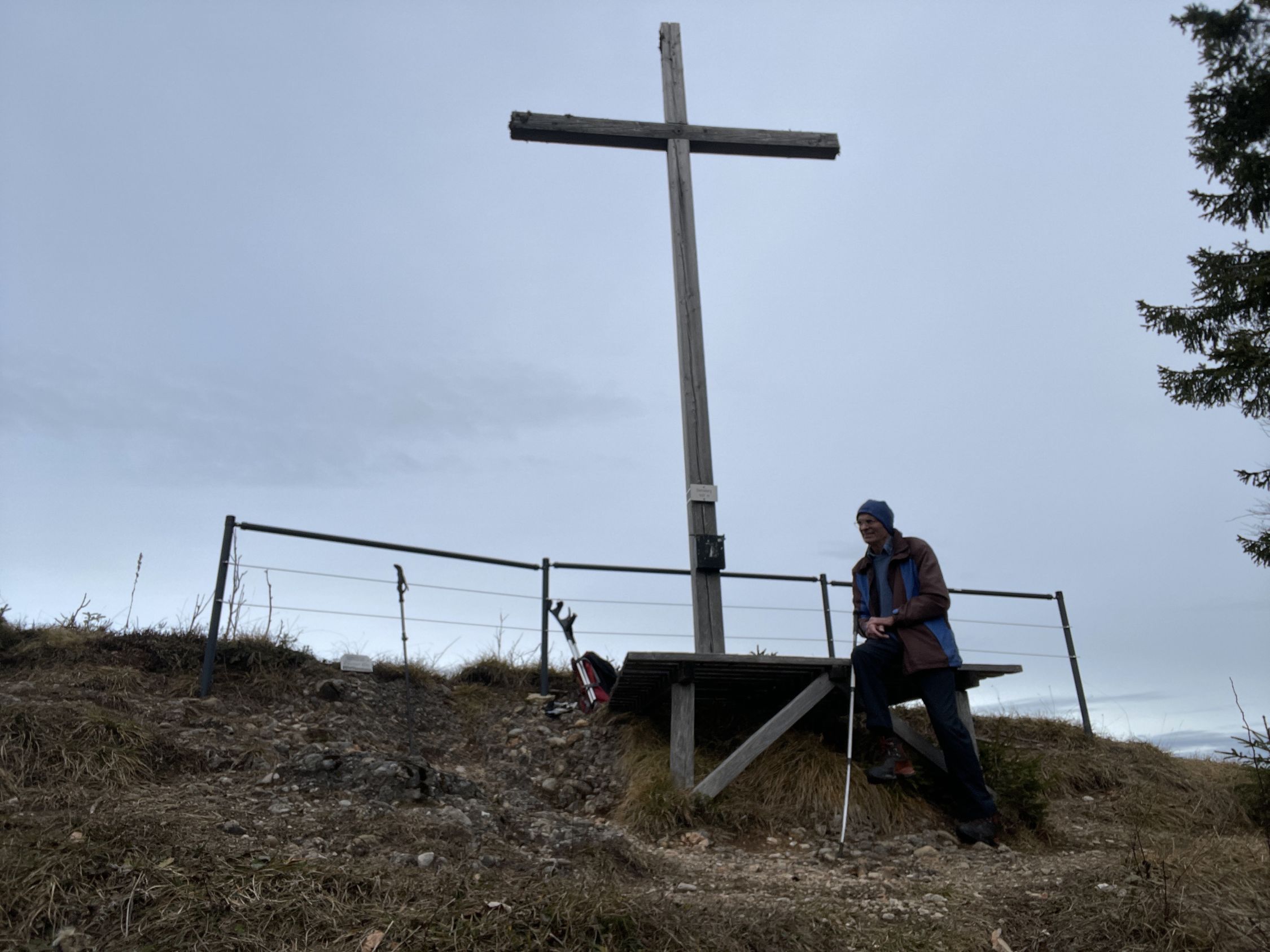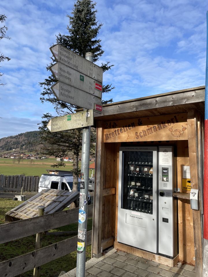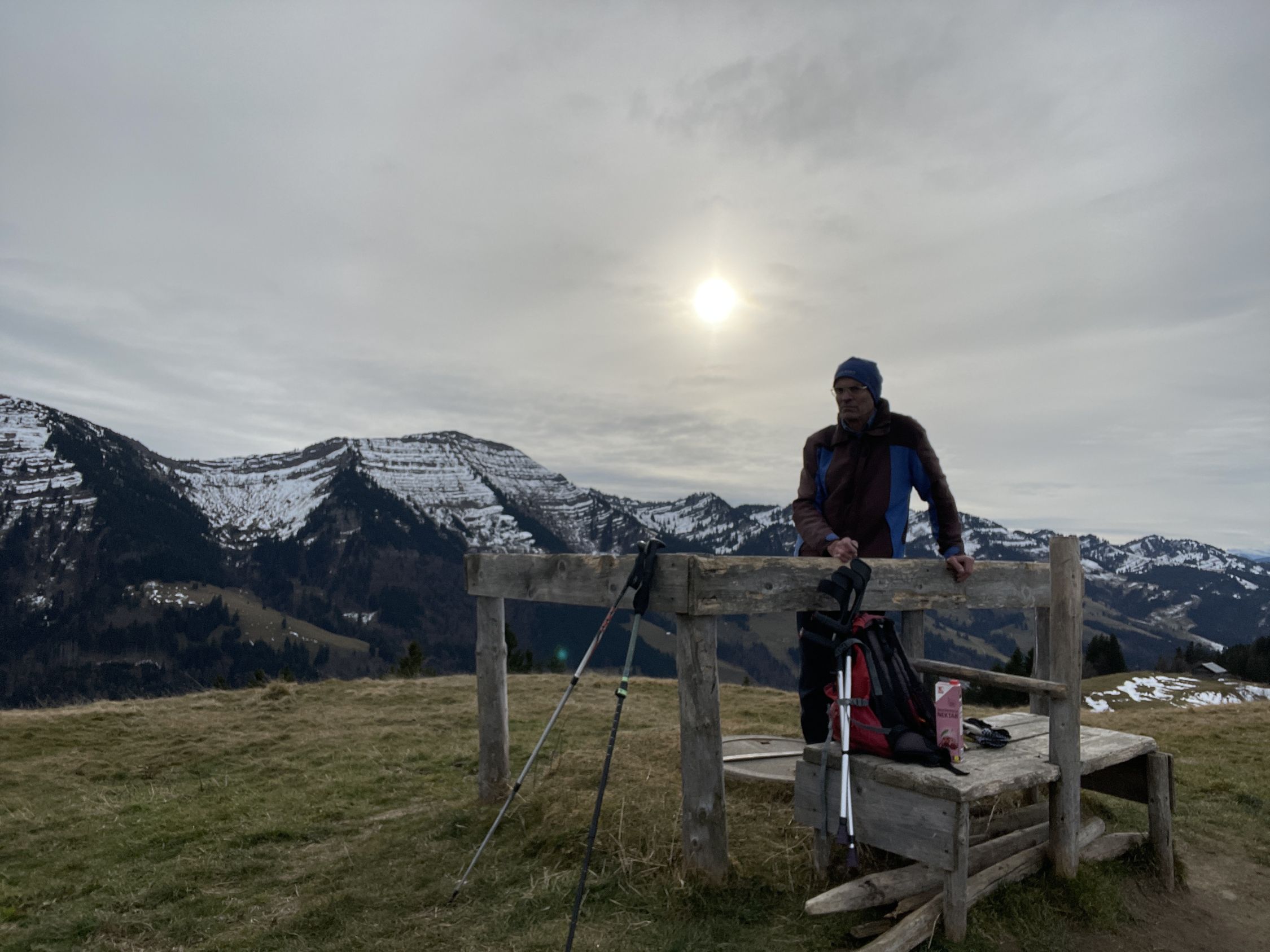 Im Aufstieg begegnete mir eine große Gruppe Jugendlicher bei der Oberen Mittelbergalpe. Sonst war auf der Route niemand unterwegs. Das Gipfelbuch trägt als ersten Eintrag den vom Pfarrer K.-B. Mathias vom Dekanat Oberstaufen anlässlich seiner Bergmesse am 23.7.2023. Letzter Eintrag war am 16.11.2025. Es ist zu 2/3 beschrieben. Die Jausenstation Moosalpe öffnet erst wieder am 1. Mai.