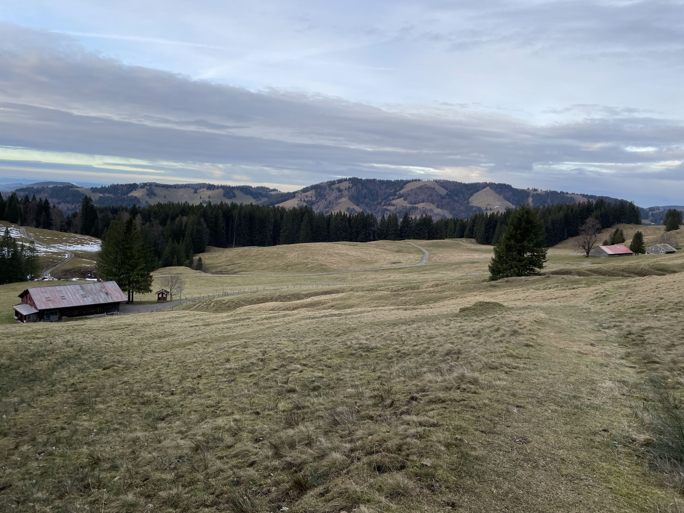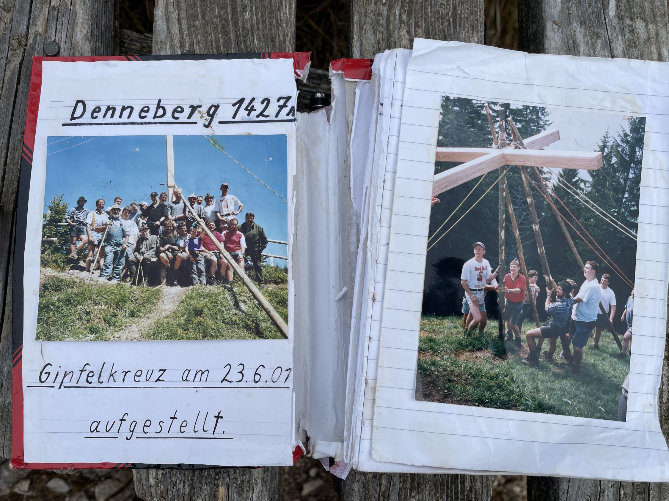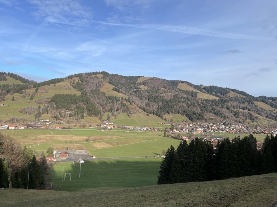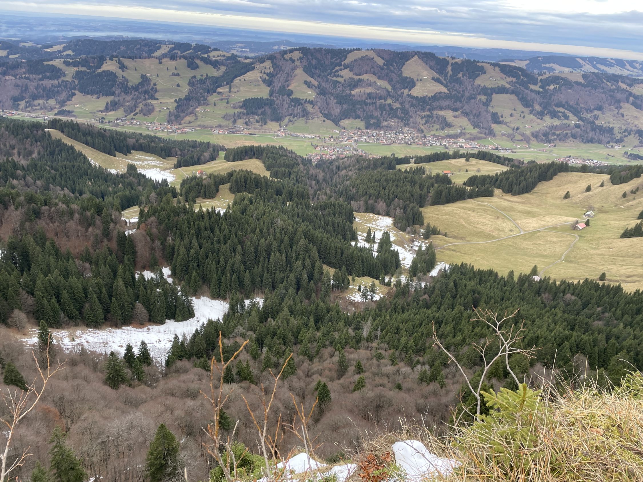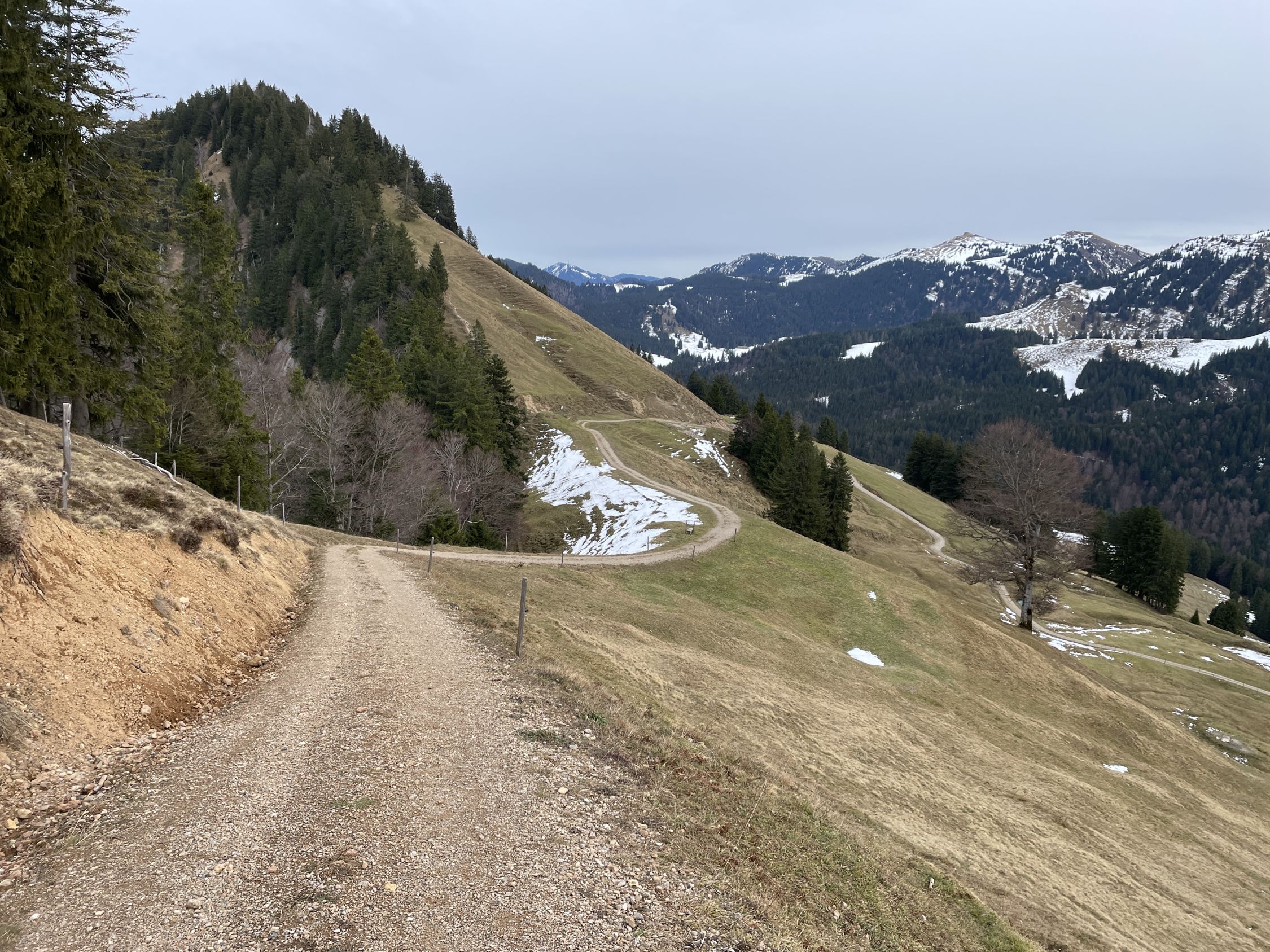 Im Aufstieg begegnete mir eine große Gruppe Jugendlicher bei der Oberen Mittelbergalpe. Sonst war auf der Route niemand unterwegs. Das Gipfelbuch trägt als ersten Eintrag den vom Pfarrer K.-B. Mathias vom Dekanat Oberstaufen anlässlich seiner Bergmesse am 23.7.2023. Letzter Eintrag war am 16.11.2025. Es ist zu 2/3 beschrieben. Die Jausenstation Moosalpe öffnet erst wieder am 1. Mai.