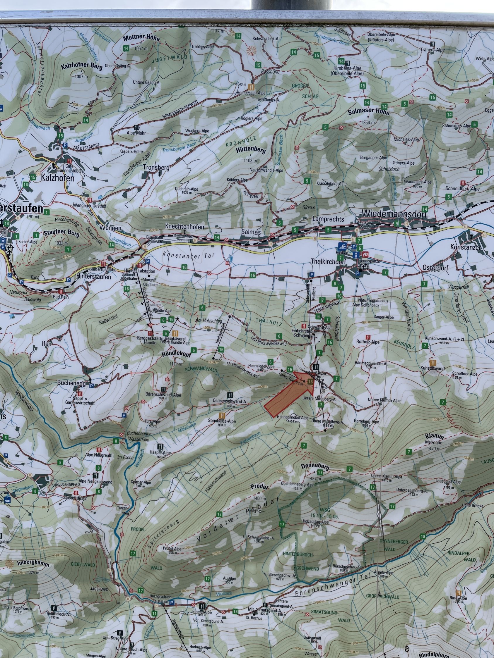 Thalkirchdorf – Ww. 787 m – Schwandalpe – P 936 – Moos-Alpe – Konstanzer Kreuz – P 1057 – Obere Mittelberg-Alpe - P 1184 – Ww. 1415 m – Denneberg – Kreuzgipfel – P 1332 – Herreberg-Alpe – Ww. Klammalpe – P 1057 – Moosalpe – Schwandalpe - Thalkirchdorf
