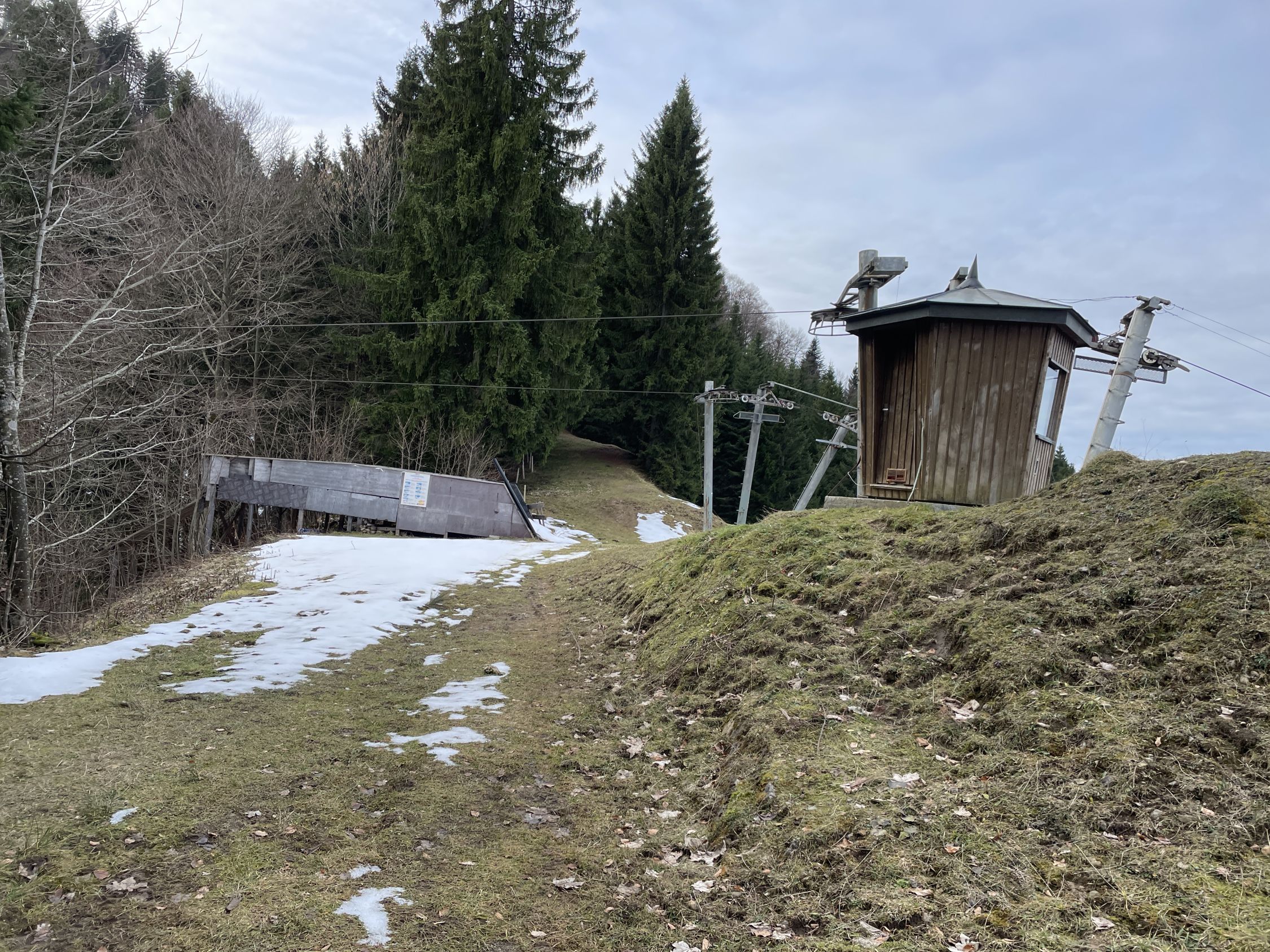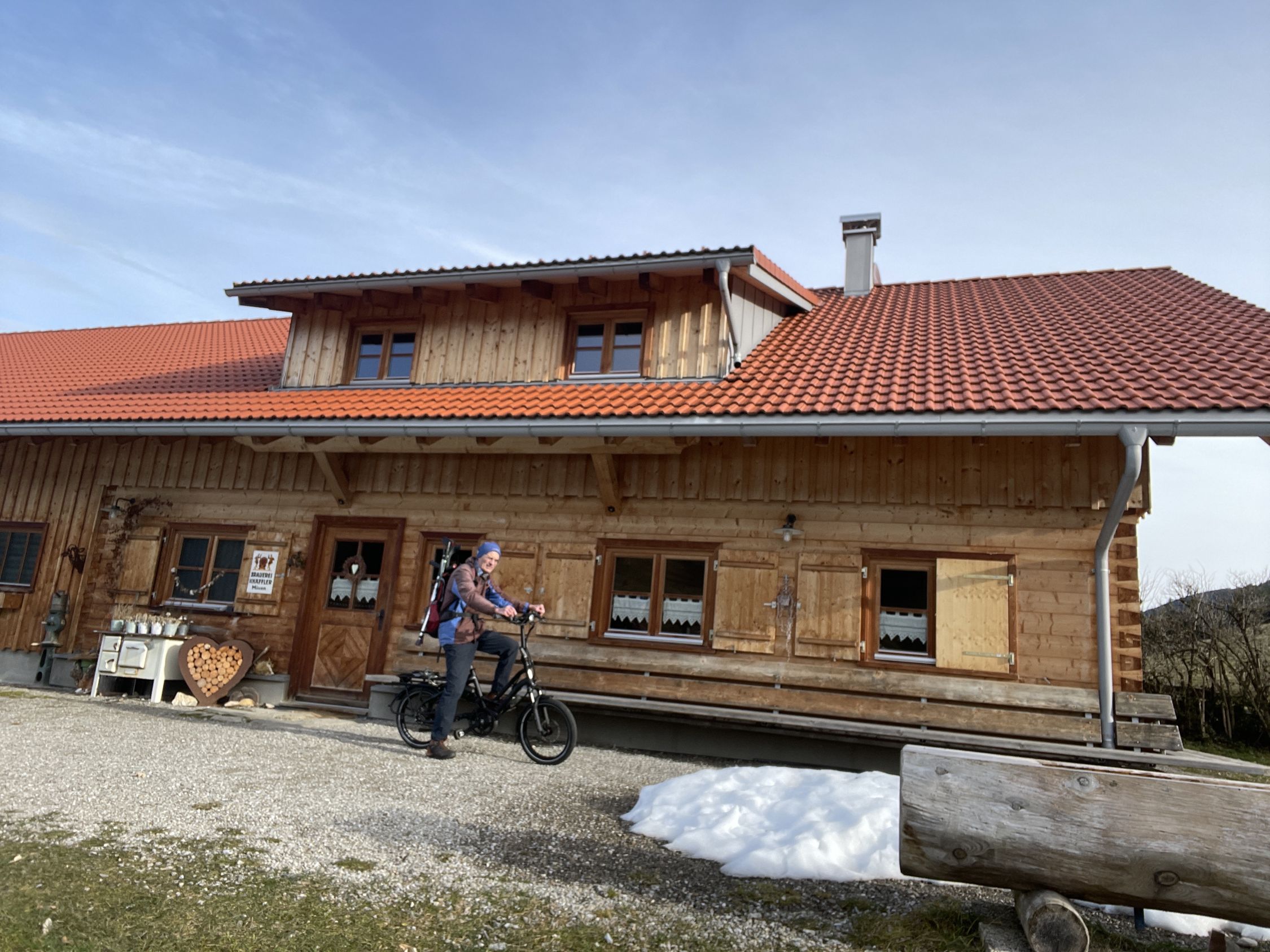 Tourenbeginn um 11:00 Uhr bei 6°C unter heiterem Himmel. Die wenigen Schneereste im Gipfelbereich lassen sich umgehen, oder problemlos überlaufen. Bis zur Moos-Alpe fuhr ich die 270 Hm und 2,7 km mit dem E-Mini-Bike hinauf, um mir den Abstiegshatscher zu ersparen. Außerdem bin ich mit dem operierten Bein noch nicht in der Lage, über 700 Hm zu absolvieren.