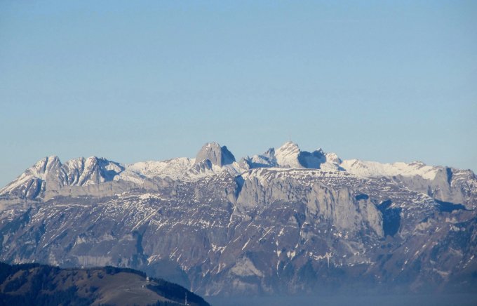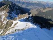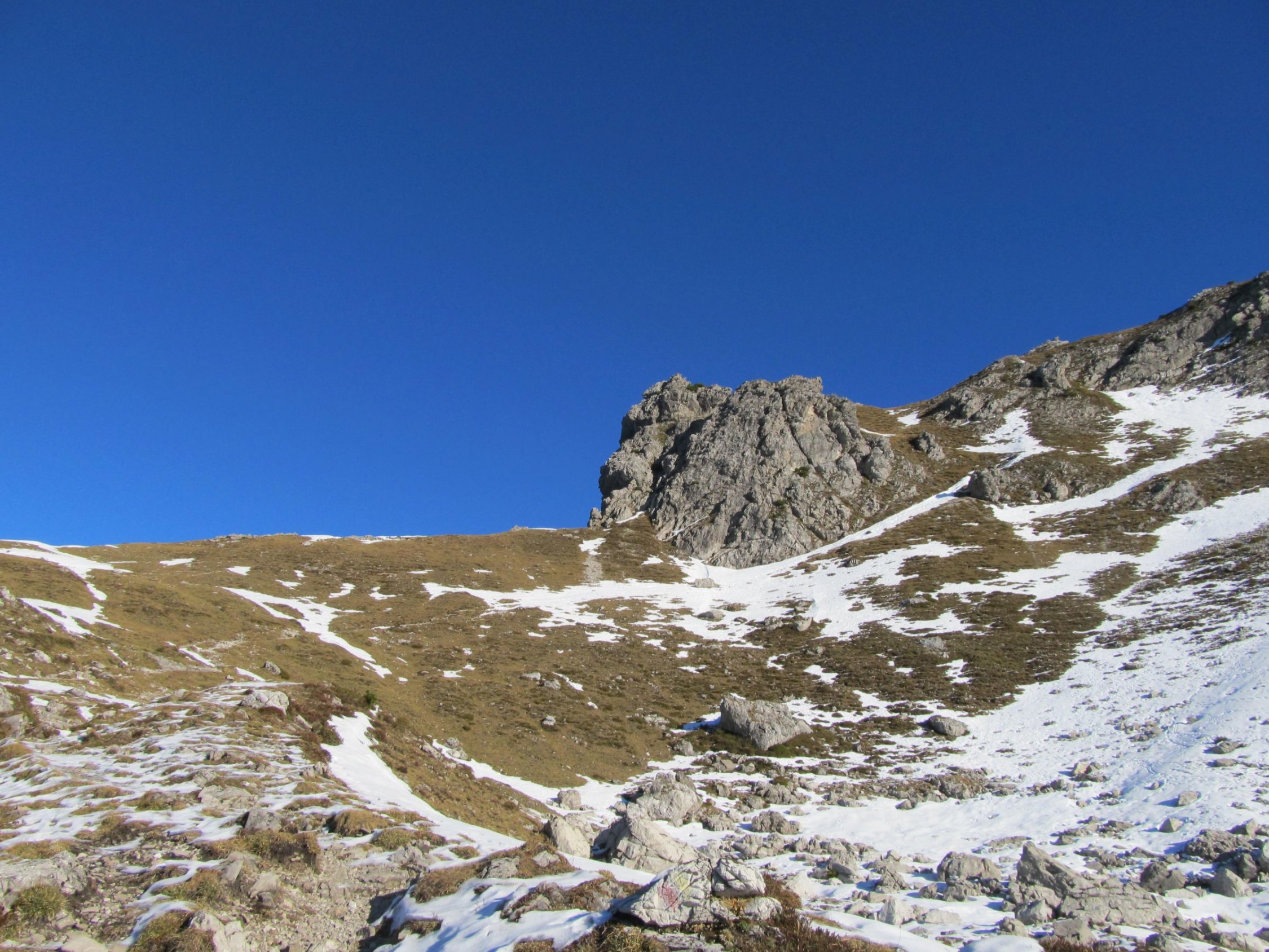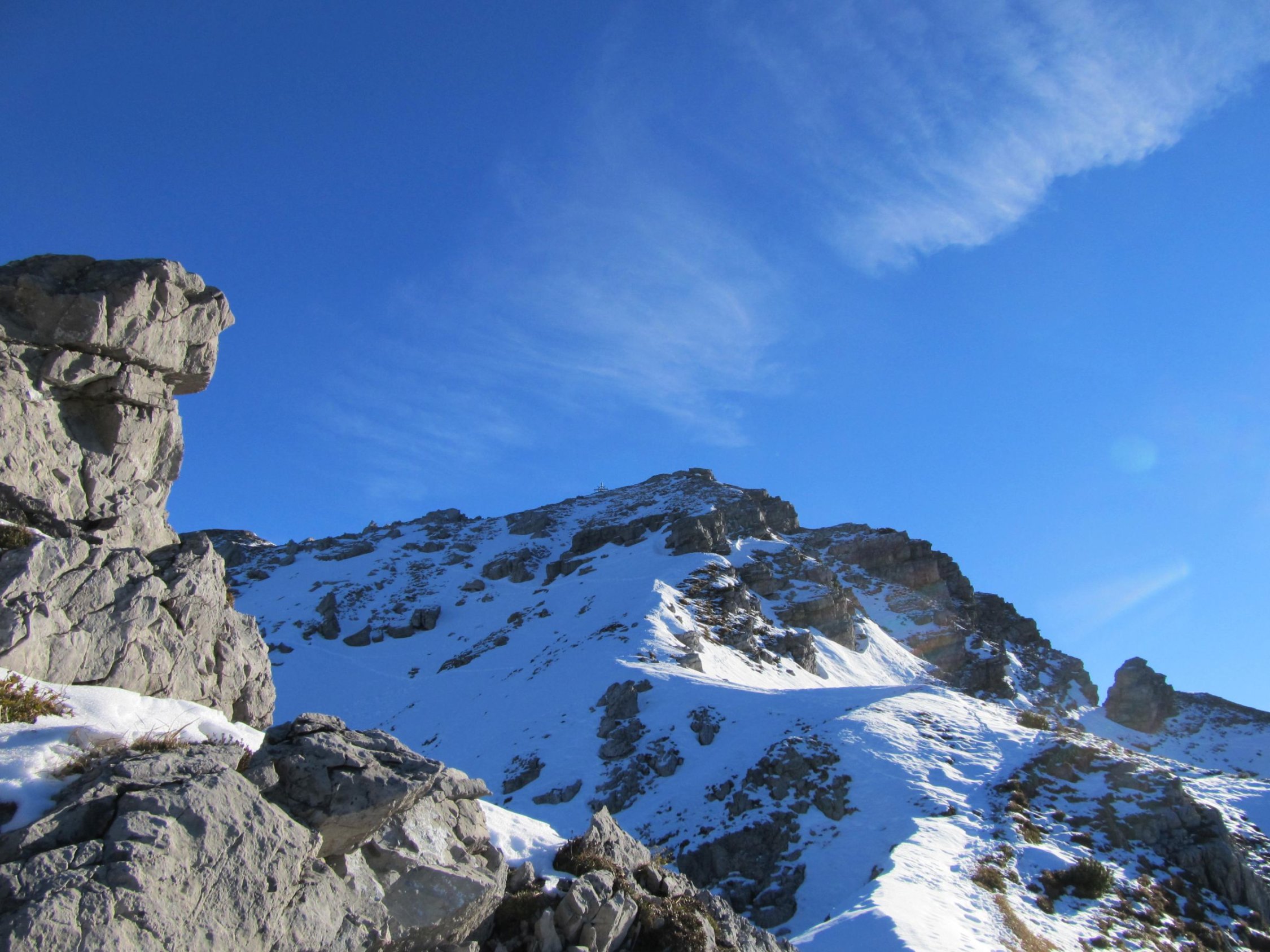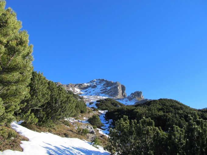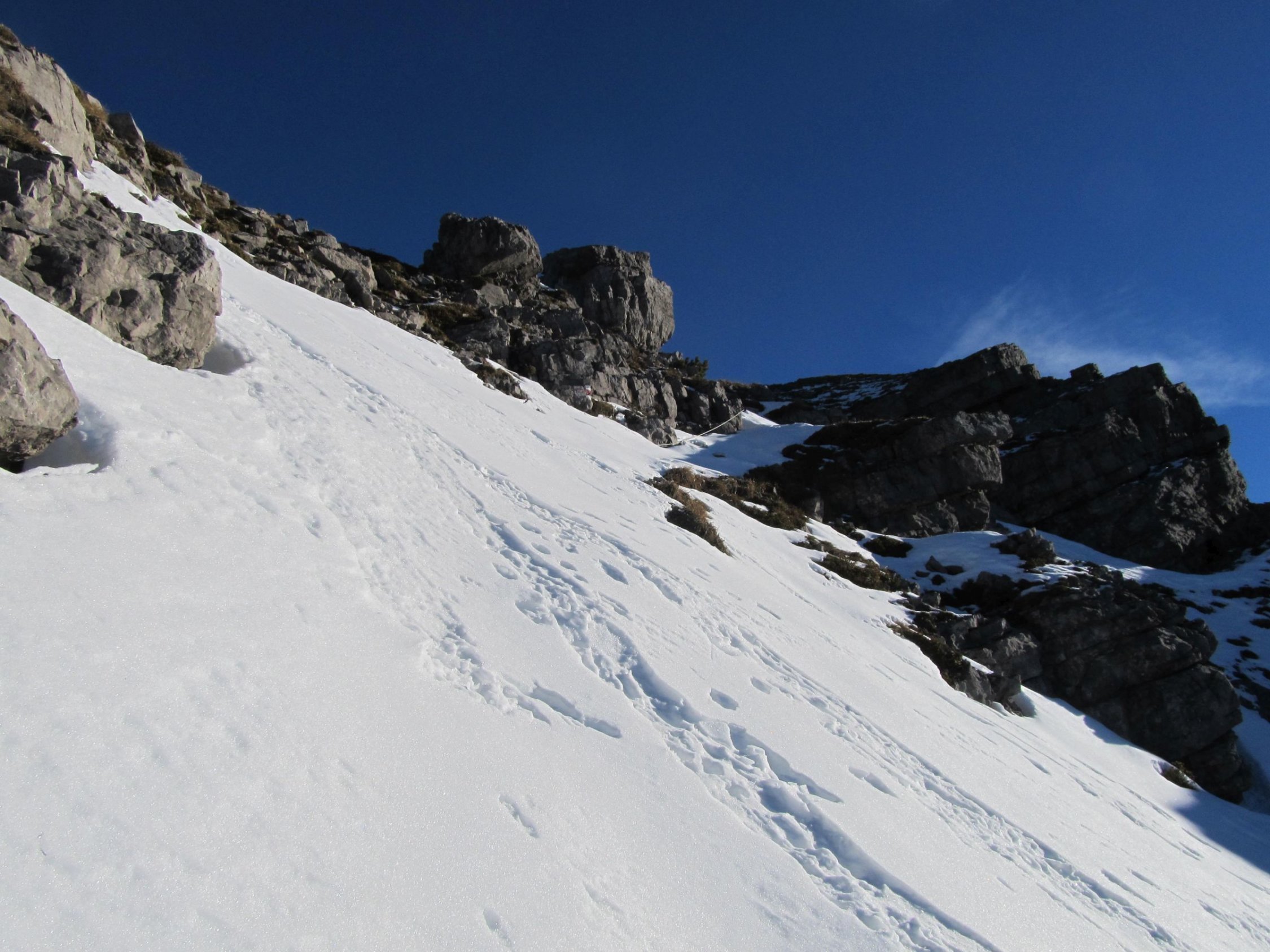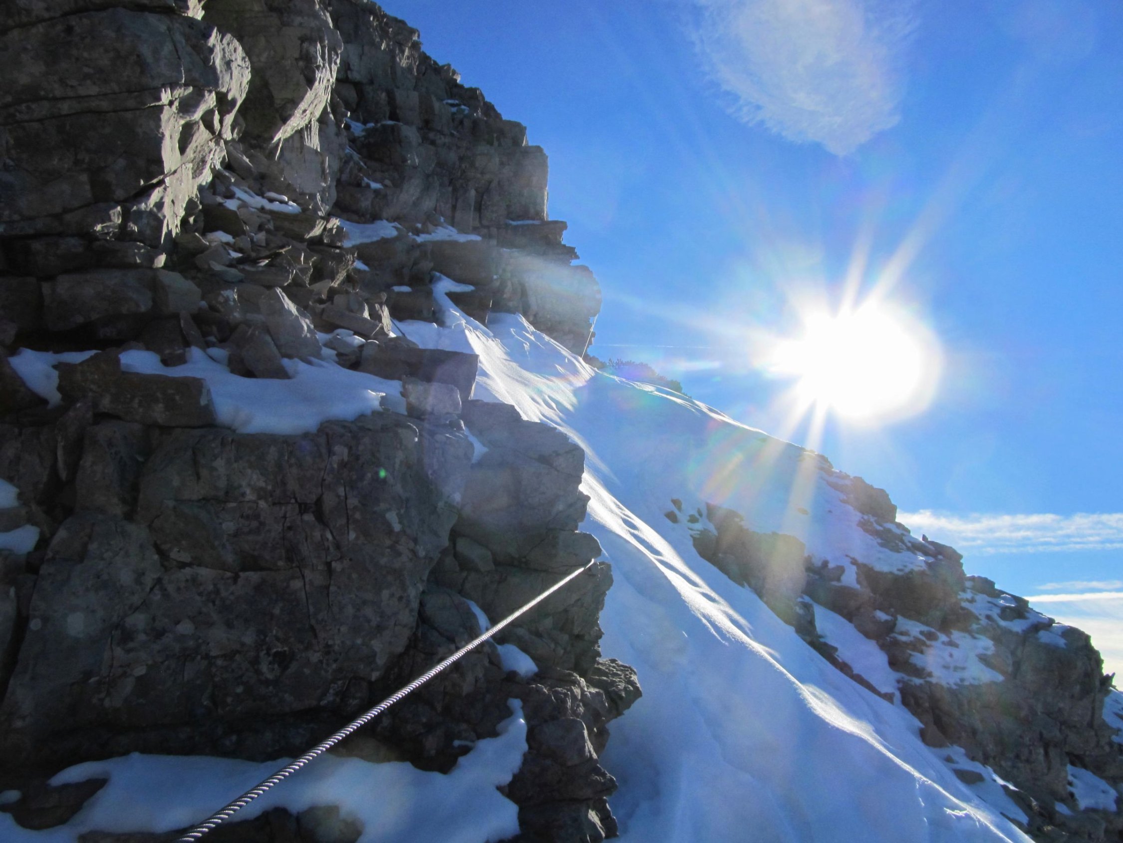 Sonnig, aber im Schatten kalt und frostig. Ab ca. 1900 m erster Schneekontakt. Die Drahtseile waren zum Teil im Schnee versteckt, auch in einem steileren Schneefeld, weshalb ich ca. 100 m vom Gipfel entfernt umkehrte. Mit Pickel wäre es wohl gegangen, das Drahtseil aus dem Schnee zu befreien. Umgehung über Grat wohl denkbar. Zustieg schuttig mit losem Material.