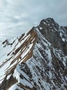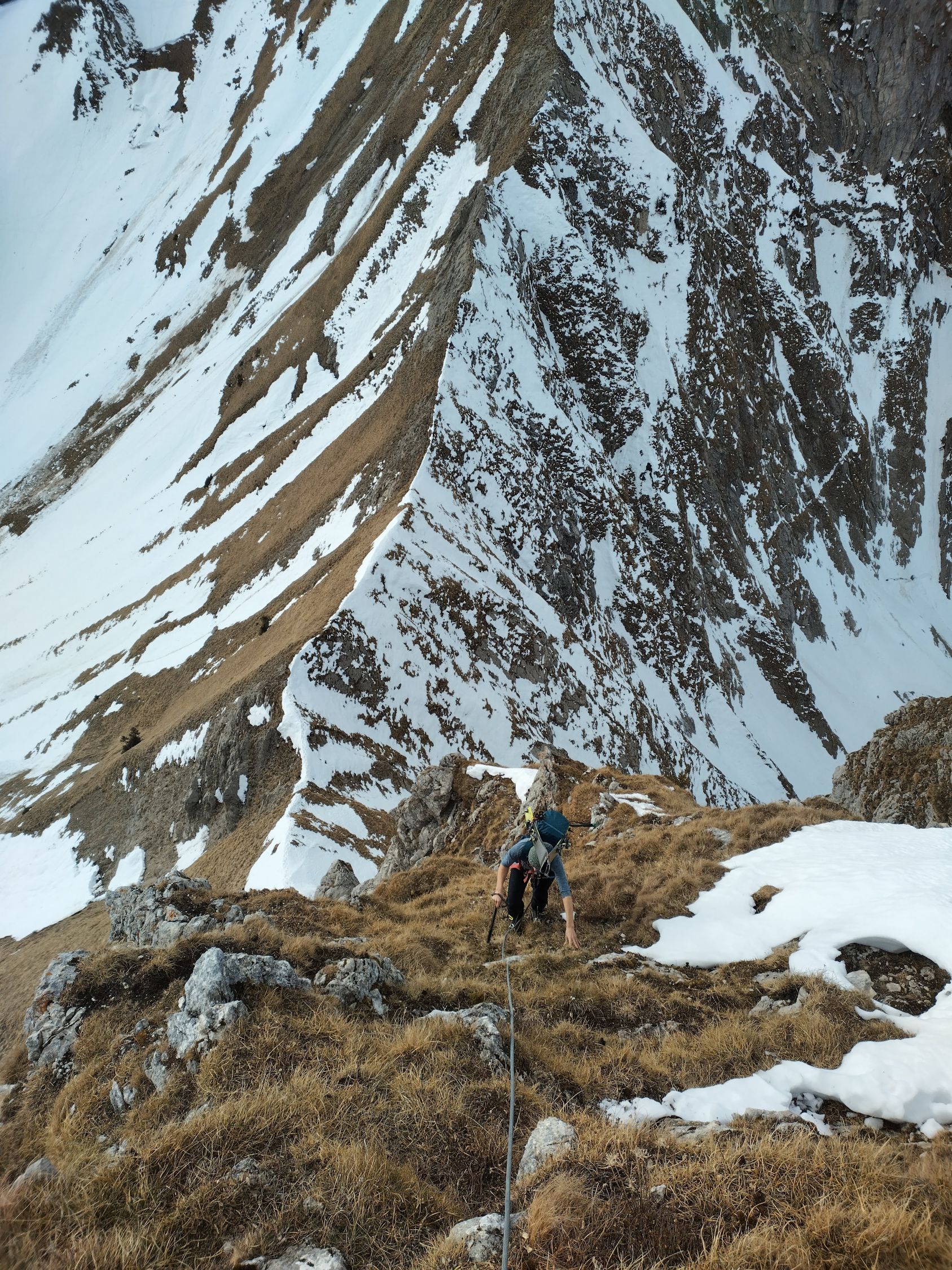 Verhältnisse am Gemsgrat frühlingshaft, Es hat teilweise Schnee und Eis am Grat, war mit Steigeisen und Pickel und der nötigen Vorischt machbar. Der Aufschwung gegen die Gemsfluh ist schneefrei.