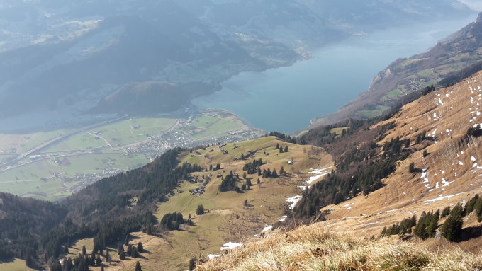 Am Morgen guter Trittschnee vor Nideri, Grat prakt. schneefrei und nie rutschig oder gefährlich, Schneefeld am Gipfel bei Abstieg, Kurhaus Voralp geschlossen