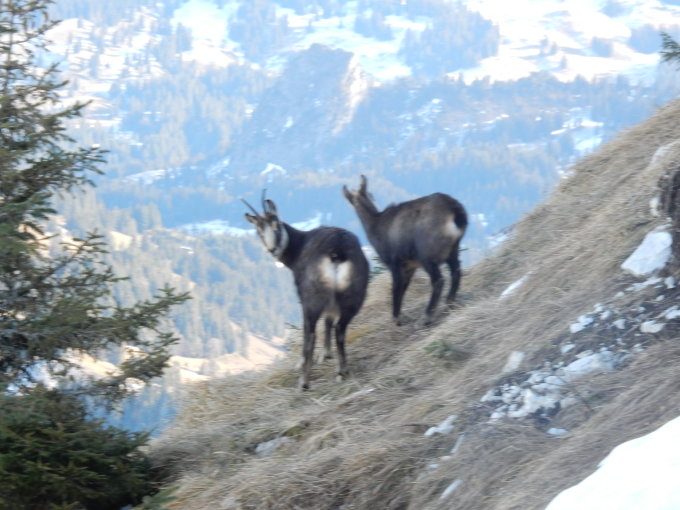 Ganze Gruppe weitgehend schneefrei, lediglich in einigen schattigen Rinnen kleine Altschneereste. Je nach Nebelobergrenze Raureif an den Bäumen, Gras schattseitig durchgefroren, sonnseitig trocken (aber dürr). Da es wegen des Schönwetters doch einige Begehungen hat, trifft man im Schnee immer auf Fußstapfen und Pickellöcher. Ich hatte Steigeisen und Pickel dabei und konnte auf beides problemlos verzichten. "Dicke Schuh" empfehlenswert.