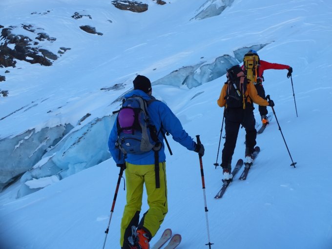 Optimale Verhältnisse, die steile Ostflanke ist gespurt und durchgängig in teilweise hartem, winderodiertem Pulverschnee zu machen.