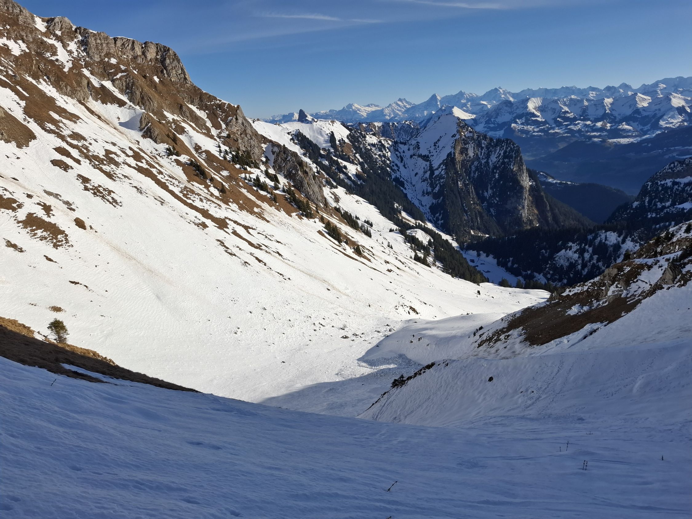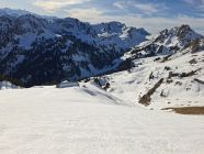 Abfahrt Bürgle. Gipfelhang sehr schön. Morgetepass harte Abrutschstelle. Bis