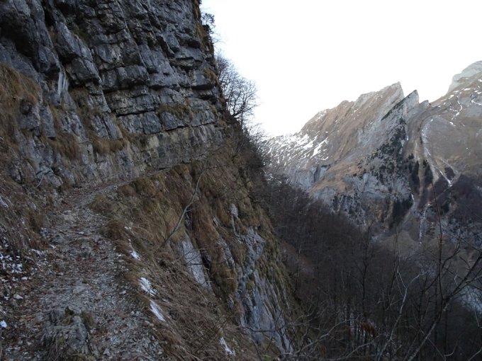 Bis Meglisalp praktisch schneefrei, ausser bei der Querung auf ca. 1400 Meter und kurz vor dem P.1491. An einigen Stellen Blankeis vom heruntertropfenden Wasser oder von gefrorenem Quellwasser. (Im Abstieg bin ich diese Passagen gerne mit Steigeisen gegangen). Eisschlag war auch nicht ohne!