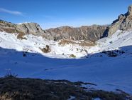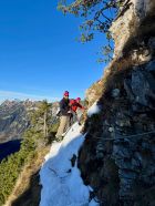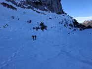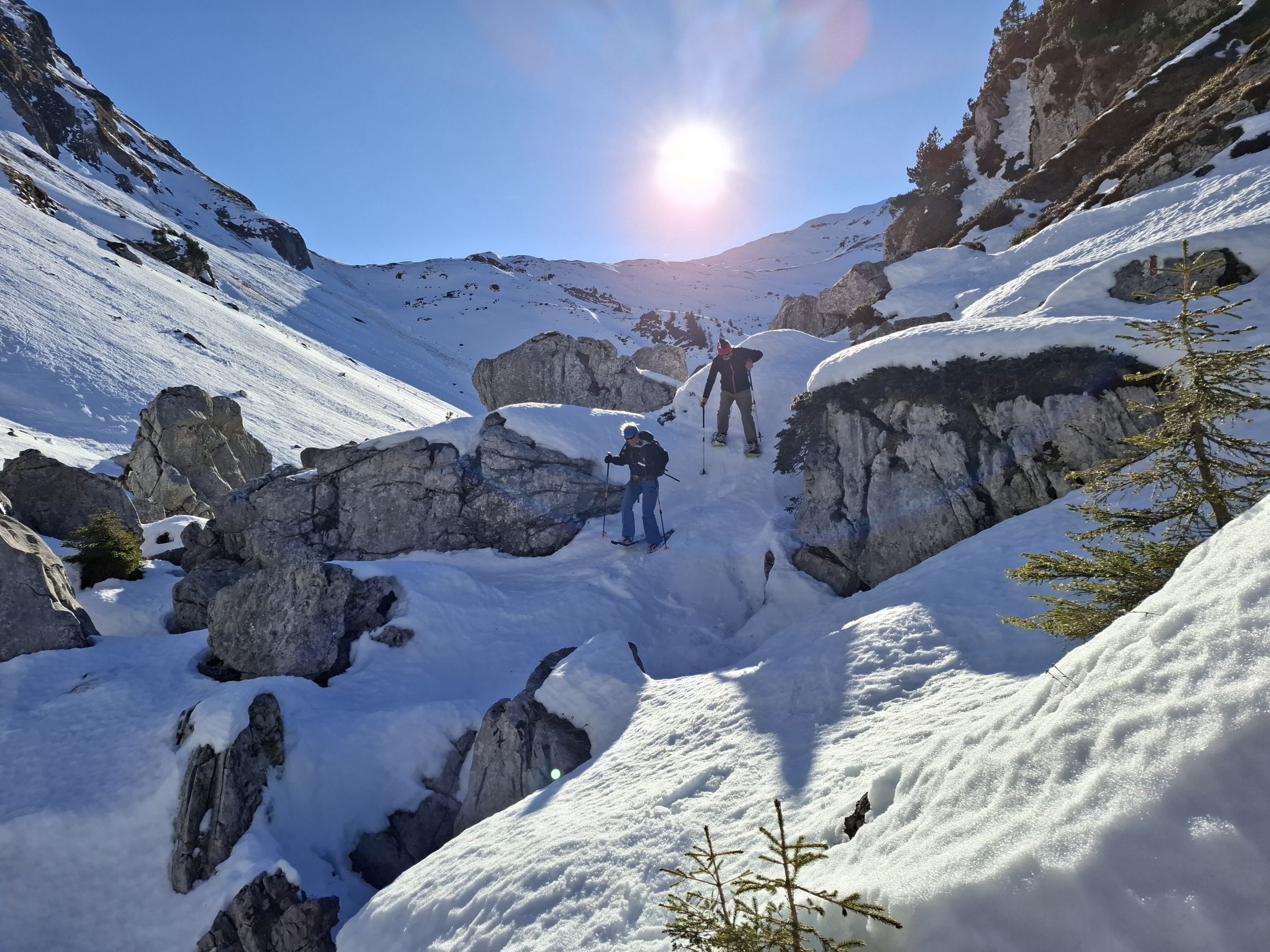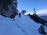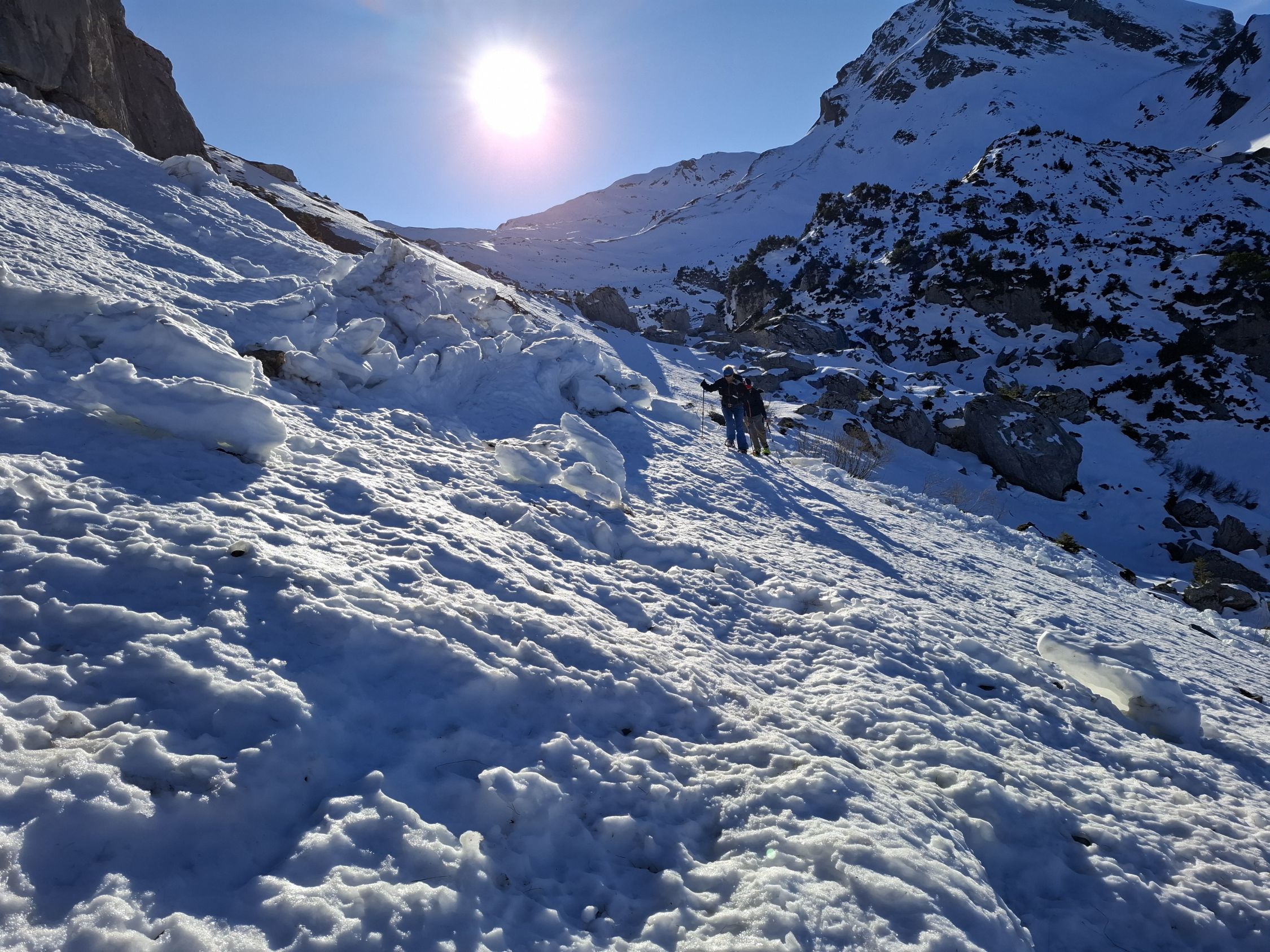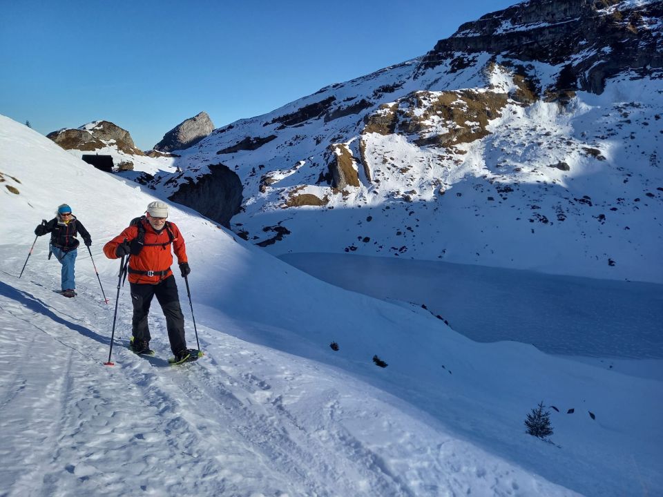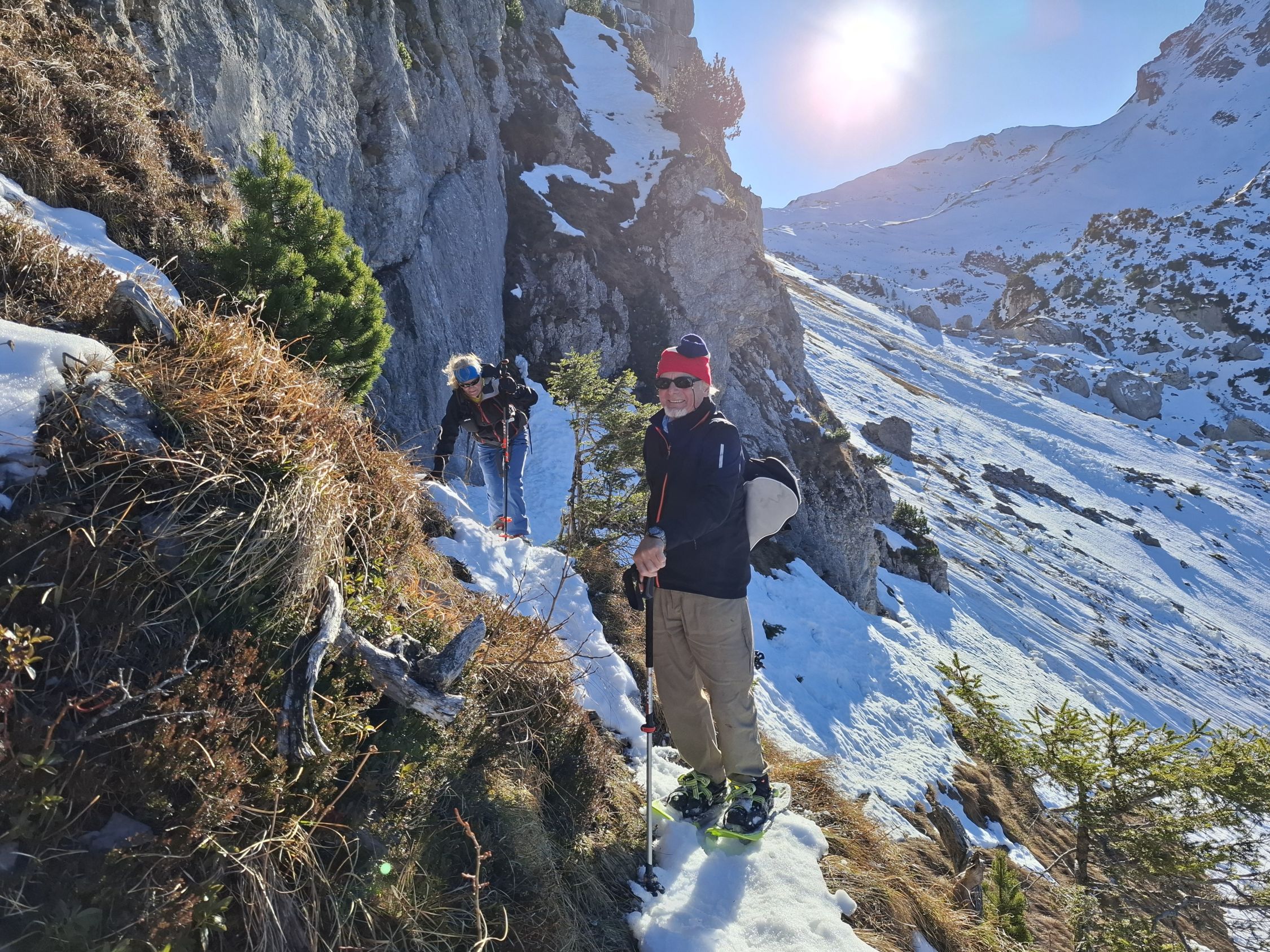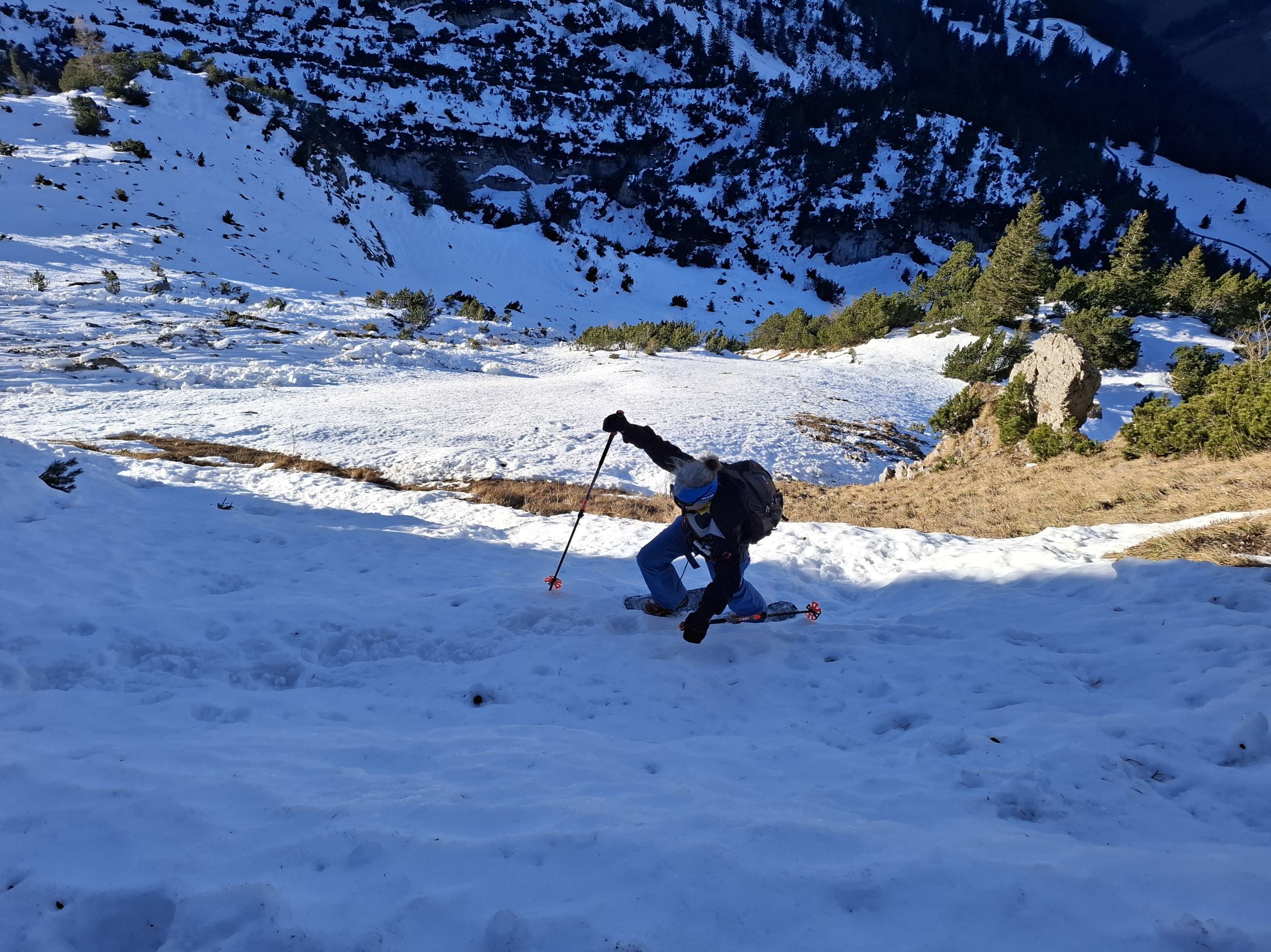 Abstieg: nicht tragender Deckel mit teilweise glasharter Schicht. Nach der Alp Rotenbalm, ab P 1764 hatten wir uns für den höher gelegen, nicht markierten, Weg entschieden und das war keine so gute Idee. Ohne Steigeisen und Pickel war der Weg ziemlich schwierig. Das Gelände ist sehr steil und diverse Lawinenabgänge machten die Flanke hart und eisig. Vorsichtiges Gehen war unumgänglich, ein Ausrutschen wäre fatal gewesen.