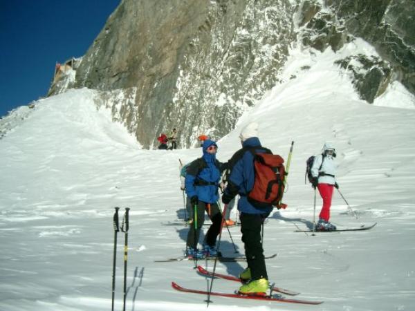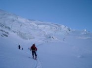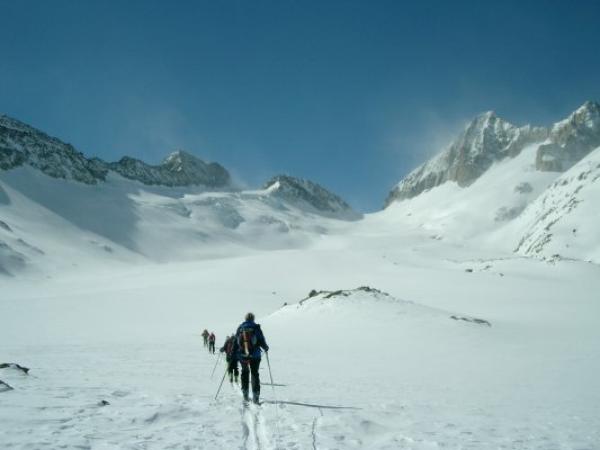 Der Gletscher ist per Tourenski gut begehbar, die Spalten sind zu, der Schnee ist windgepresst.