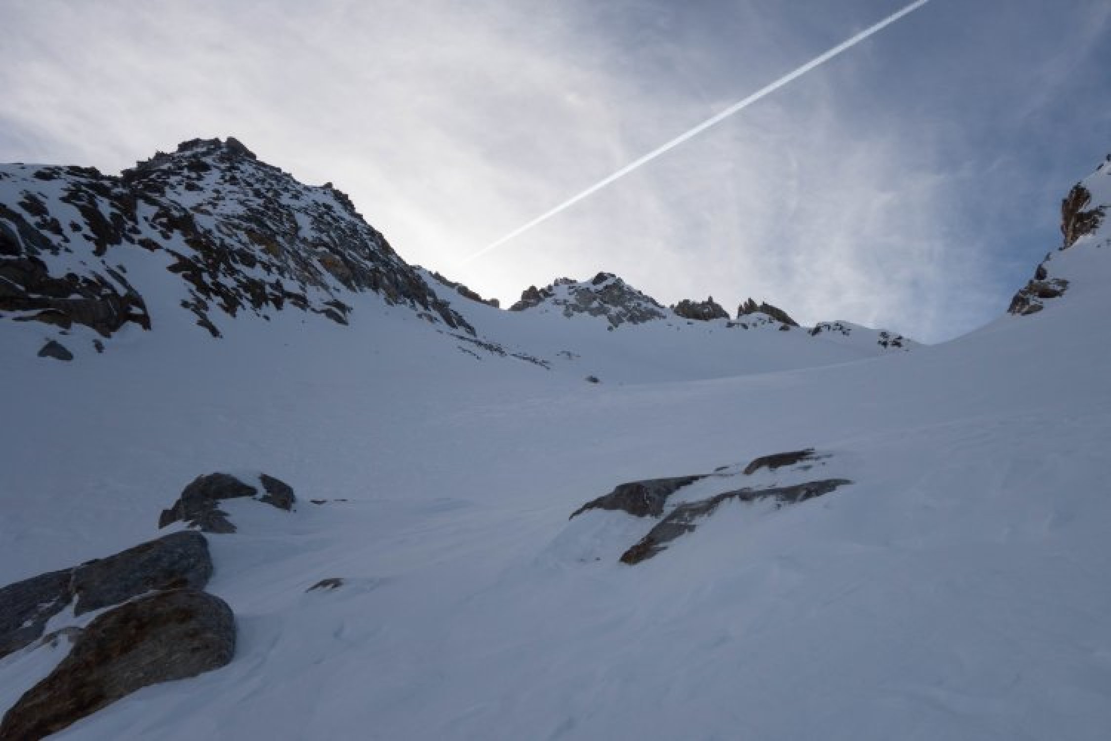 Wenig begangene, steil und spannende Tour. Anspruchsvoll im Aufstieg, da die Unterlage an den steilen Stellen hart ist. Harsteisen sind notwendig. Im Gipfelhang liegt ausreichend Schnee, sodass bis zum Gipfel mit Skis gegangen werden kann.