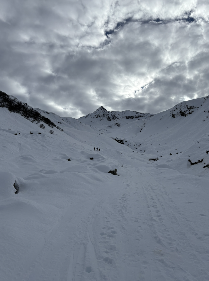 Wenn es wo Schnee hat, dann am Hinterberg :-) Ab Parkplatz Skilift durchgehende Schneedecke bis zum GIpfel - nur der kleine neue Tunnel unter dem stets obligatorischen Lawienenkegel und ein kleiner Bachübergang erfordern ein kurzes Abschnallen der Ski. Wetter heute bewölkt und eher diffuse Lichtverhältnisse. Ab Ende des Güterwegs neue Spur angelegt, da alte Aufstiegsspur entweder eingeweht oder garnicht geländeaffin gespurt war. Abfahrt erste beide Hänge Windharsch, ab 2.500 rund 400 Hm Pulverschnee (mit einer minimalen Harschschicht, die beim Fahren nicht störte). Danach eher Bruchharsch und etwas ruppiger Güterweg zurück nach Gargellen. Letzte Meter vom Winterwanderweg zum kleinen Skilift über die steindurchsetzte Alpewiese wird zunehmend schneearm und ist die Challenge des Tages :-) Piste dann wieder bis zum Parkplatz bestens präpariert.