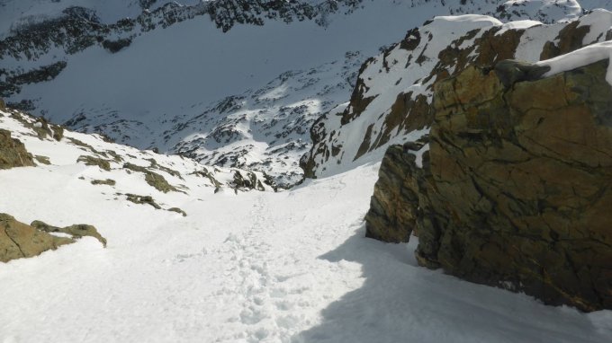 Es gab von Cresta hinauf ins Täli kaum Schnee, jedoch viele gemeine Wassereisplatten, die vor allem beim Rückweg zur Achtung mahnten (wir brachen noch im Dunklen in Cresta auf und kamen erst im Dunkeln wieder zurück). Im Täli ab ca. 2.200 gingen wir durch die geschlossene Schneedecke bis zum Gipfel. Der Schnee war sehr unterschiedlich und wir mussten meistens stapfen. Eine tragfähige Schneedecke - was uns lieber gewesen wäre - gab es fast nicht. Die 13 Stunden Tourengesamtzeit lässt sich so erklären. Wir hatten aber einen herrlichen Tag und für diese Höhe war waren die Temperaturen angenehm. Lediglich im Couloir zum Täligrat war es wie im Kühlschrank und auf dem Gipfel machte sich mit der Zeit ein ungemütlicher Wind bemerkbar. Es blieb jedoch ausreichend Zeit für eine Gipfelrast, bei der wir die grandiose Aussicht genießen konnten. Die Schlüsselstelle im Südcouloir war vereist, da seilten wir im Abstieg ab.