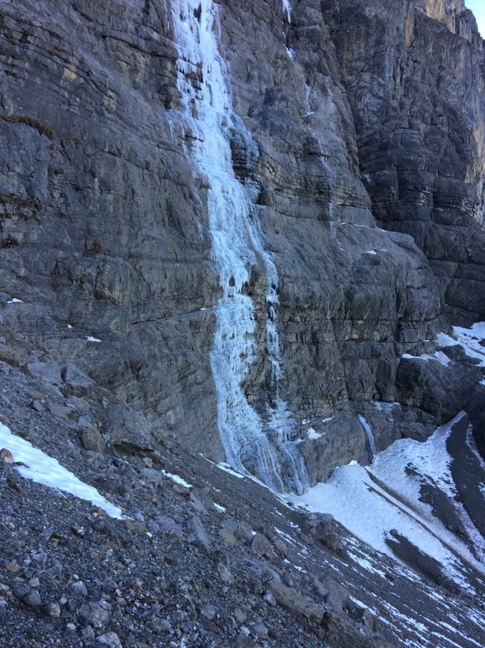 Die Säule existiert nicht - aber es läuft viel Wasser. Am Vorbau kann geklettert werden, allerdings darf es unter keinen Umständen noch wärmer sein - alles Schlechte kommt beim Eisklettern ja bekanntlich von oben.