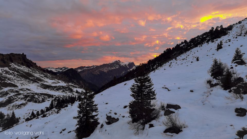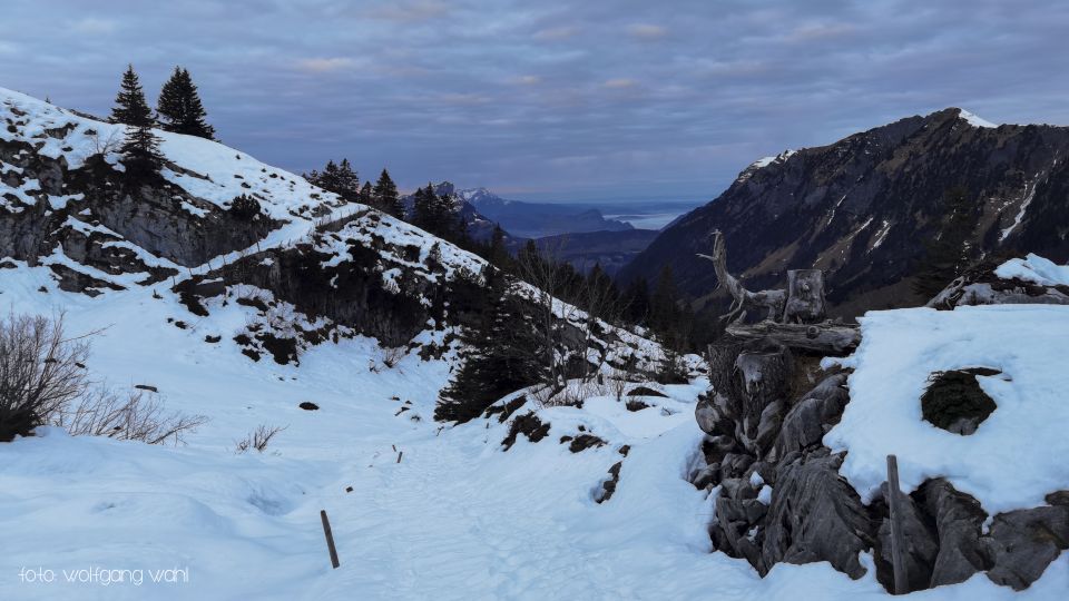 Der Wetterbericht hatte am Vorabend zwar erst am Nachmittag Bewölkung gemeldet, dennoch sehr schön mit fantastischer Stimmung am Morgen. Sehr schön, den ganzen Tag alleine quer durch die Schneelandschaft zu stapfen, bzw. brechen… ;-)