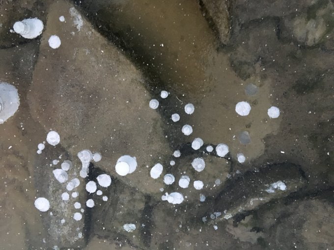 Leichter Raureif auf der Eisfläche. Nur wenige Leute. Keine Sonne auf dem See.