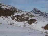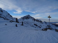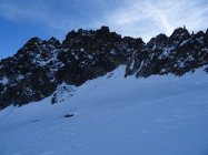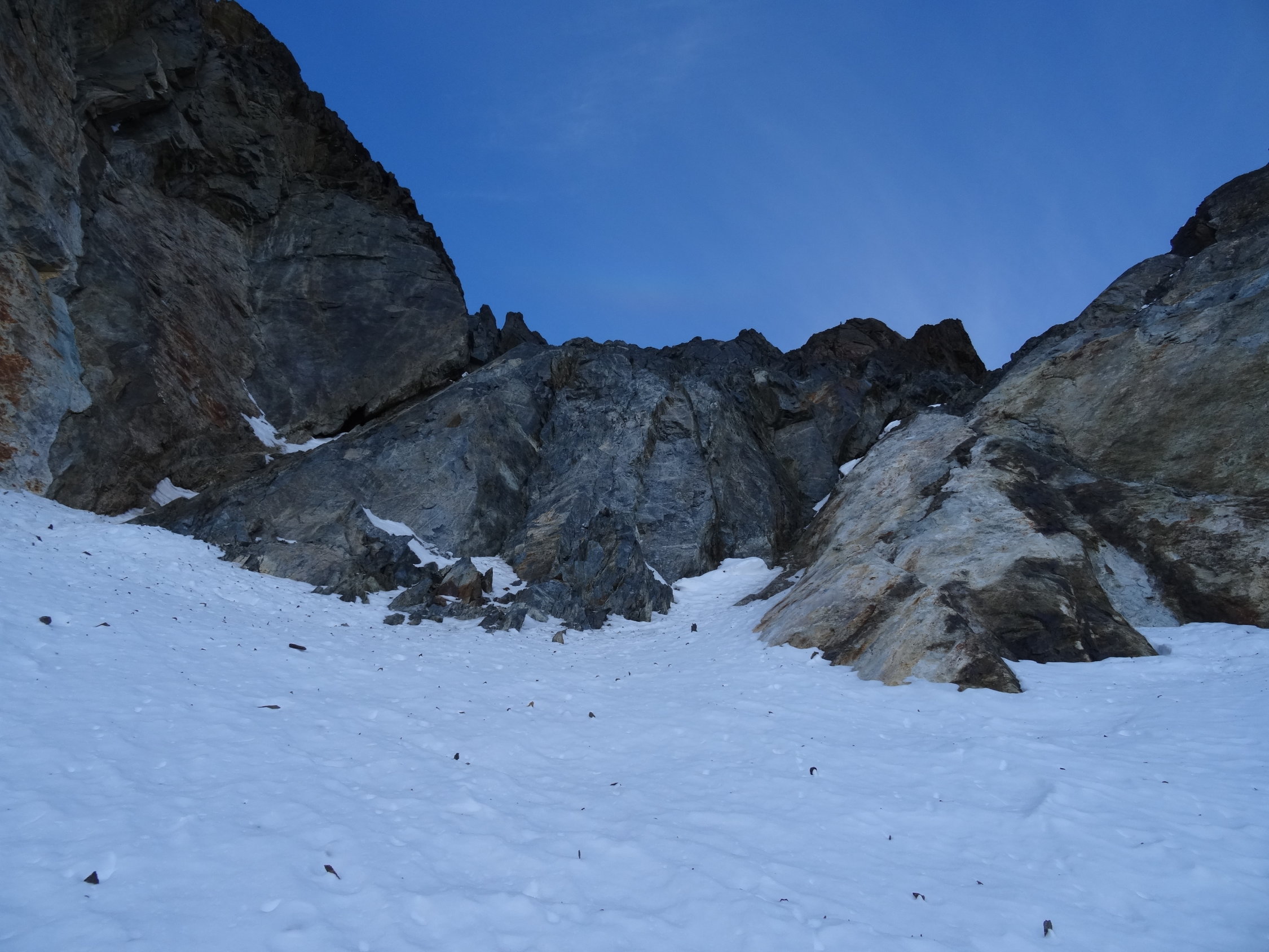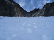 Der Einstieg vom Schnee in den Fels der Nordrinne ist die Schlüsselstelle der Tour. Zur Zeit muss eine solide Klettereinlage her, die aber keinen Fehler zulässt. Ist diese geschafft, die Schneegefüllte Rinne hoch zum Steinmann. Der Übergang von der rechten zur linken Rinne ist vom Schnee unterbrochen, was aber kein Problem darstellen sollte, wenn man es bis dahin geschafft hat.
