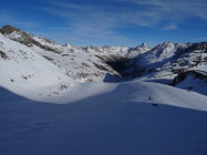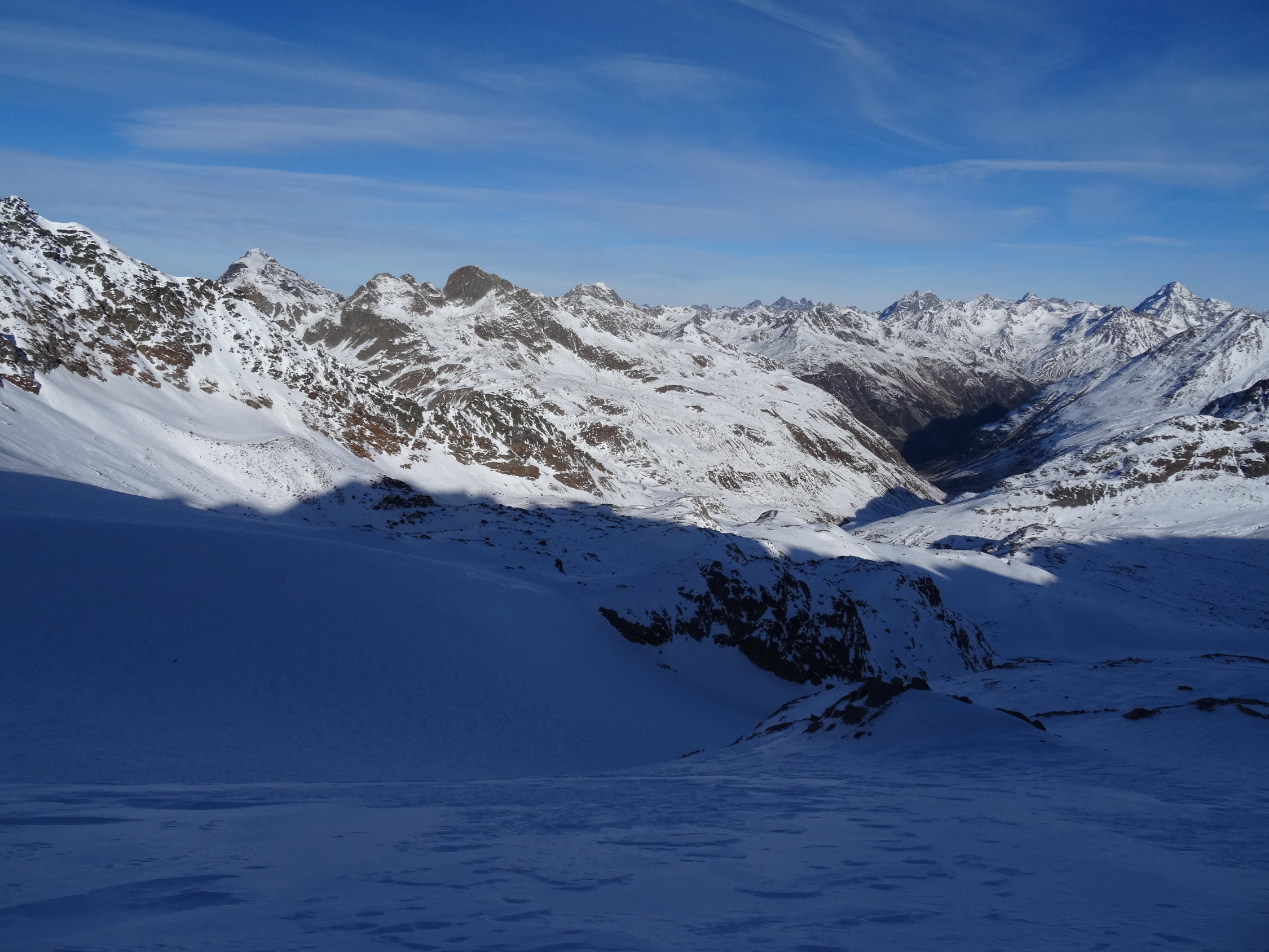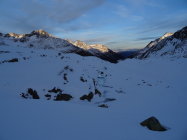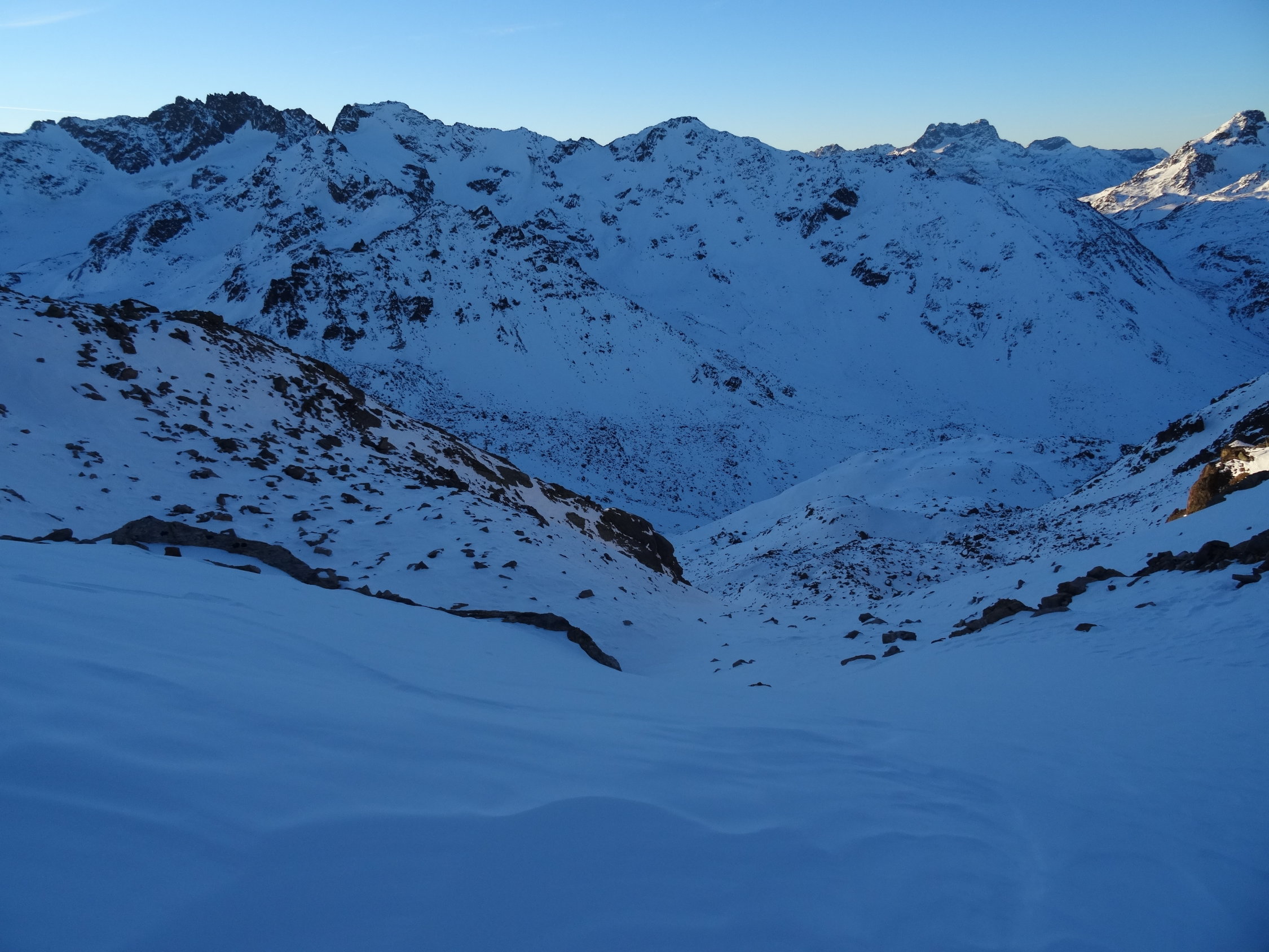 Von der Fuorcla Radönt geht es bei gemässigtem Tempo ( was bei den Verhältnissen sowiso erforderlich ist) ohne gavierendem Steinkontakt zurück zur Passstrasse.