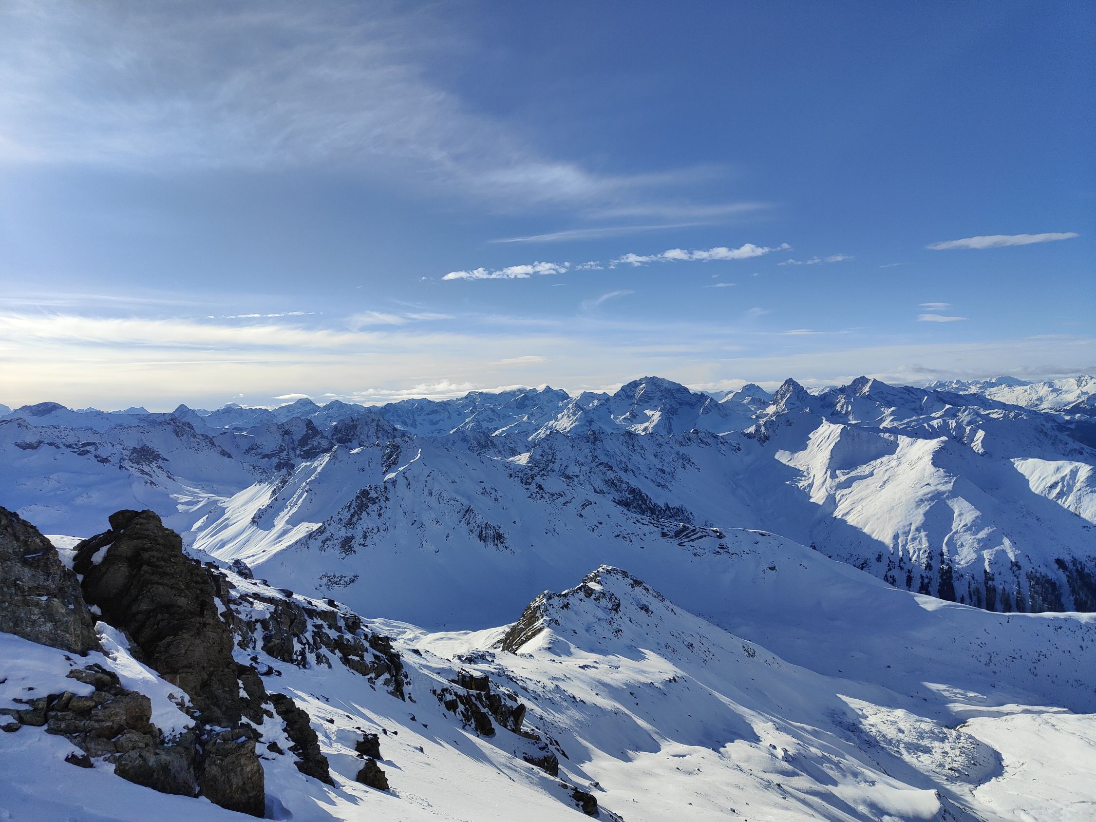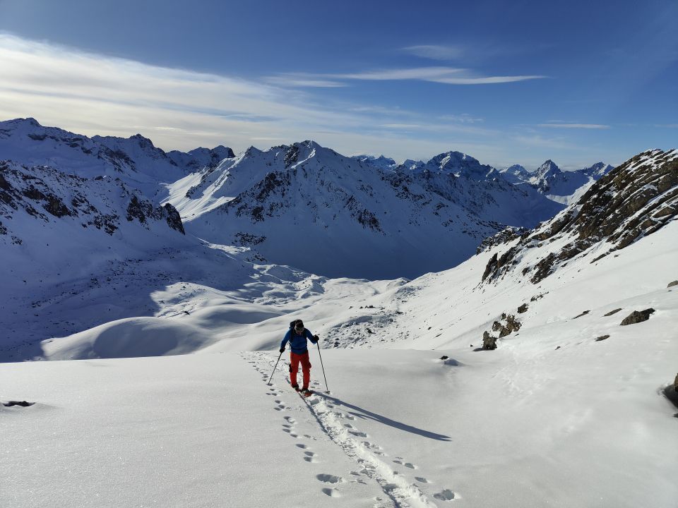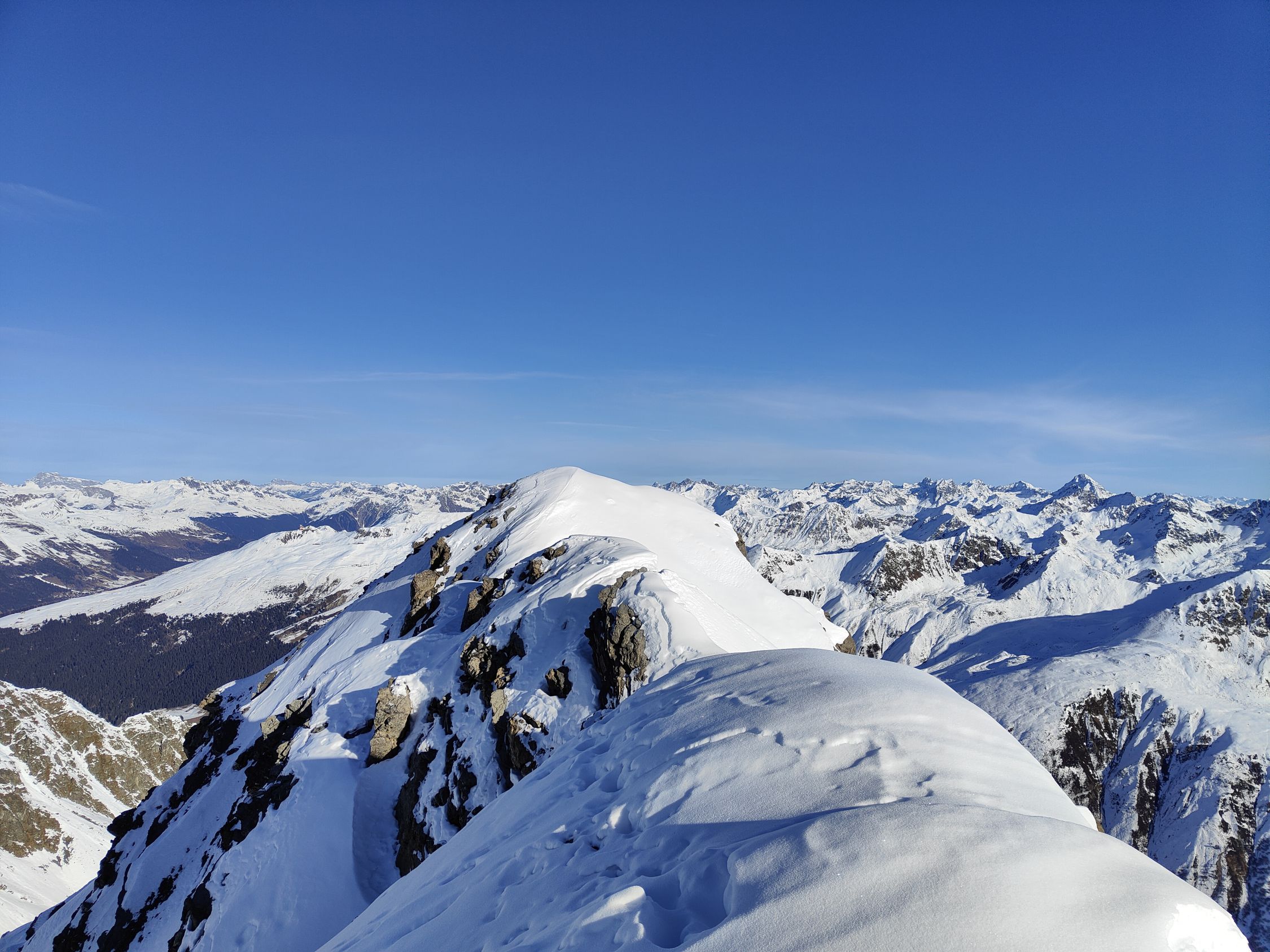 Start um ca 6:30 nach Biwak nahe der Oberalp. Eine Spur führt bis zum Gipfel, nur vereinzelt musste aufgrund von Verwehungen eine neue gezogen werden. Alles in allem überraschend gute Verhältnisse. Es liegt einfach sehr wenig Schnee. Entgegen der Meinung des Wetterberichts herrschte den ganzen Tag Sonnenschein. Abgesehen von uns war an diesem Prachtstag keine Menschenseele am Berg. Der Südhang zum Älplihorn wird im Verlauf des Tages immer aufgeweichter. Der Grat ist etwas verwechtet, mit nötiger Vorsicht aber gut zu begehen. Der Hauptgipfel wurde bis jetzt nicht betreten. Auch wir haben diesen heute sich selbst überlassen und begnügten uns aufgrund der Verhältnisse mit dem Vorgipfel. Wunderschöne Tour auf einen erstaunlich ruhigen 3000er inmitten der Bündner Bergwelt!