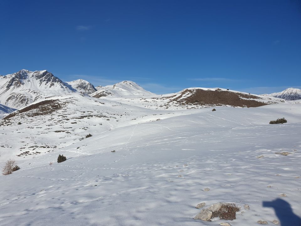 Heute brauche ich unbedingt wieder einmal etwas Sonne. Und da es an den Schattenhängen sowieso nicht besonders viel Schnee hat, habe ich schweren Herzens vernünftigerweise meine Ski im Keller gelassen und bin zu Fuss auf bester Südlage schneefrei hoch. Mit kurzen Hosen und oben Ohne ist es heute an diesem Wintertag wärmer als an vielen Tagen des Hochsommers. Heutzutage scheint mir alles etwas verkehrt zu sein? Egal, mit Tempo steige ich der Nase nach weglos und später auf dem besten Wanderweg praktisch ohne Schneekontakt weiter bis östlich von der Alp Champatsch. Bis zu P2207 nehmen die Schneeflecken dermassen zu, dass ich doch noch die Bergstiefel anziehen muss. Ich bewege mich ab hier in der Wildruhezone. Aber keine Panik, diese gilt erst vom 31.12. - 30.04.! Die Tiere wissen das, so, dass ich nur eine einzige Gämse weiter oben antreffe. Nun wandere ich nahe an der Gratkante zu P2391 und weiter ganz gemütlich via P2427 zum Mot Radond mit Steinmann.