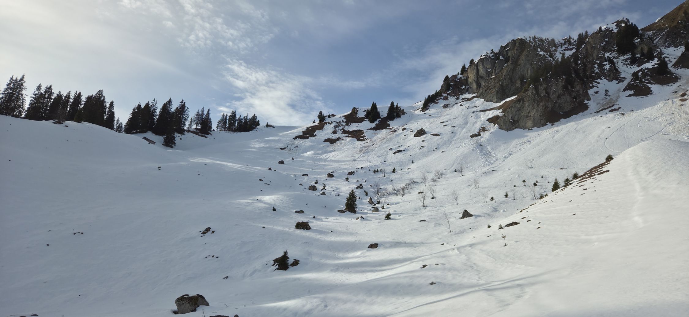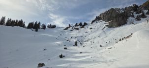 Die Hengstschlund Strasse ist mit dem Auto befahrbar. Ab P.1457 hat es Schnee im Aufstieg. Frühlingshaft gute Verhältnisse mit nur wenigen Stellen ohne Schnee. Abfahrt bis circa 1350m im harten gesetzten Schnee.