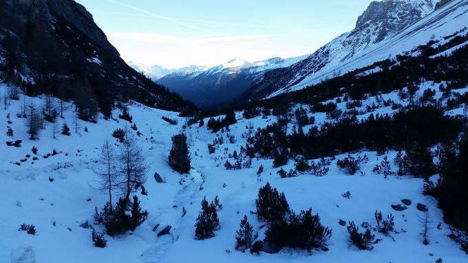 Bis Tschuccai (1'779 Hm) kein Schnee. Danach langsam zunehmend schliessende Schneedecke. Die Strasse von Val Mora wurde mit einem Traktor bis zur Alp Mora geräumt. Die Strasse ist jedoch etwas prekär und mit dem Auto nicht empfehlenswert; sehr eisig. Im Val da Tea Fondada eher härterer und rutschiger Schnee vorgefunden. Harscheisen empfehlenswert.