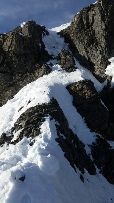 Der Grat wurde von mir gespurt und ist nun wohl wegen den neuen Schneefällen wieder zu machen. Hier Steigeisen mitnehmen.