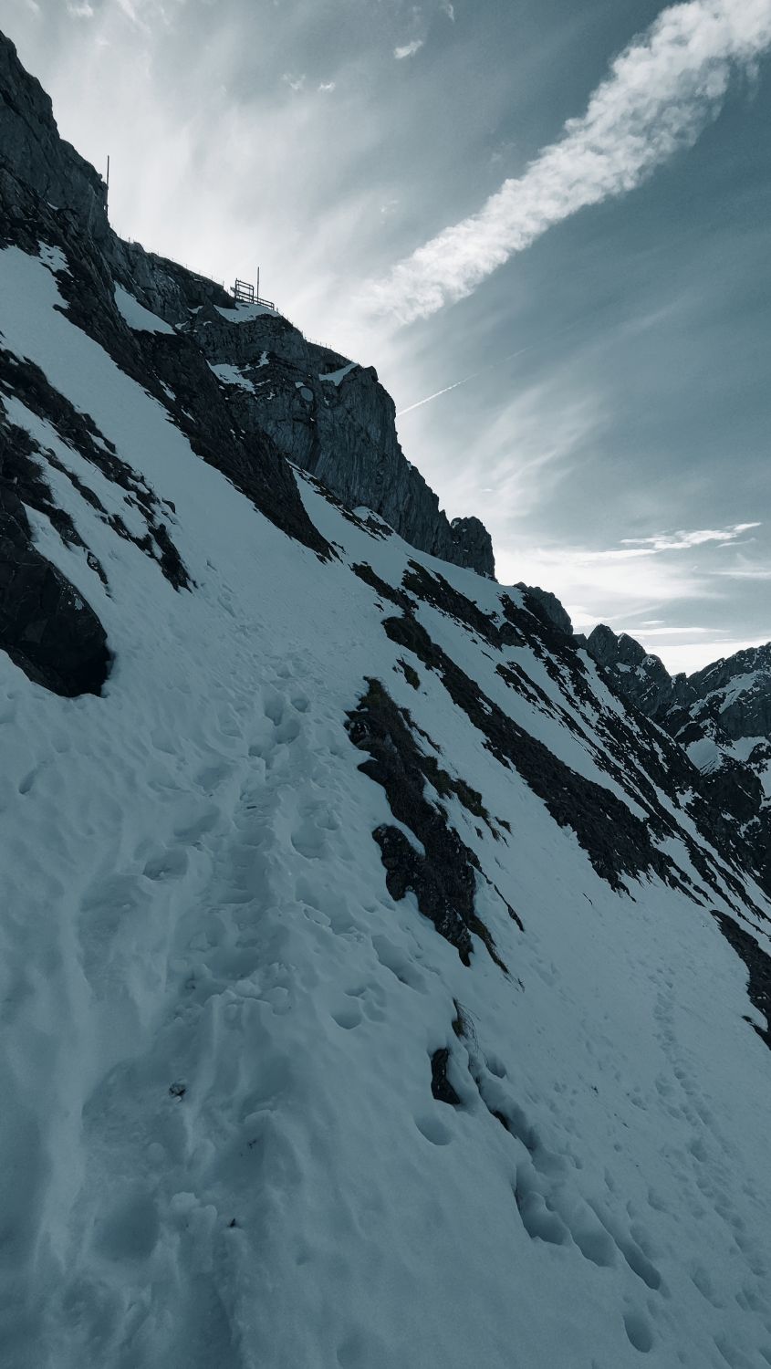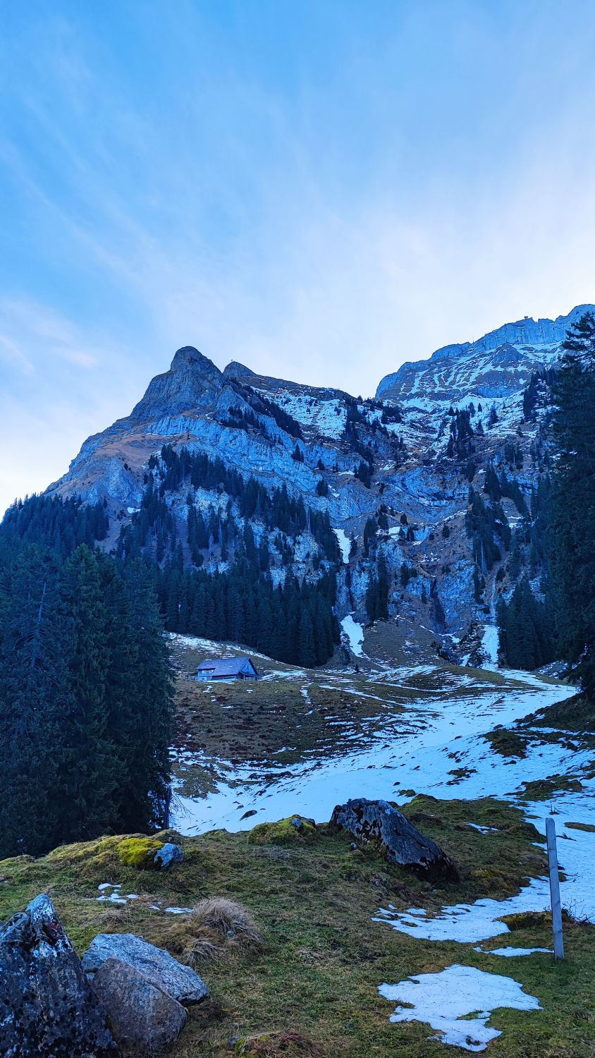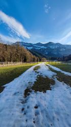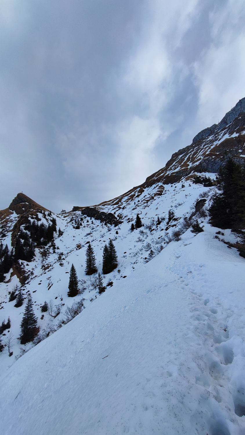 Gut, da wenig Schnee. Bei normaler Schneelage nicht machbar. Aktuell recht gute Verhältnisse. Ab Einstieg Heitertannliweg wechselweise Schnee und trockene Passagen, ab 1700m dann durchgehend Schnee, gute Spur bis ganz oben.