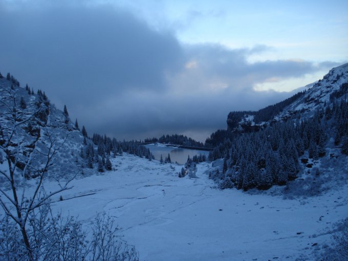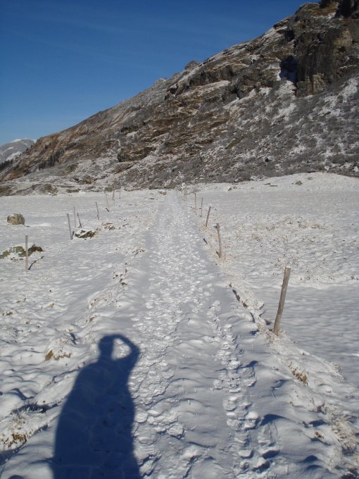 Um die Eisflächen in den Steilstellen nach den Hütten zum umgehen, bin ich auf der Schattenseite des Tales abgestiegen. Dort hat es kein Eis.