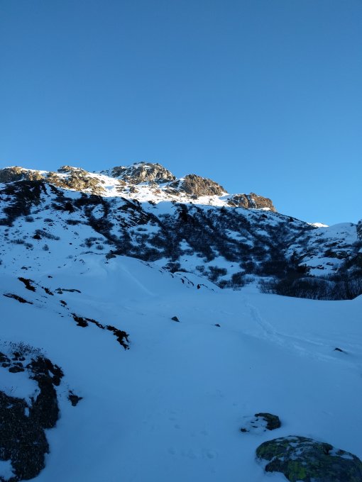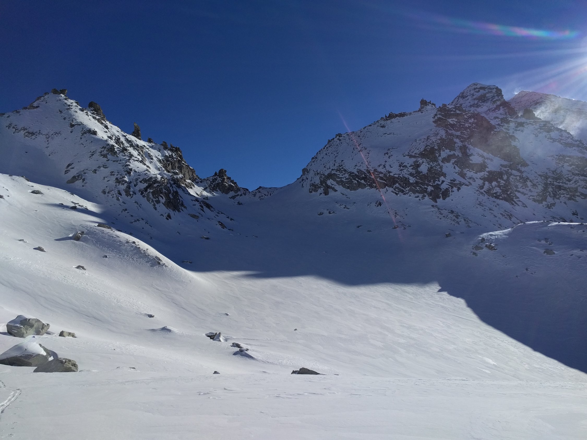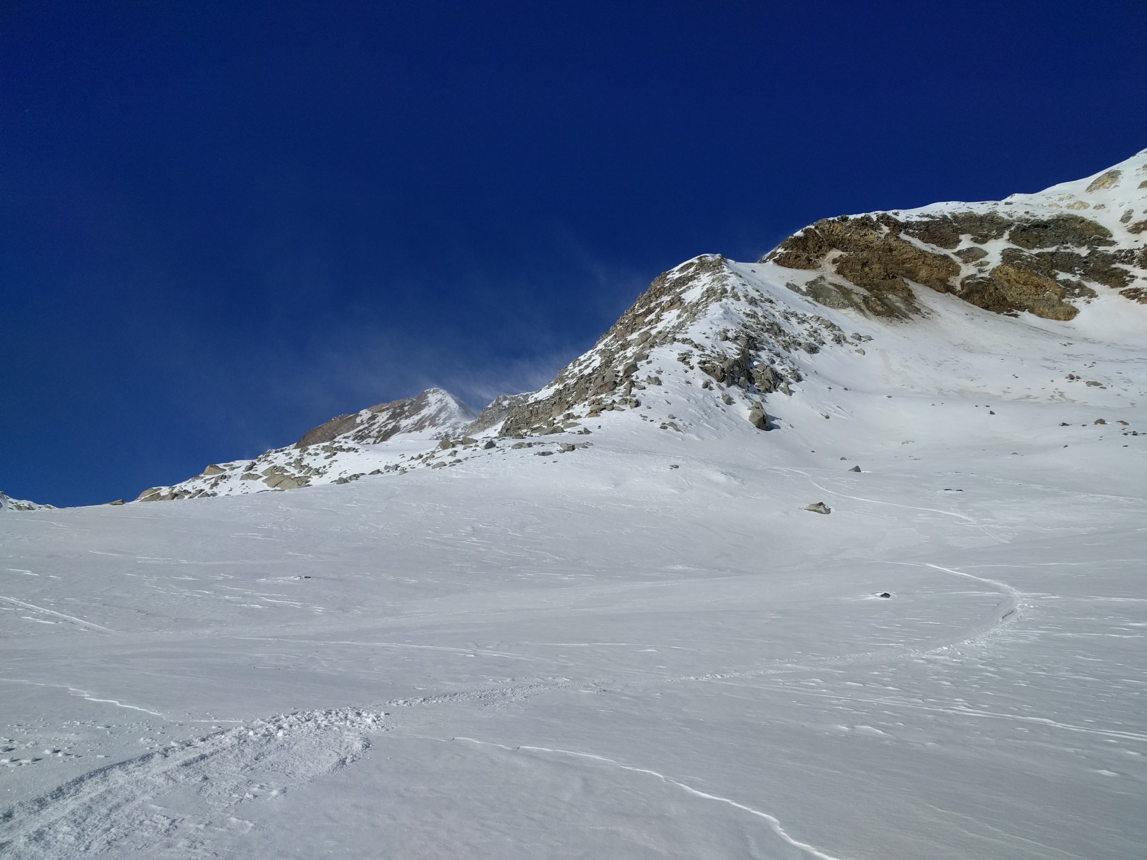 Direkt unter dem Mittlebergpass dann leider kehrt gemacht. Aufstieg wäre möglich, evtl. mit Ski+Harscheisen, vermutlich eher Pickel und Steigeisen da gefroren und eine Wechte zu überwinden ist.