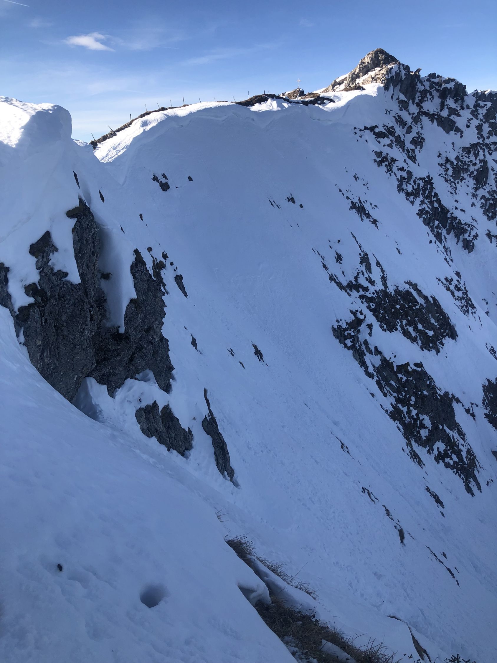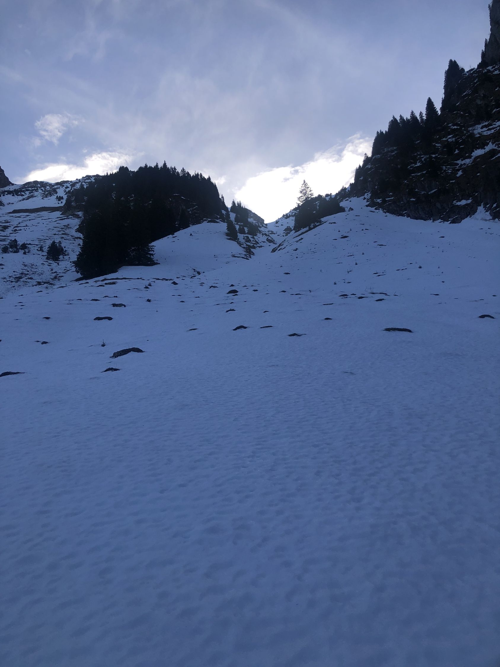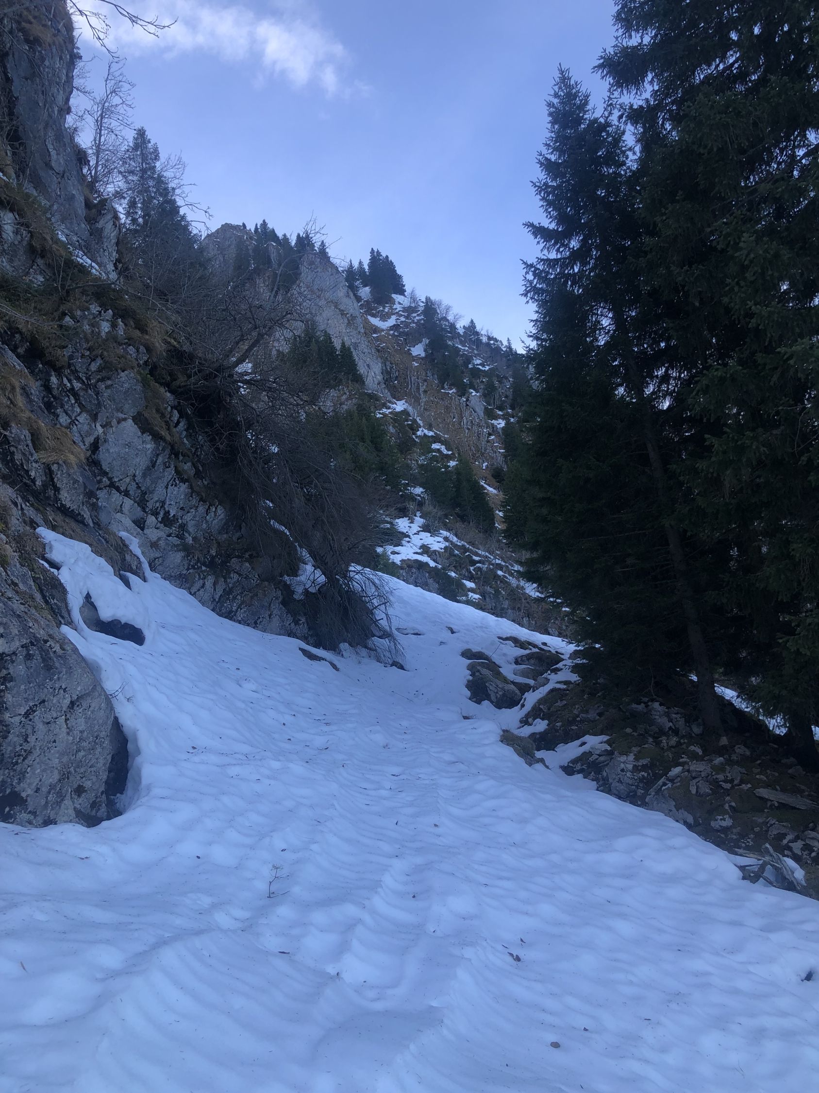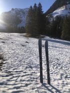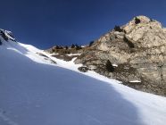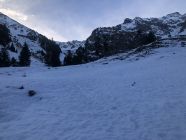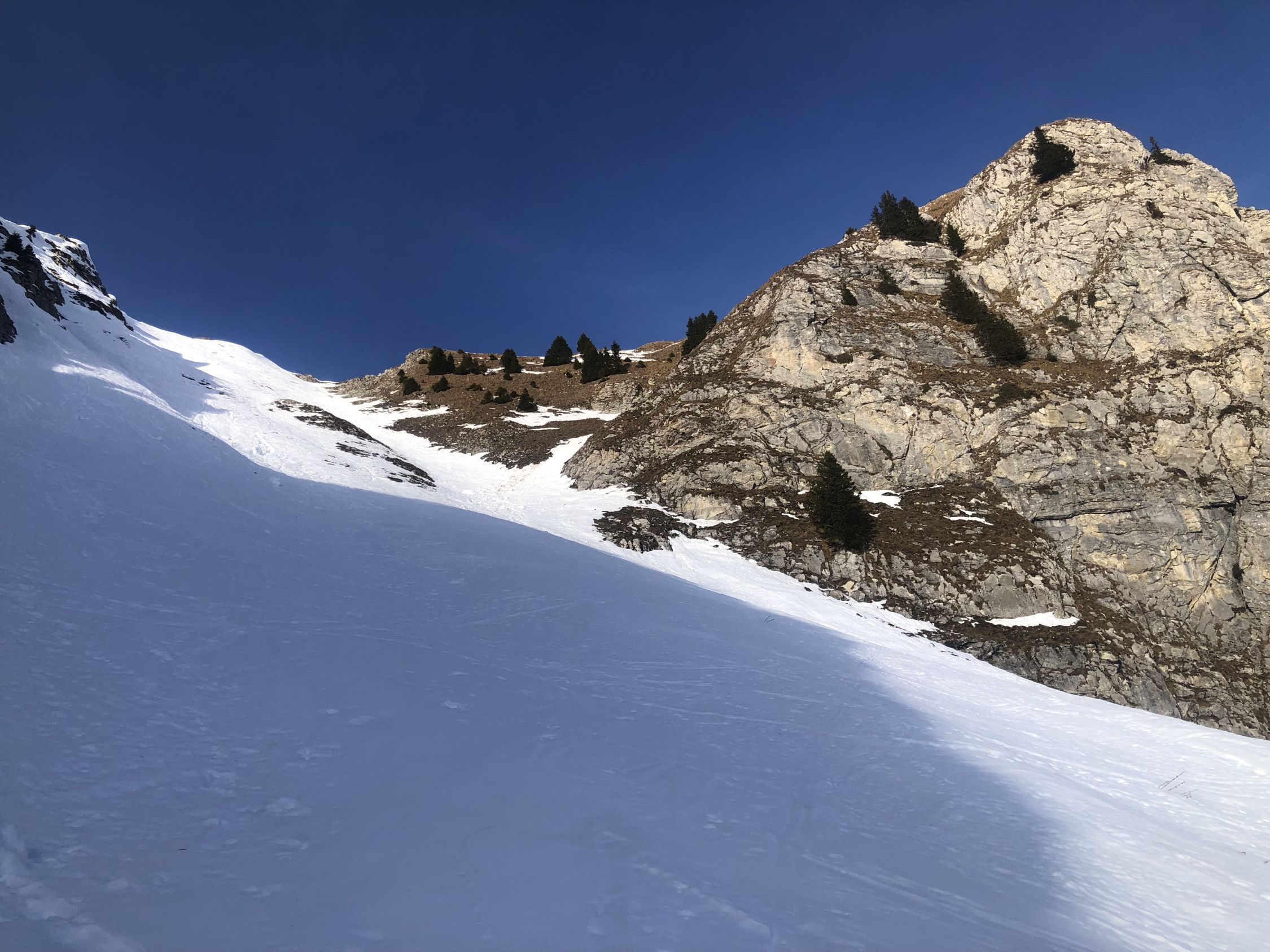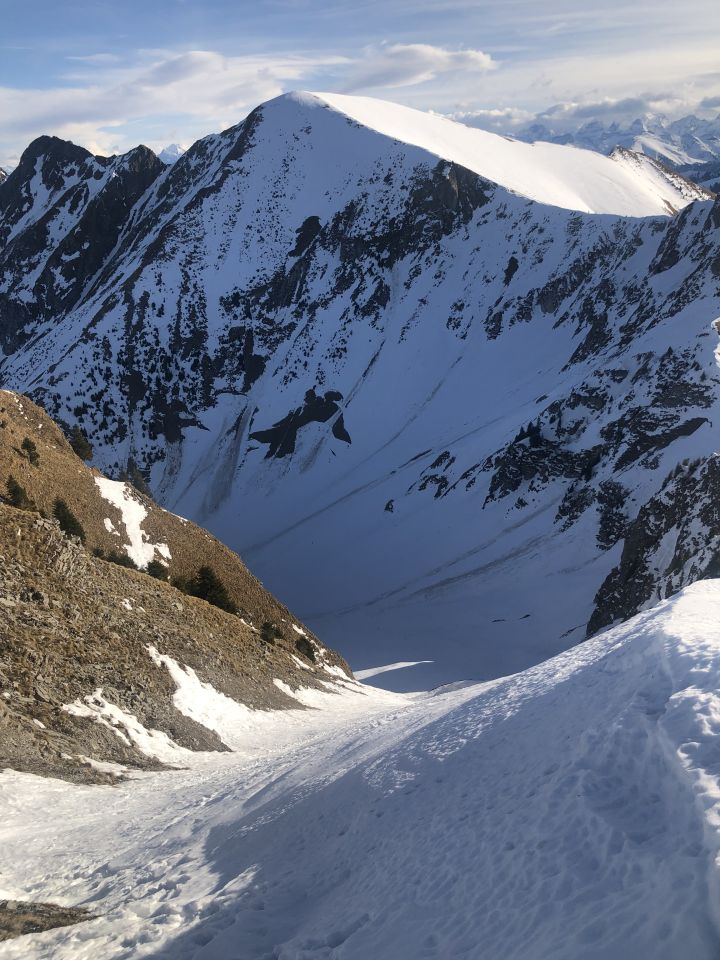 Zur Schneelage: ab ca. 1360 Schuhwechsel auf Ski, habe bis hier Wanderlatschen verwendet. Bis zur kleinen Brücke auf ca. 1365 ist der Schnee knapp durchgehend, nun westlich des "Seebergbachs" die Alp Seeberg erreichen. SSE ausholend erst westlich des markanten Graben Höhe gewinnen und auf ca. 1580 den Graben auf die E-Seite queren. Das Gelände ruppig, die Spitzkehren eng und ab Pt. 1716 gehts einfacher. Im oberen Drittel des Couli dann Harscheisen gesetzt bis Ausstieg. Der Grat bis Gipfel zu Fuss.