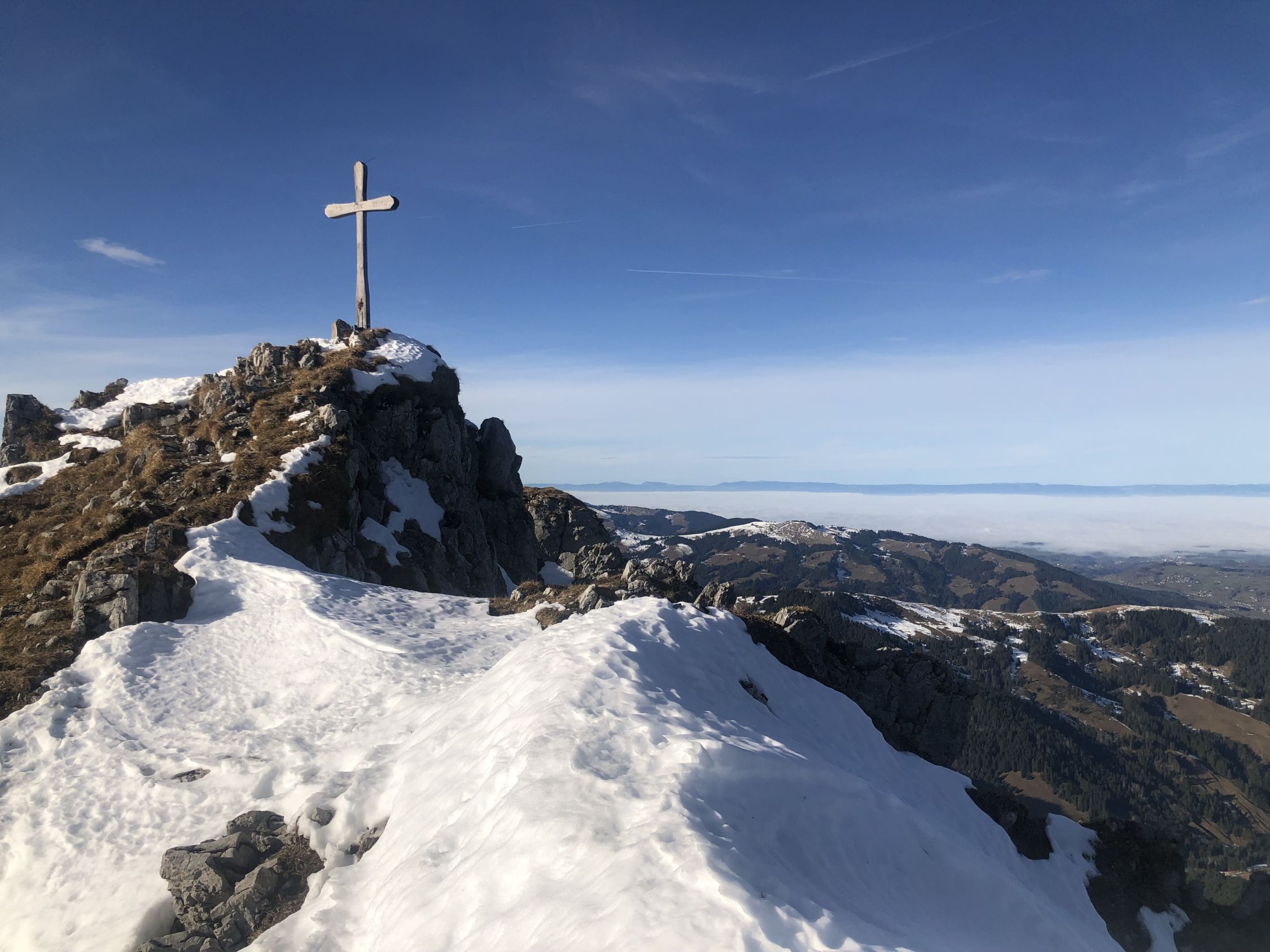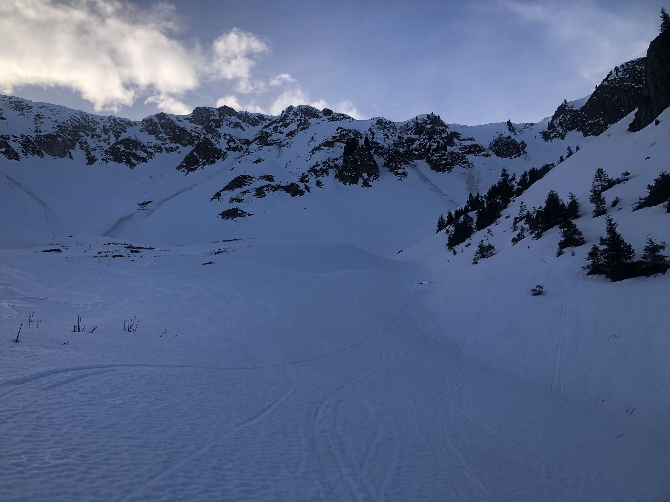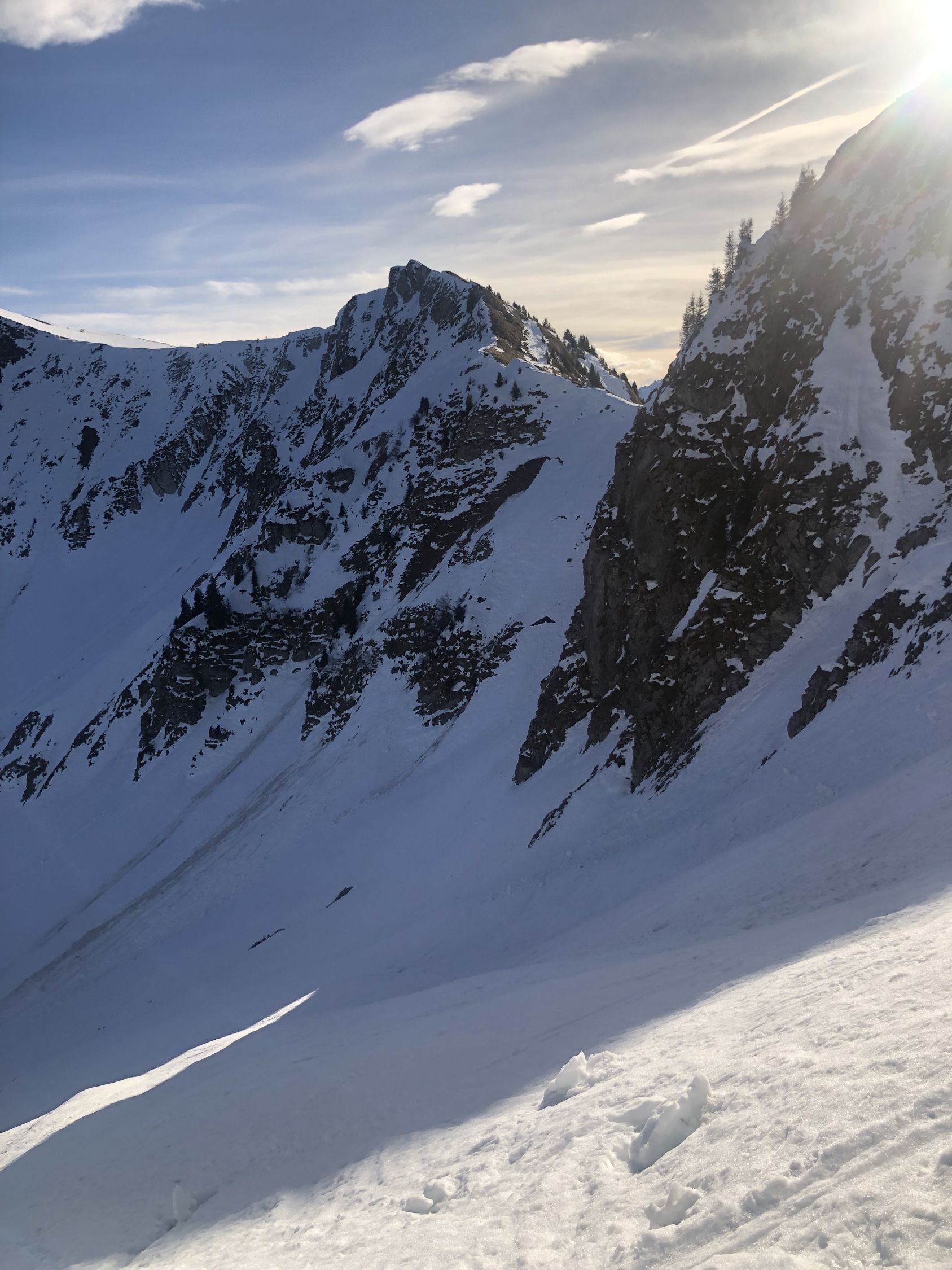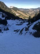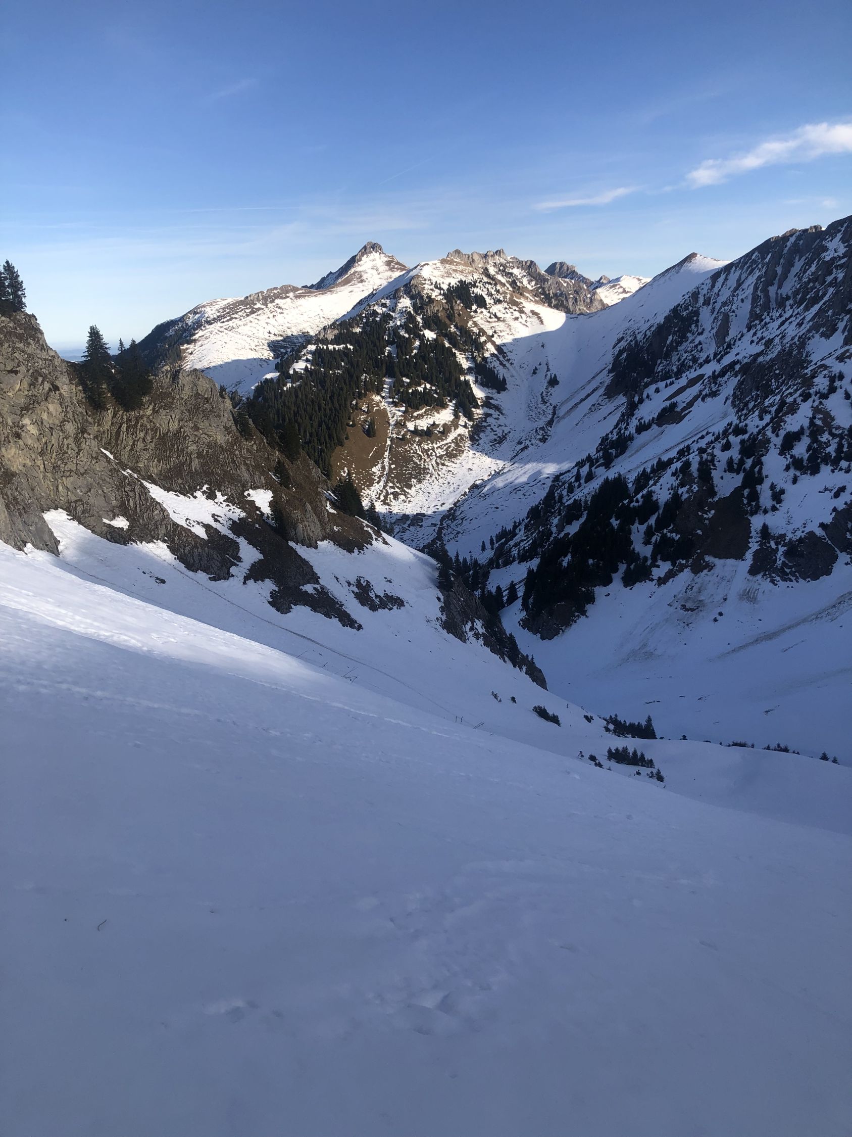 Zur Schneelage: ab ca. 1360 Schuhwechsel auf Ski, habe bis hier Wanderlatschen verwendet. Bis zur kleinen Brücke auf ca. 1365 ist der Schnee knapp durchgehend, nun westlich des "Seebergbachs" die Alp Seeberg erreichen. SSE ausholend erst westlich des markanten Graben Höhe gewinnen und auf ca. 1580 den Graben auf die E-Seite queren. Das Gelände ruppig, die Spitzkehren eng und ab Pt. 1716 gehts einfacher. Im oberen Drittel des Couli dann Harscheisen gesetzt bis Ausstieg. Der Grat bis Gipfel zu Fuss.
