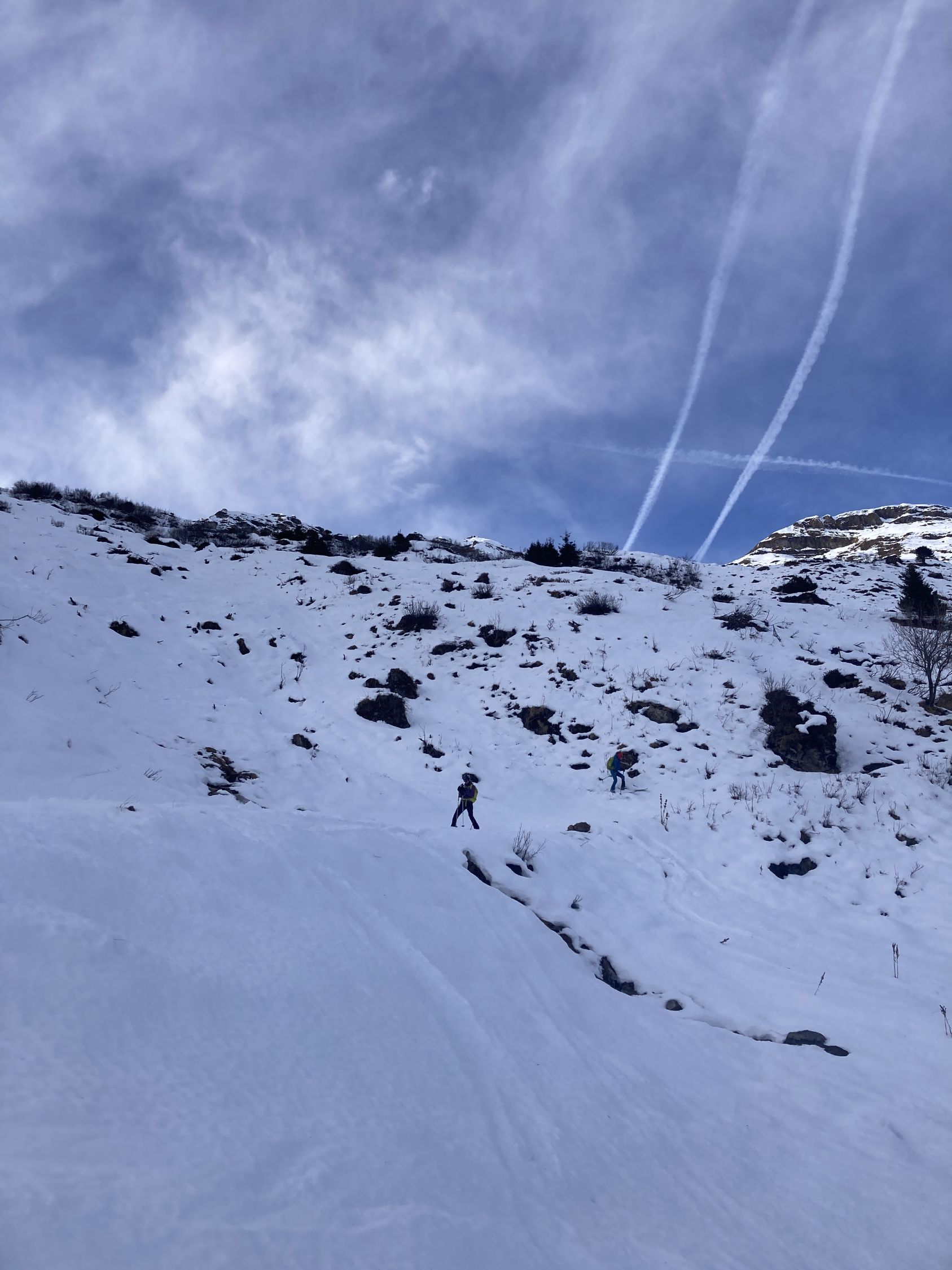 Abfahrt direkt über die Osthänge. Der Schnee ist fahrbar und etwas heimtückisch. Mal trägt er, mal bricht man durch, mal ist er griesig feucht. Steinkontakt nur beim Alpstofel. Hier empfiehlt sich, die obersten Hänge auf dem Weg zu umfahren.