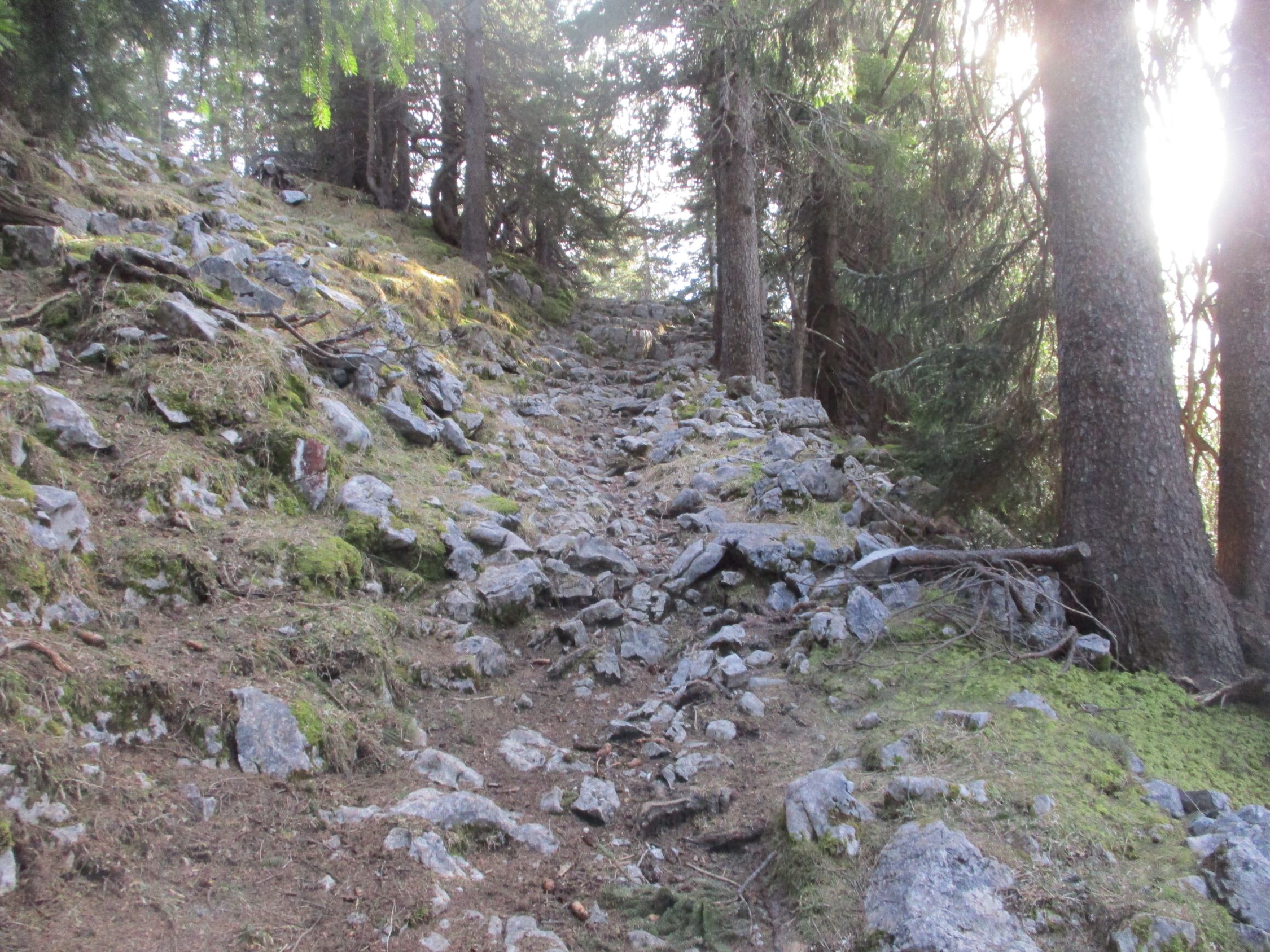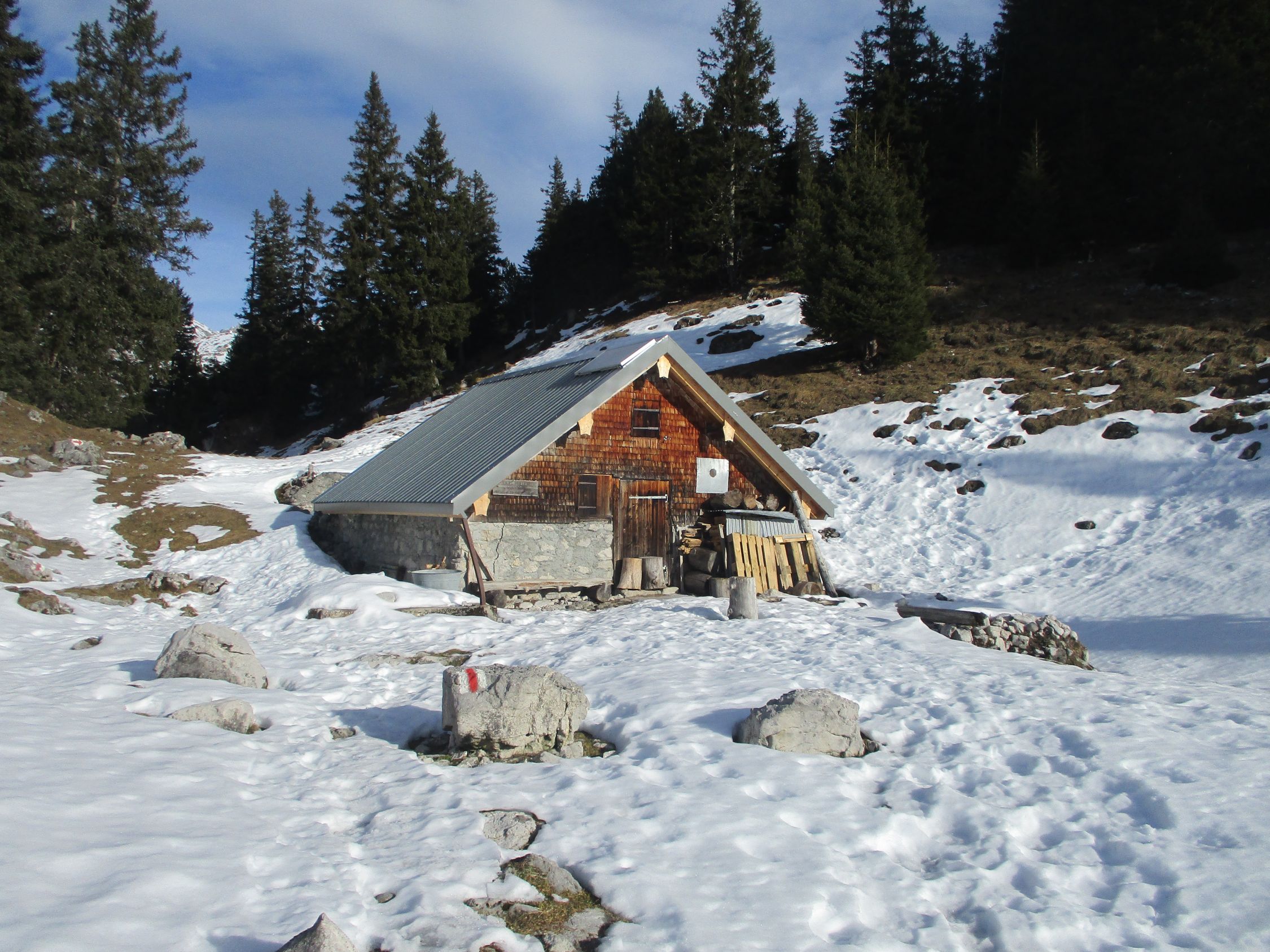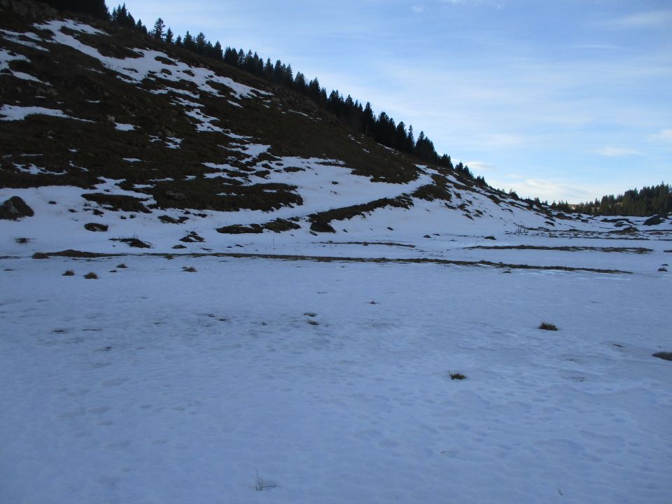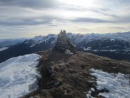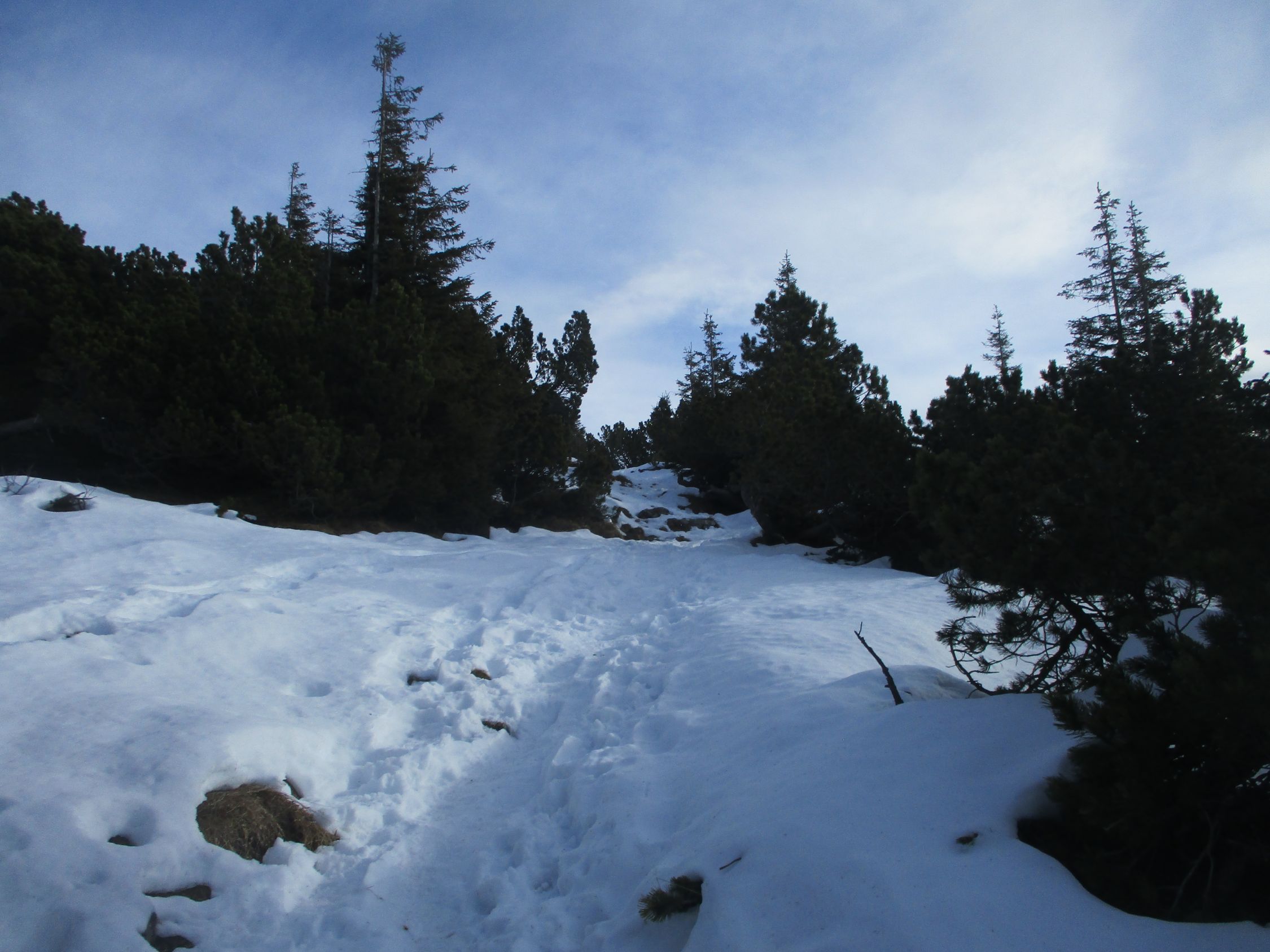 Wegezustand: bis zur großen Lichtung auf etwa 1730 m wechselten sich apere und schneeige Passagen. Ab besagter Lichtung bis Gipfel auf hartgetretener Winterspur - tragend, aber etwas rutschig.