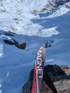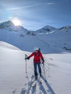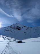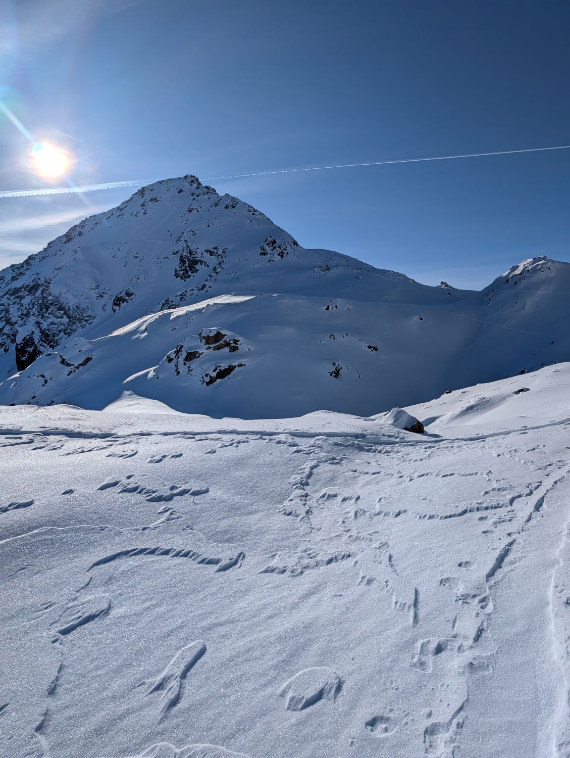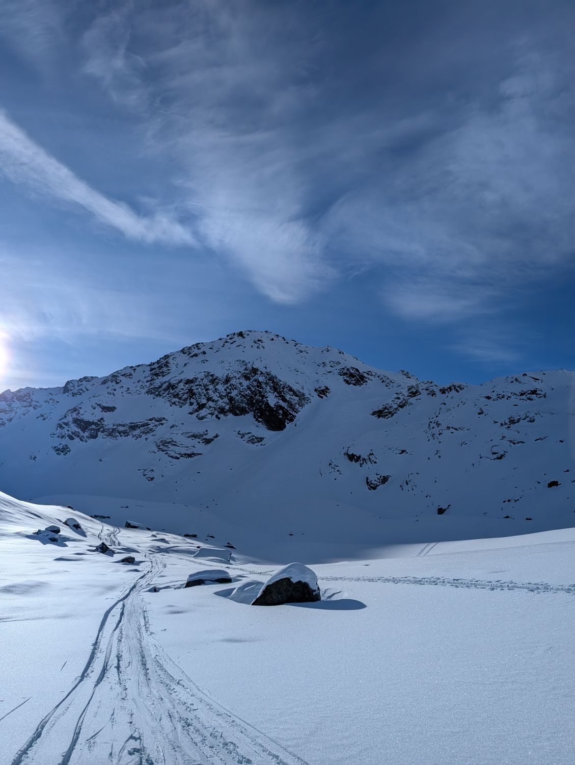 Es hat ab der Passstrasse knapp genügend Schnee. Aber gegenüber am Flüela Weisshorn geht gar nichts. Der Schnee hat einen unterschiedlich starken Deckel. In den flacheren Stellen recht gut zu fahren. Wir sind vom Gipfel direkt in die steile Nordflanke. Hier leider meist Deckel und zum Teil versteckte Steine. Mit Vorteil alte Steinskis verwenden.