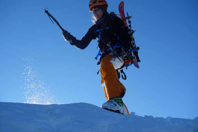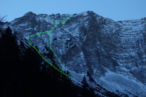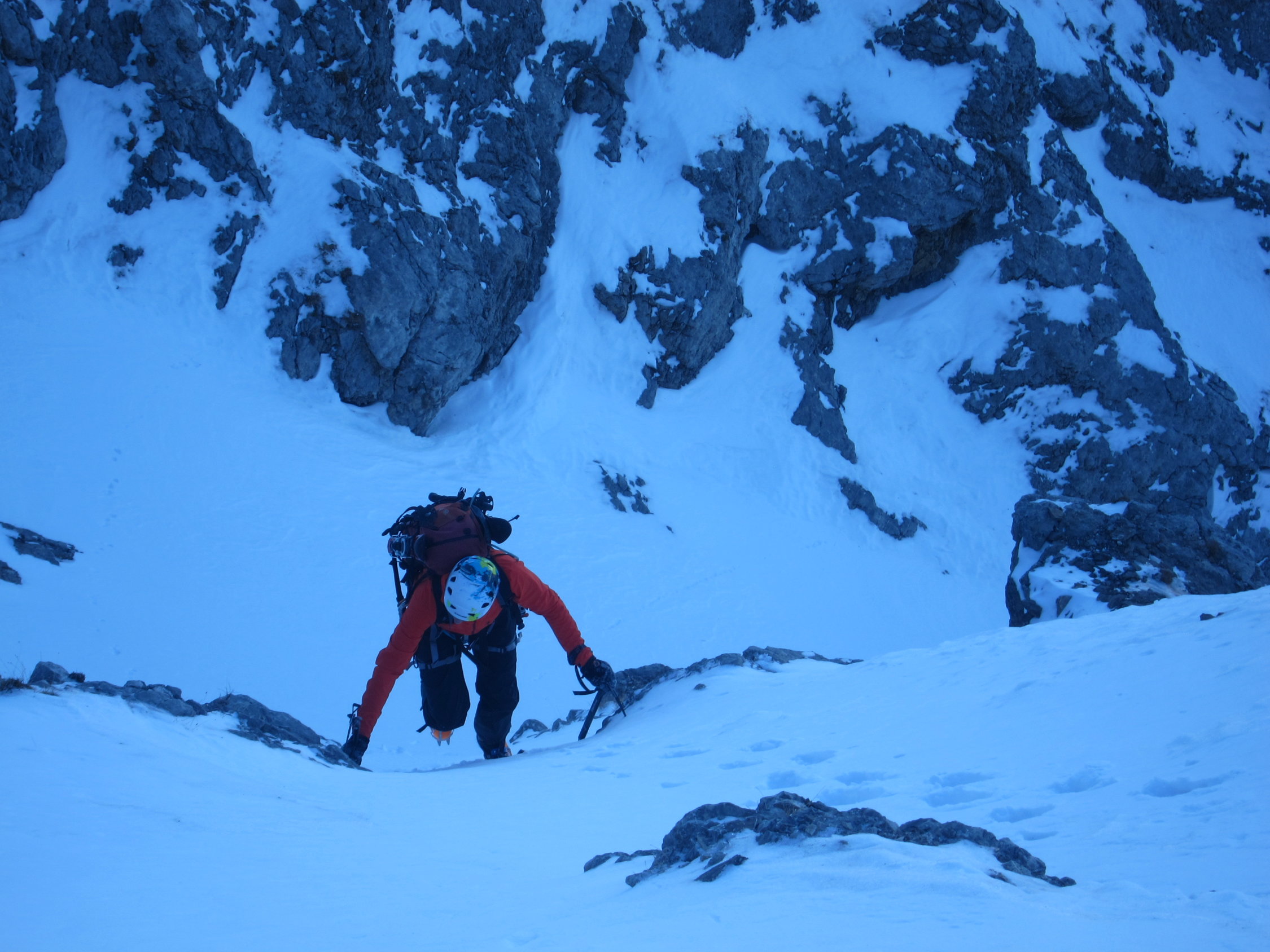 Die schneearmen aber sicheren Verhältnisse für eine nette Nordflanke genutzt. Auf unserer Linie reicht ein Handgerät und Steigeisen. Seil blieb im Rucksack. 3 3/4 Stunden von Untergarten zum Gipfel.