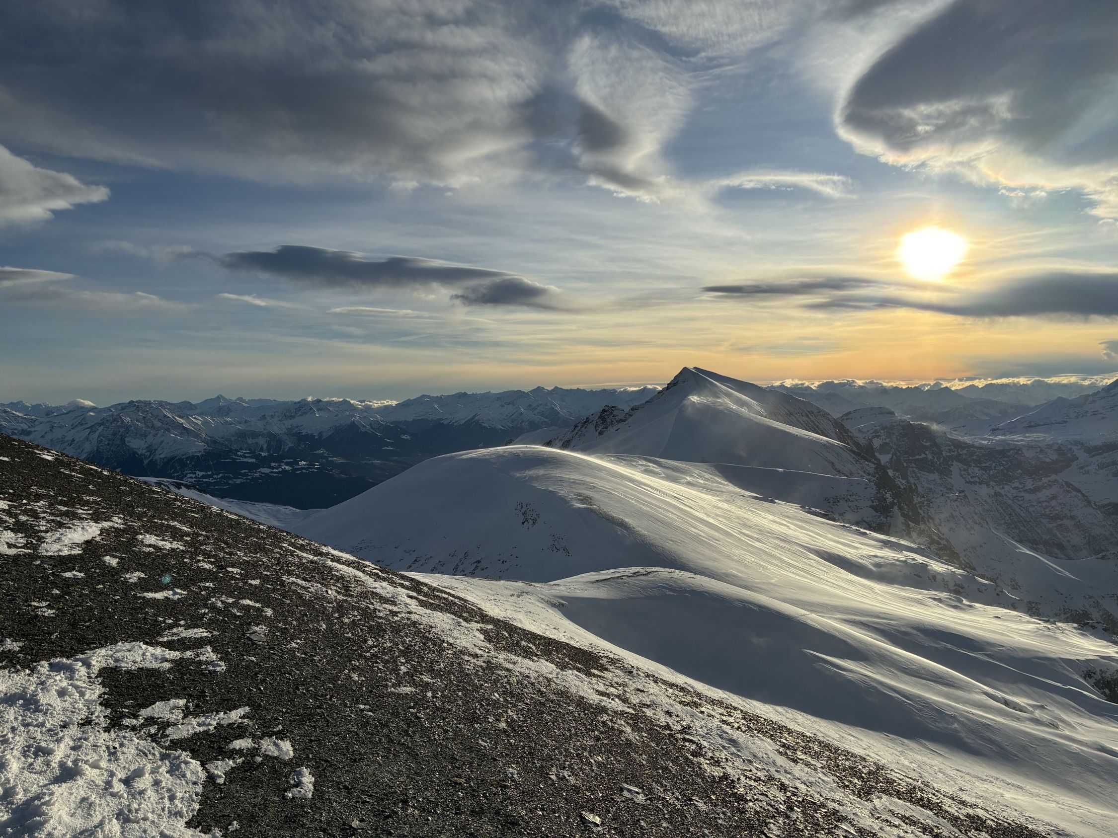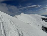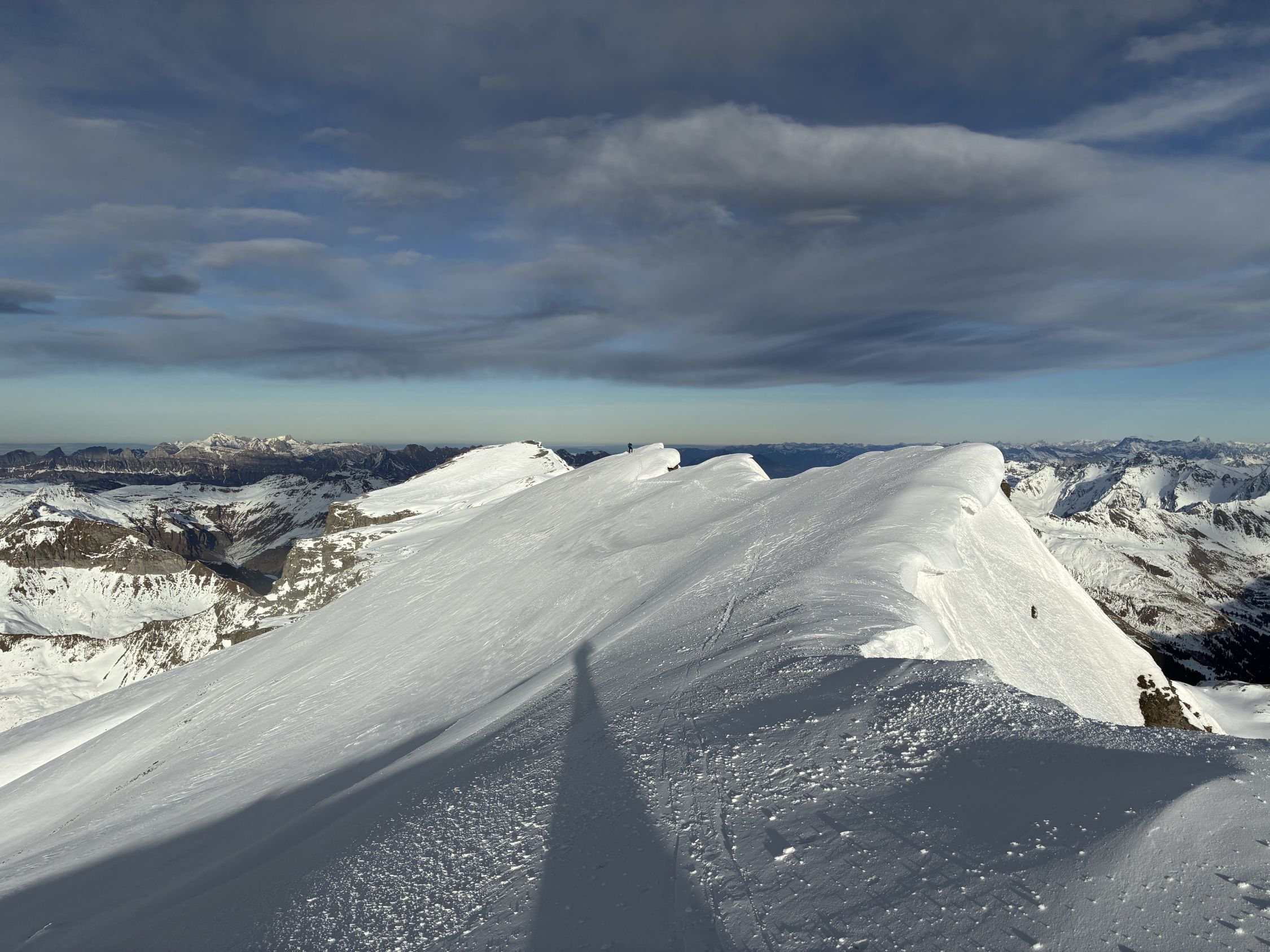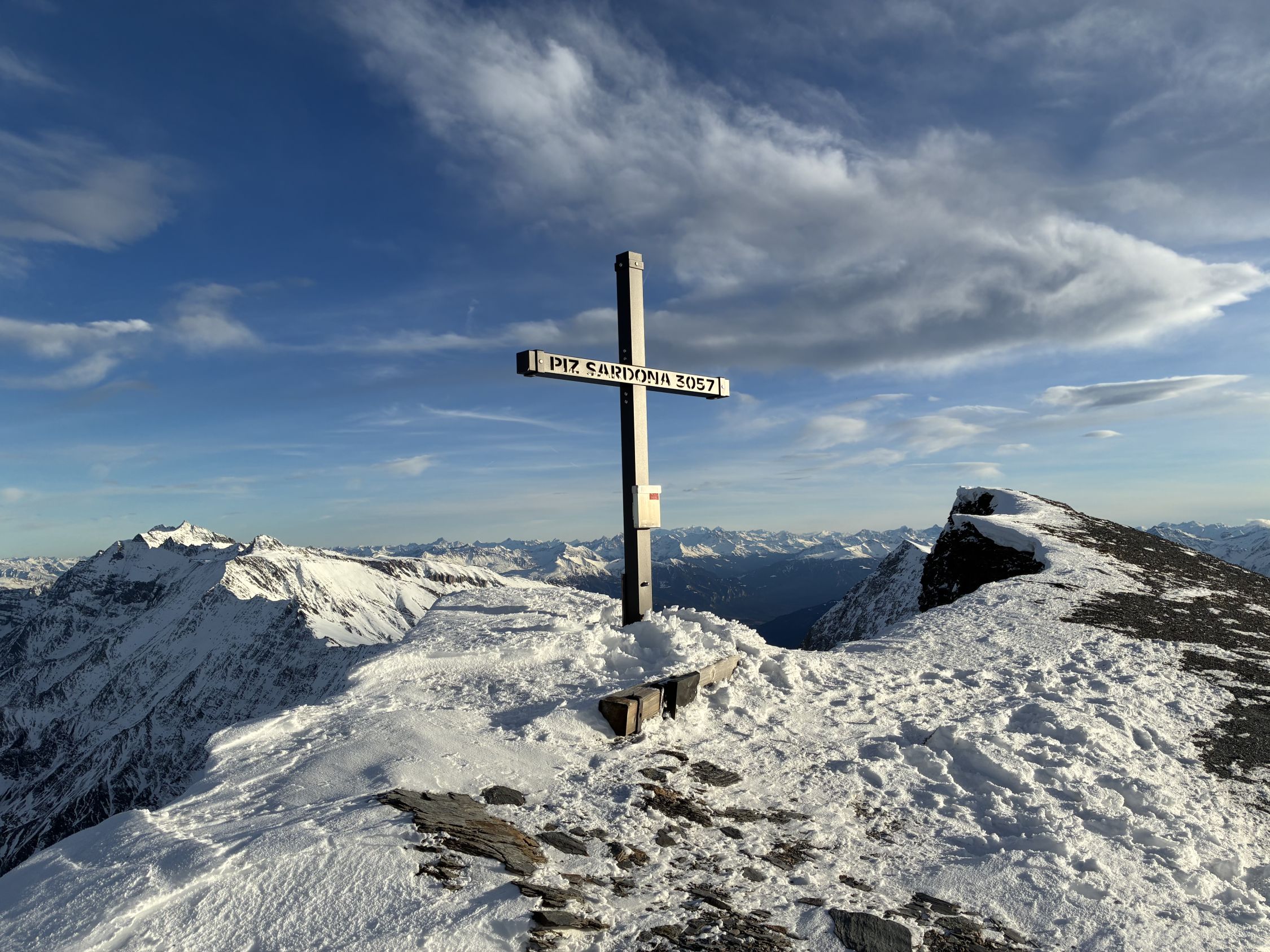 Start Nagens 9 Uhr bei 0°C. Hier nahezu windstill, gute Sicht. Segnas/Sardona in Wolken. Gesamthaft recht brauchbare Schneeauflage, hart aber fast immer griffig. Harscheisen wurden aktuell ab P2116 im Aufstieg zum Piz Dolf als auch für den Zustieg zum Piz Segnas ab Surenjoch benötigt. Am Piz Dolf aufgrund durchziehender Wolkenfelder sehr diffuse Sicht, ab etwa Mittag dann durchgehend gute Sicht. Wind mit zunehmender Stärke, im Bereich Surenjoch in Böen bis 80 km/h. Hier eher unangenehm. Gipfelbereiche teils abgeblasen, stellenweise kurze Portagen sinnvoll. Kurz (gutmütiger) Deckel in der Abfahrt zum Sardona-gletscher. Sonst eigentlich überall tragend. Erstaunlich gute Schneeverhältnisse in Anbetracht der generellen Schneearmut.