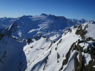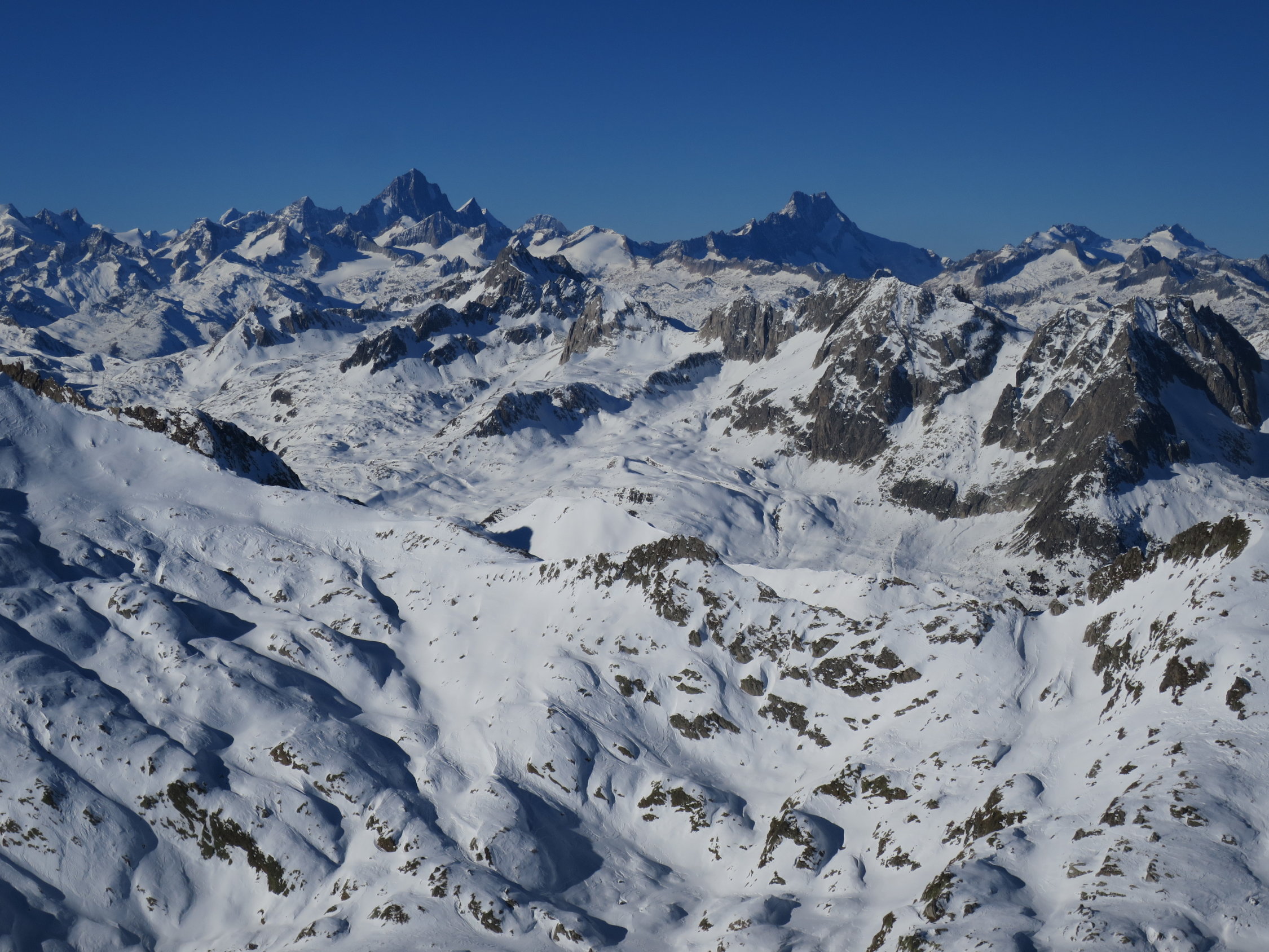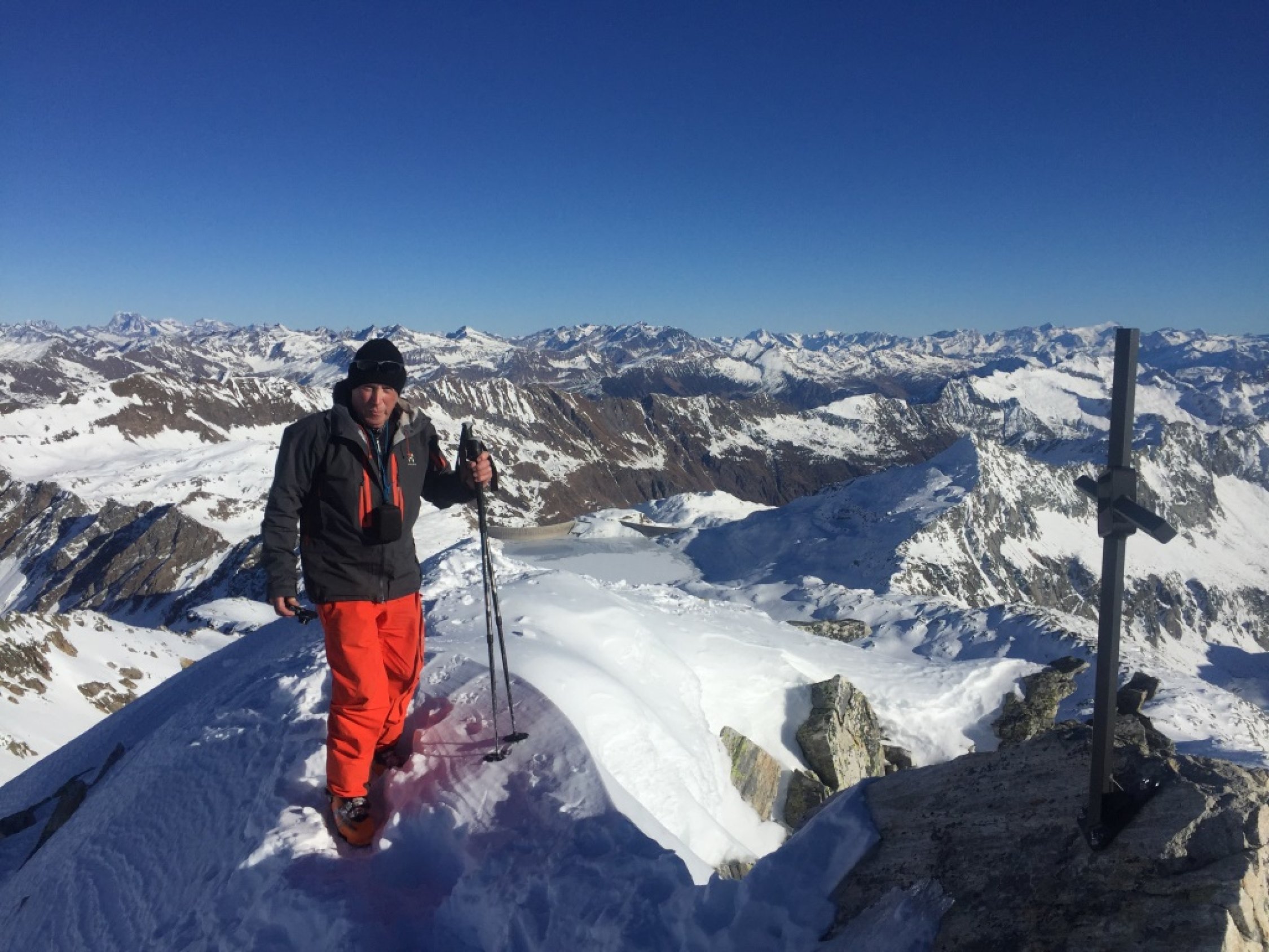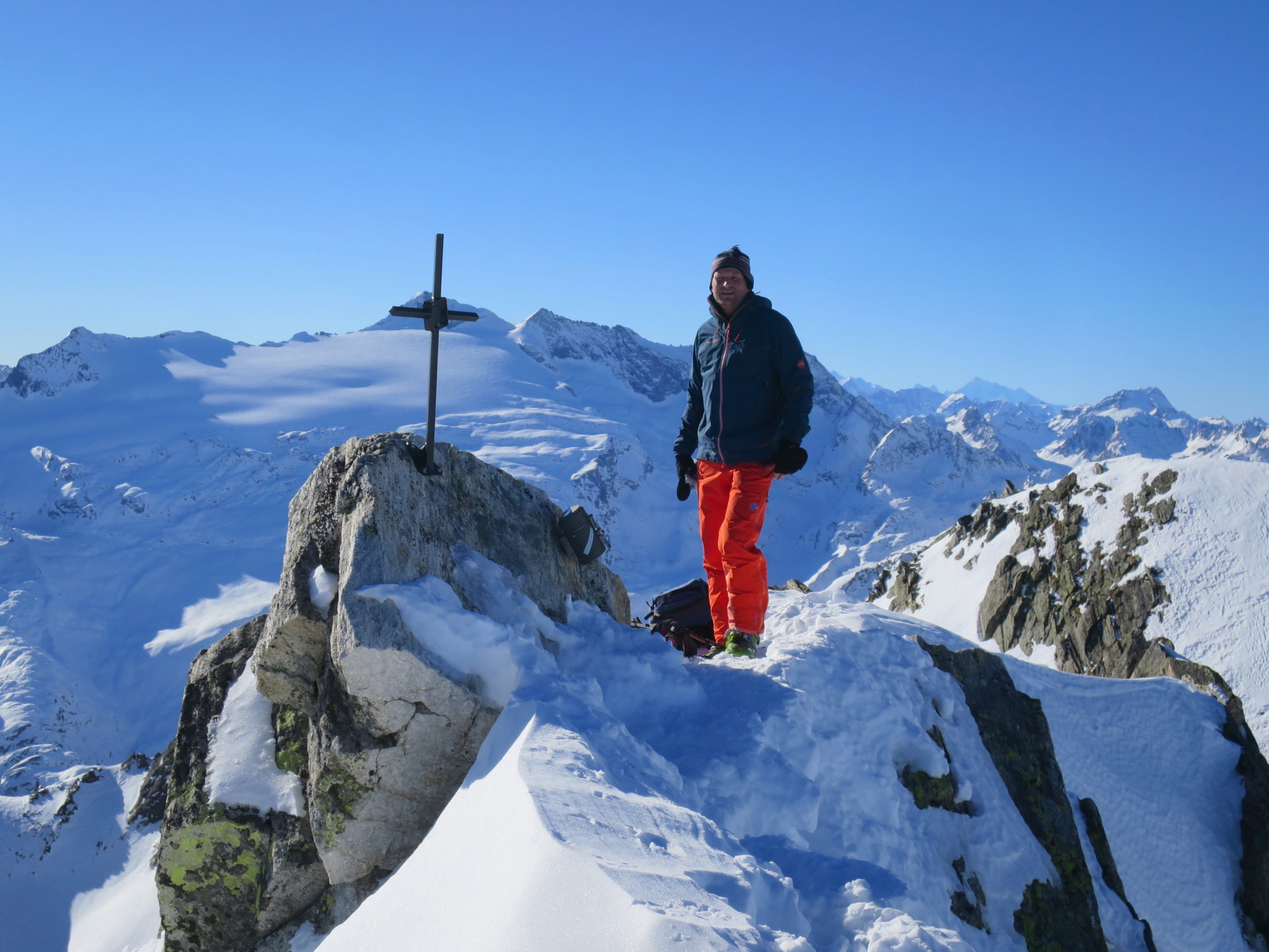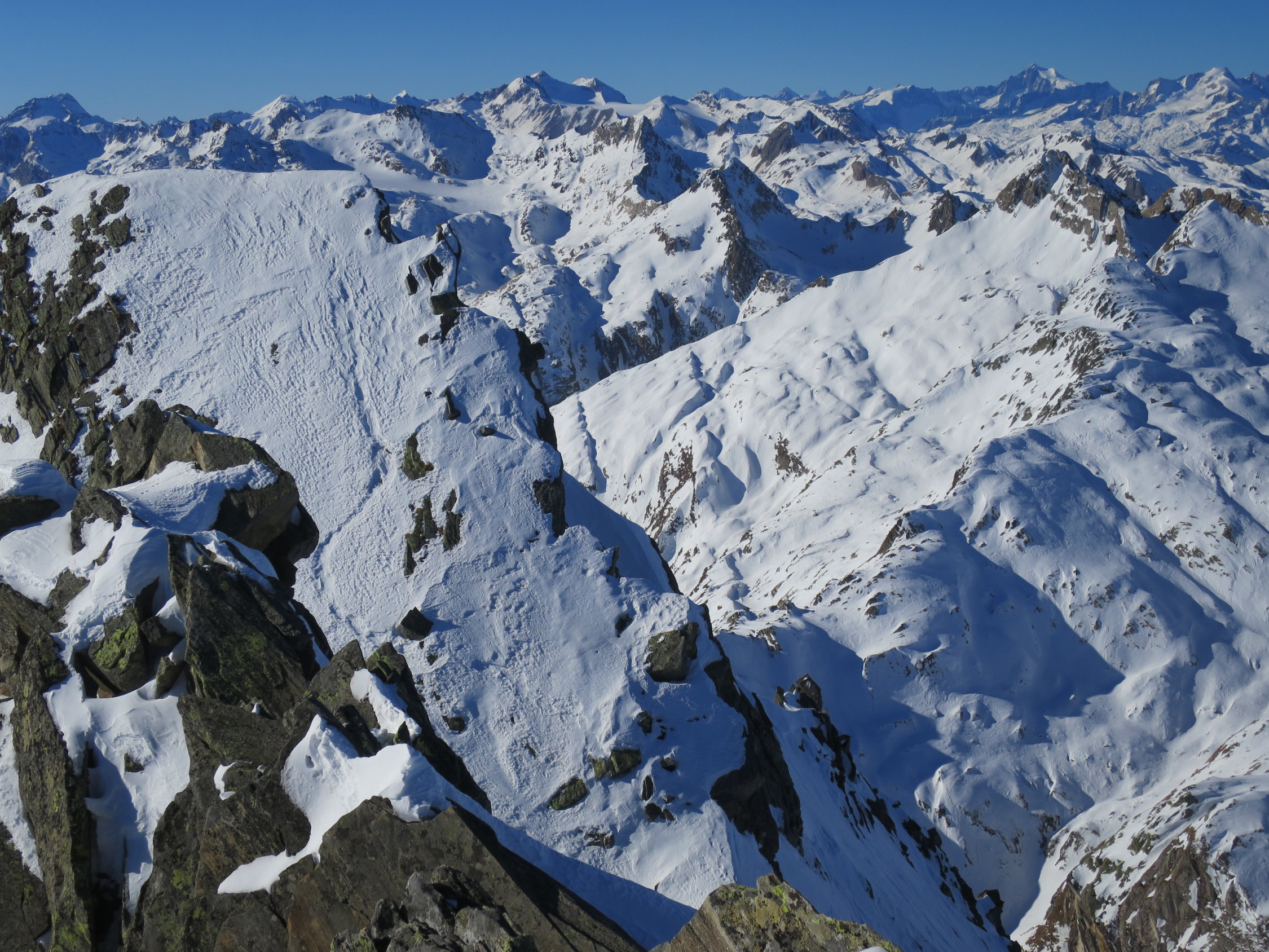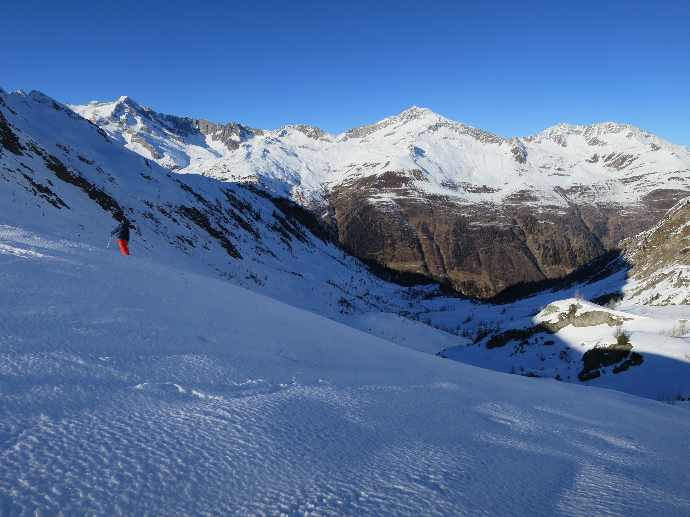 Start der Tour in Ossasco um 07.30 Uhr. Skis auf den Rucksack geschnallt, per Pedes durch den Lärchenwald bis zur ersten Lichtung bei ca.1750m, ab da geschlossene Schneedecke. Durch die Alpe di Cristallina, an der rechten Seite des Rio di Cristallina entlang, ins Val Torta. Über kupiertes Gelände und stark vom Wind geprägtem Schnee zum Passo di Cristallina hinauf. Den Schräghang (Nicht immer sicher) an den Fuß zur Cristallina traversiert. Auf einer verblasenen Spur bis zu den Steinen unter dem Grat, dort Skidepot eingerichtet. Zu Fuss, in etwas seifrigem Trittschnee zum Cristallina Gipfel, von dort das gewaltige Panorama in alle Himmelsrichtungen genossen. Abfahrt zurück zur Capanna Cristallina auf Hartschnee in der Querung schon leicht aufgesulzt. Kurzer Trinkstopp in der Hütte, dann auf einem Schneemix von hart, decklig bis pulvrig durchs Val Torta und der Alpe di Cristallina zum Lärchenwald zurück. Der Fussabstieg nach Ossasco forderte noch einmal volle Konzertation, da auf dem Weglein immer wieder Blankeisstellen.