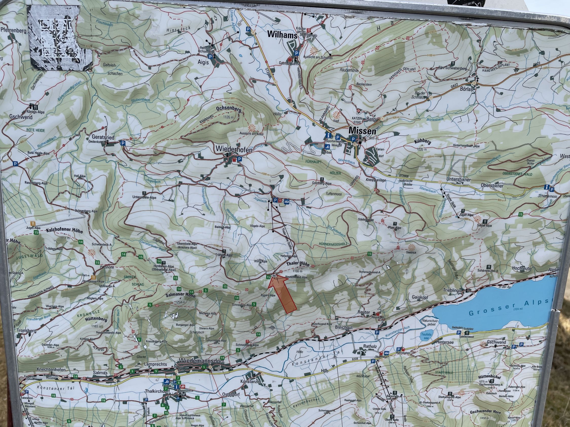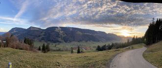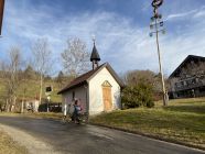 Ich hatte nicht gewusst, dass es vor letzter Kehre des Teersträßchens unterhalb der Hohenschwandalpe links einen kleinen Wanderparkplatz gibt. Dieser ist weder in der AV-Karte, in der topographischen Karte, noch im digitalen Bayernatlas eingezeichnet und erkennt man auch nicht auf dem Satellitenbild von GoogleMaps. Ich sah das Verkehrszeichen für den Wanderparkplatz erst im Abstieg. Darum deponierte ich für den Rückweg mein E-Mini-Bike an der Marienkapelle beim Reuterhof und nicht viel weiter oberhalb bei diesem Wanderparkplatz. Von Kapelle Hl. Maria (P 798) dann mit dem Radl die 6 km zurück über geteerte Sträßchen nach Salmas. Die Aufstiegsmeter zur Salmaser Höhe sind 500 Hm. Die restlichen Hm kommen kumulativ zusammen.