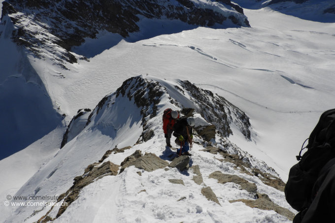 Unten in den Felsen bis nach dem Regenmesser sehr wenig Schnee, Felsen trocken. Wenn man sich hier direkt auf dem Grat ähnlichen Teilstück hält kann man ohne Steigeisen klettern, herrlich. Oberhalb vom Regenmesser haben wir die Steigeisen montiert ab da Schnee gute Verhältnisse. Bei den Stangen hart aber schöne Tritte. Der Gipfelfirngrat ziemlich schmal, fast auf dem ganzen Firngrat muss ein Schuh vor dem anderen gesetzt werden, Tritte vorhanden, ein paar Tritte sind ziemlich schmal und guckt etwas Eis hervor.